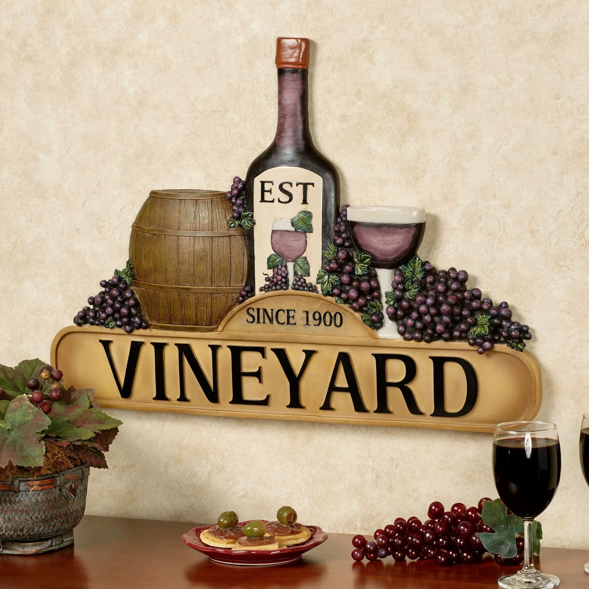 Established since 1900, the Tuscany Vineyard has been a classic institution known for fantastic vintages, delighting fine wine connoisseurs with a robust red made from only the most plump purple grapes. Bring a touch of this wine artistry to your decor with this perfectly themed resin wall plaque, complete with a detailed wine barrel, glass and bottle of the perfect red wine, ample grape bunches, and a large identifying vineyard plaque. Measures 24"Wx1.5"Dx17"H.