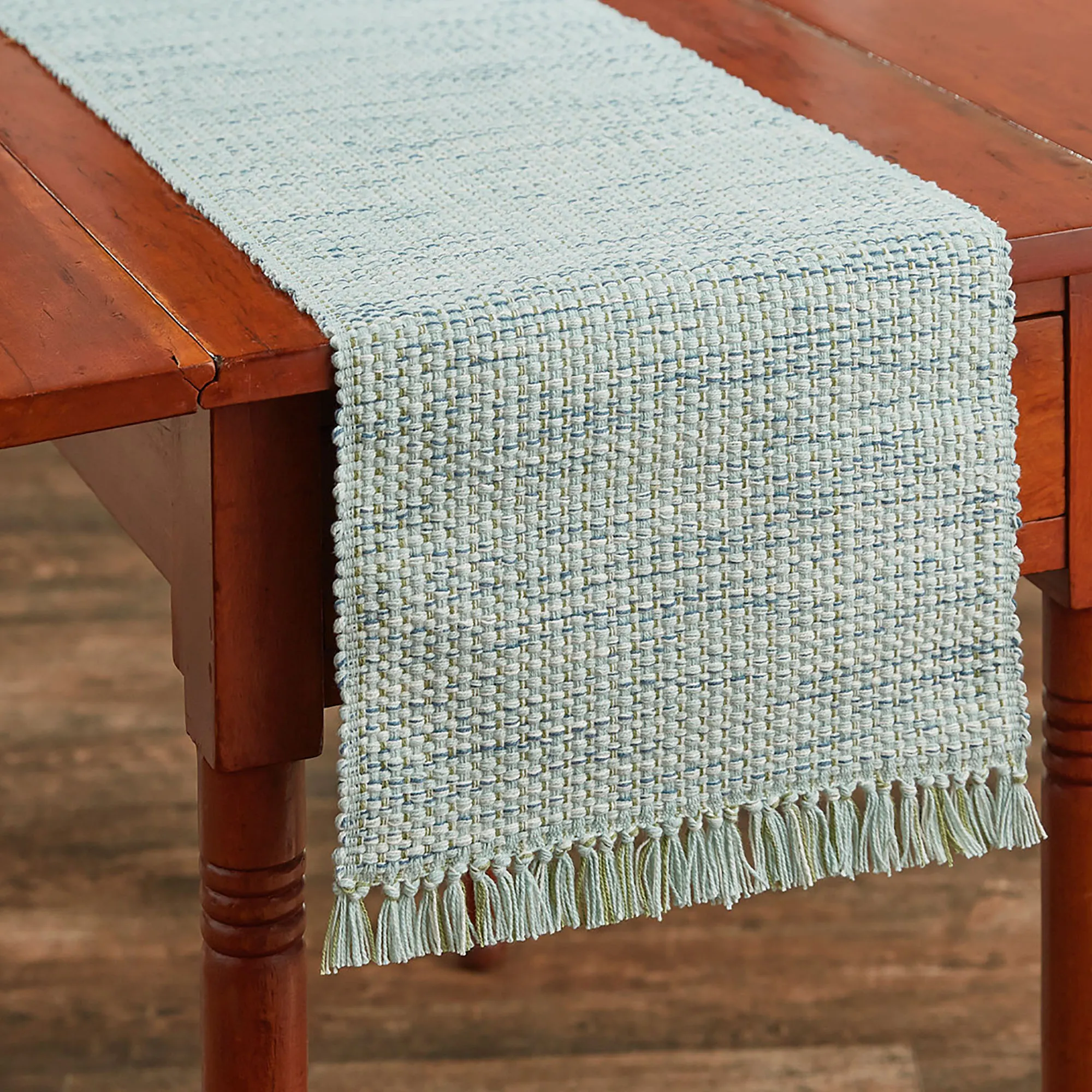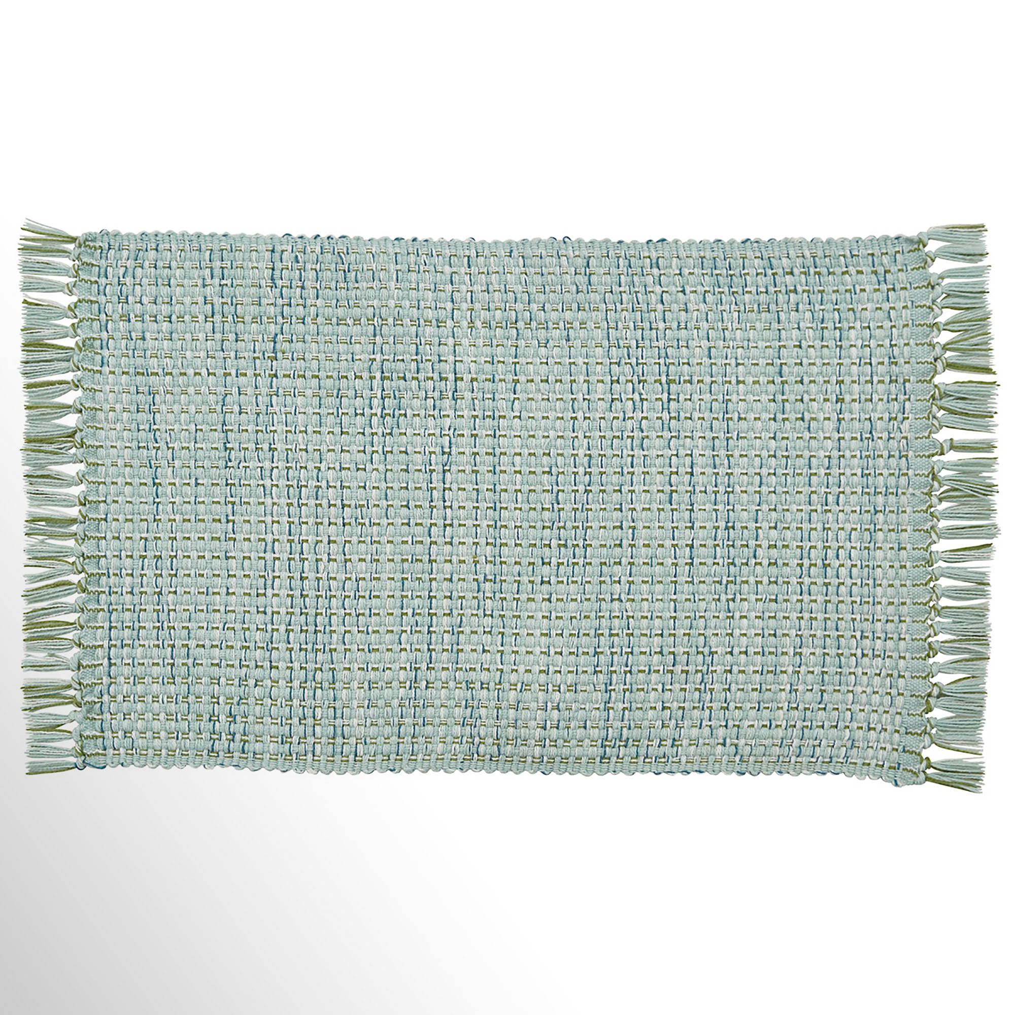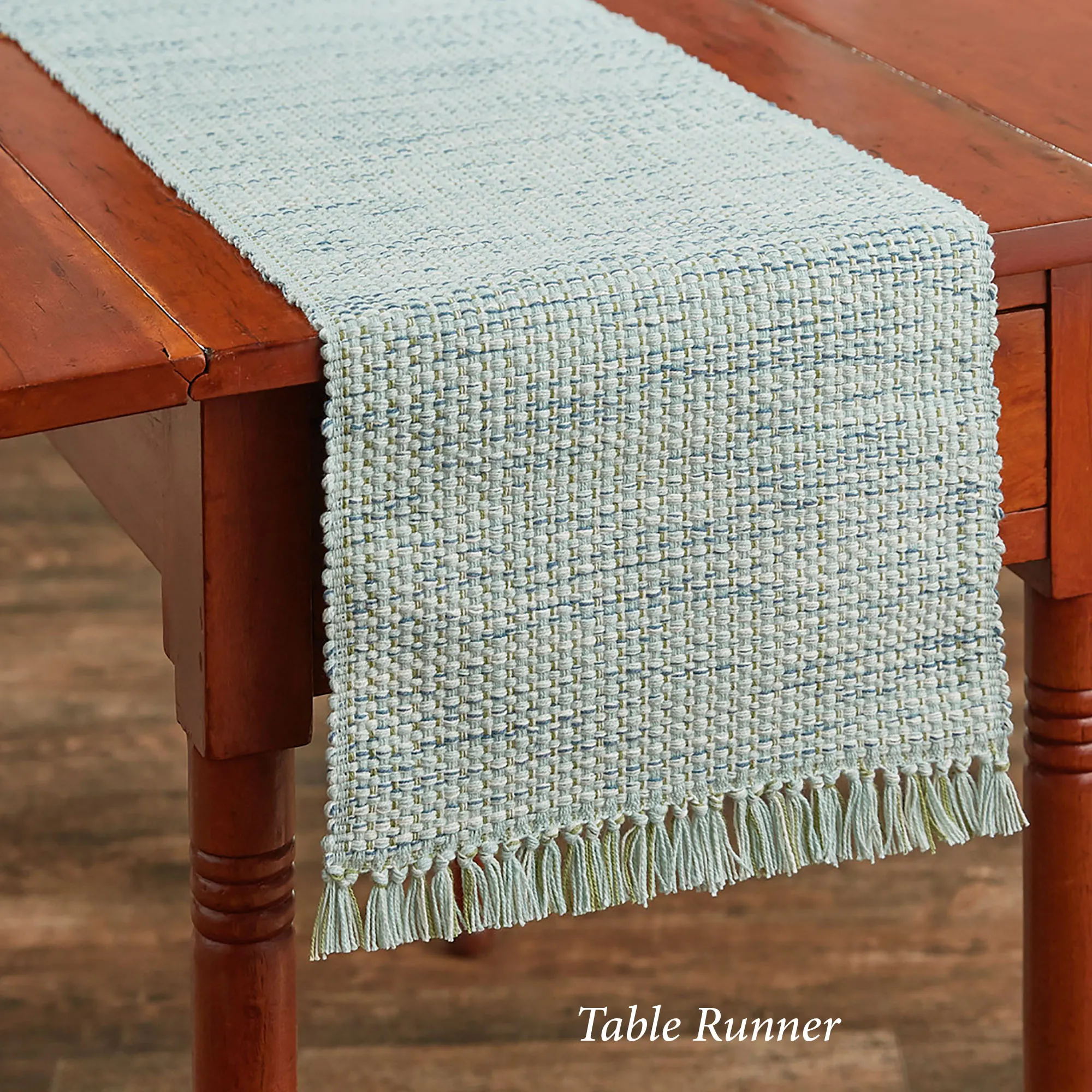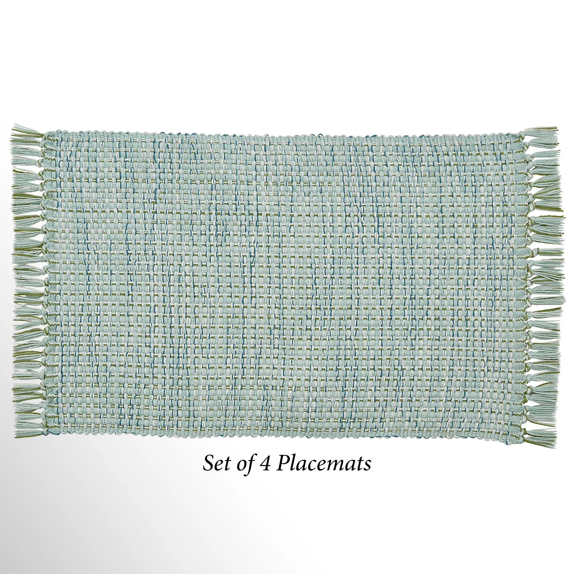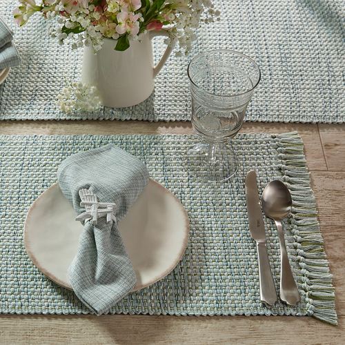 The Tweed Basics Blue Table Linens add a bit of texture to your table. These woven cotton tweed table accents have fringed ends. The blue coloration includes light blue, white, and hints of dark blue. Table Runner is 13"x54". Placemats are 19"x13" each and sold in a set of four. Machine washable. Imported.