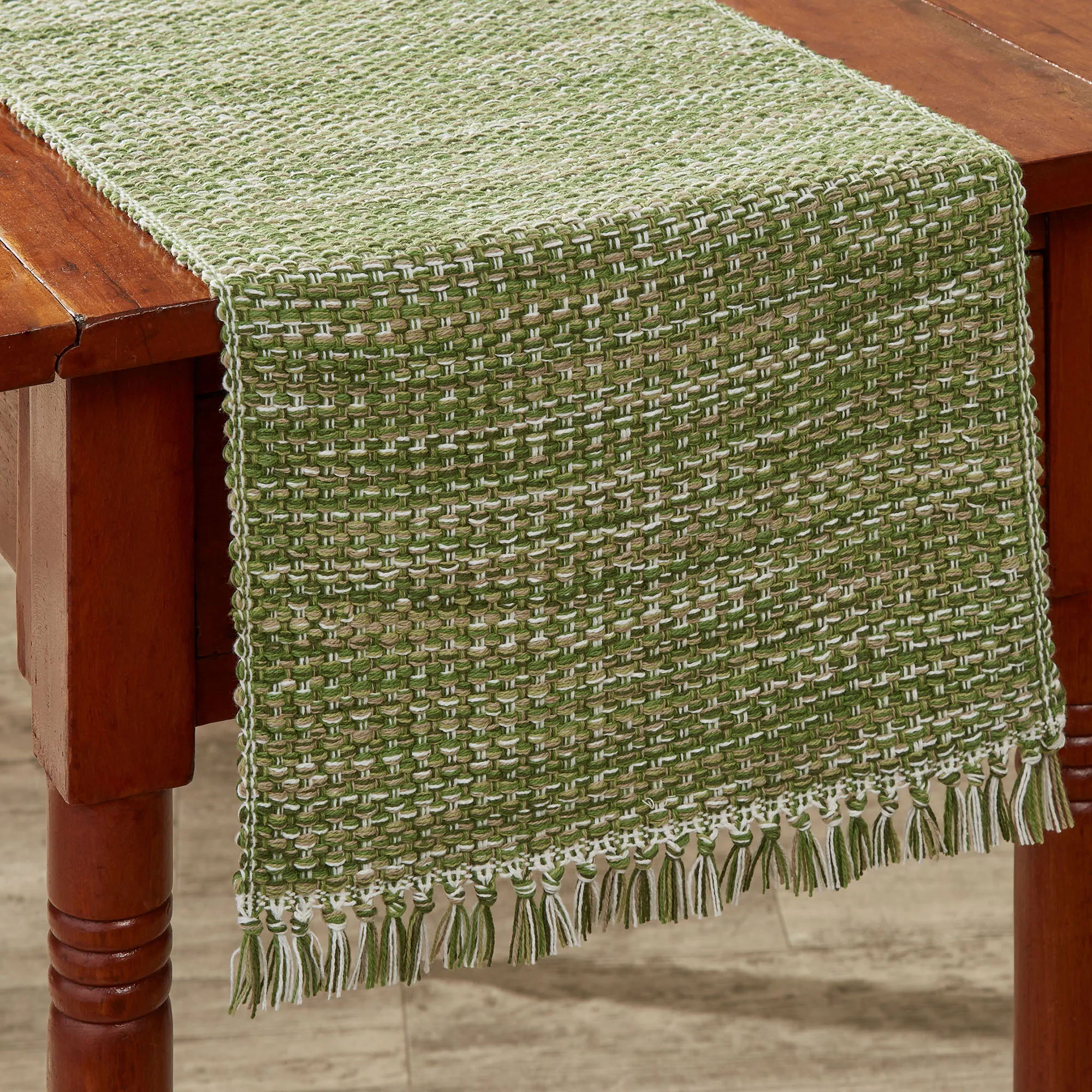 The Tweed Basics Dark Green Table Linens add a bit of texture to your table. These woven cotton tweed table accents have fringed ends. The dark green coloration has gold, ivory, and sage hues. Table Runner is 13"x54". Placemats are 19"x13" each and sold in a set of four. Machine washable. Imported.