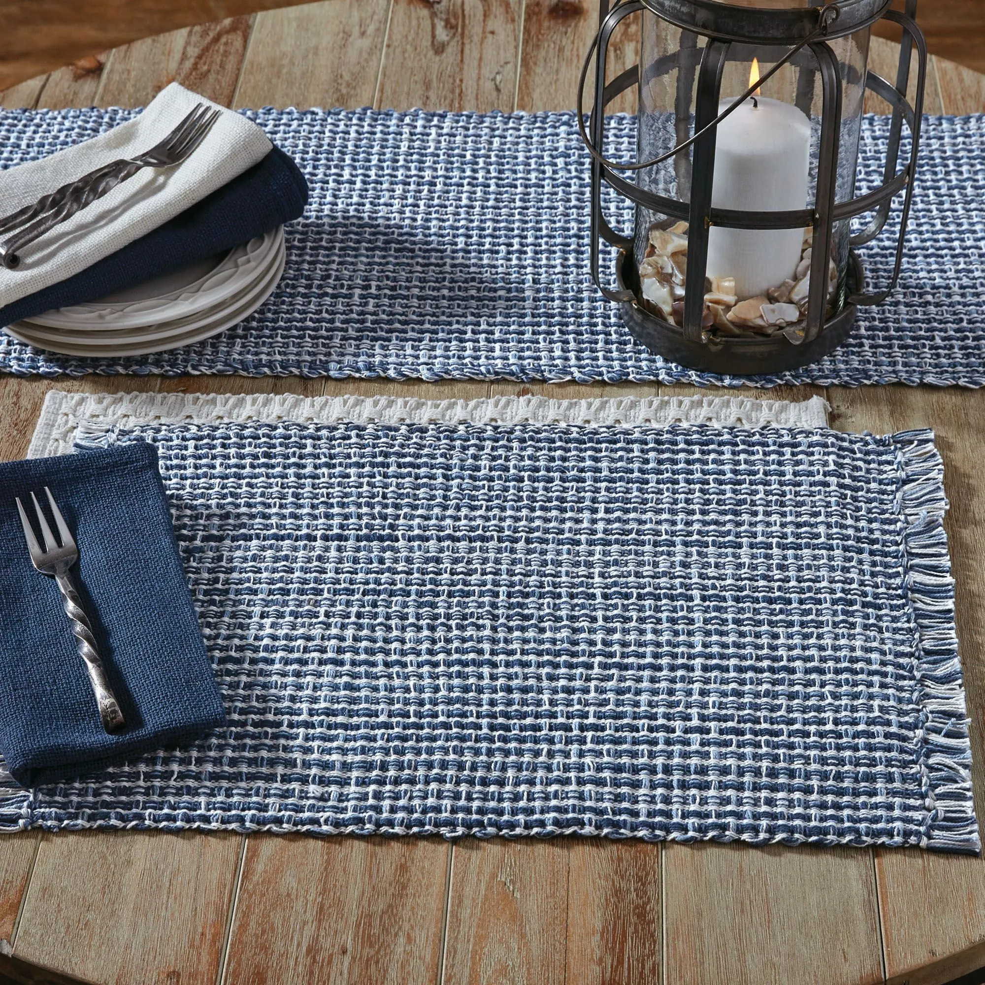 The Tweed Basics Denim Blue-Hued Table Linens add a bit of texture to your table. These woven cotton tweed table accents have fringed ends. The denim coloration is dark and light blue with white. Table Runner is 13"x54". Placemats are 19"x13" each and sold in a set of four. Machine washable. Imported.