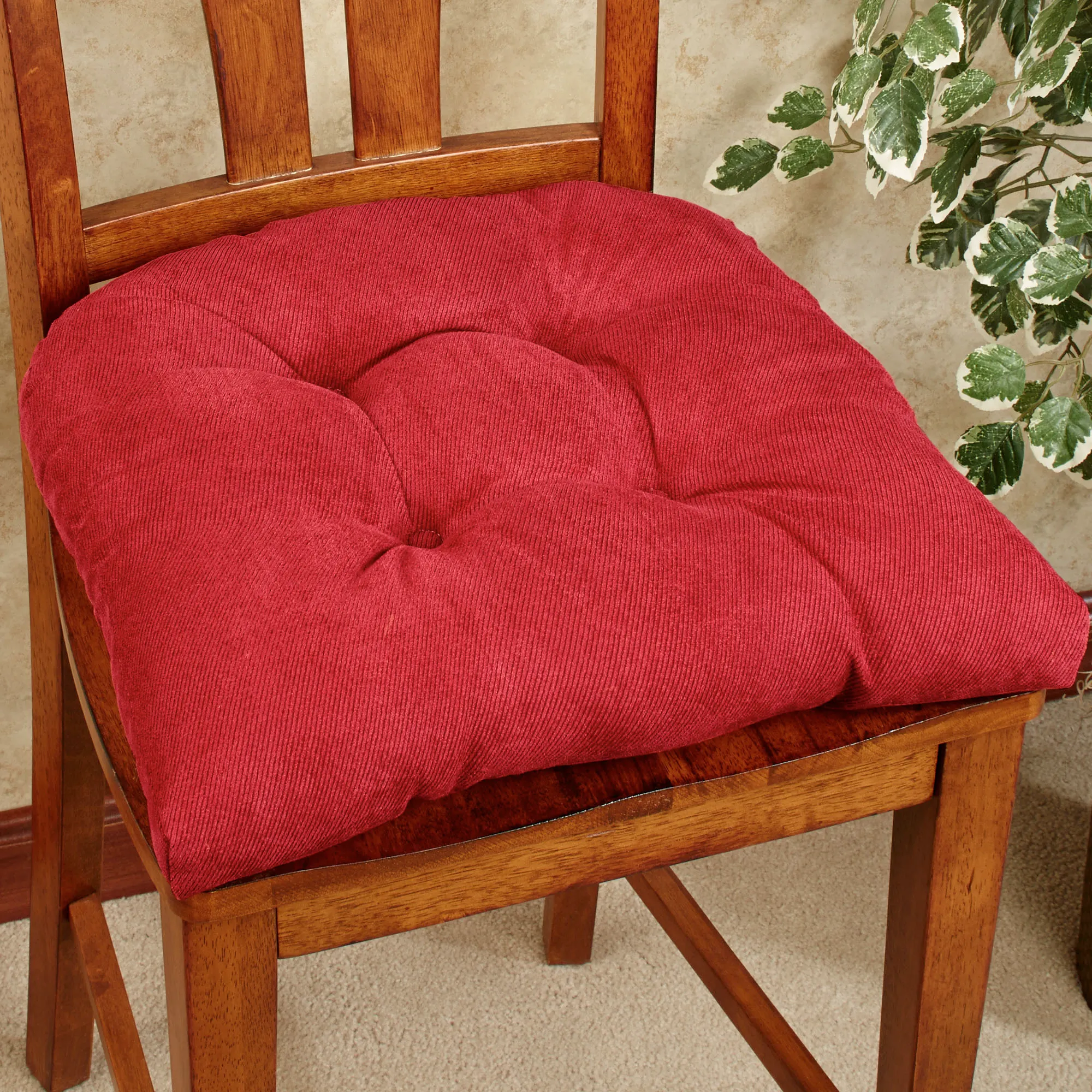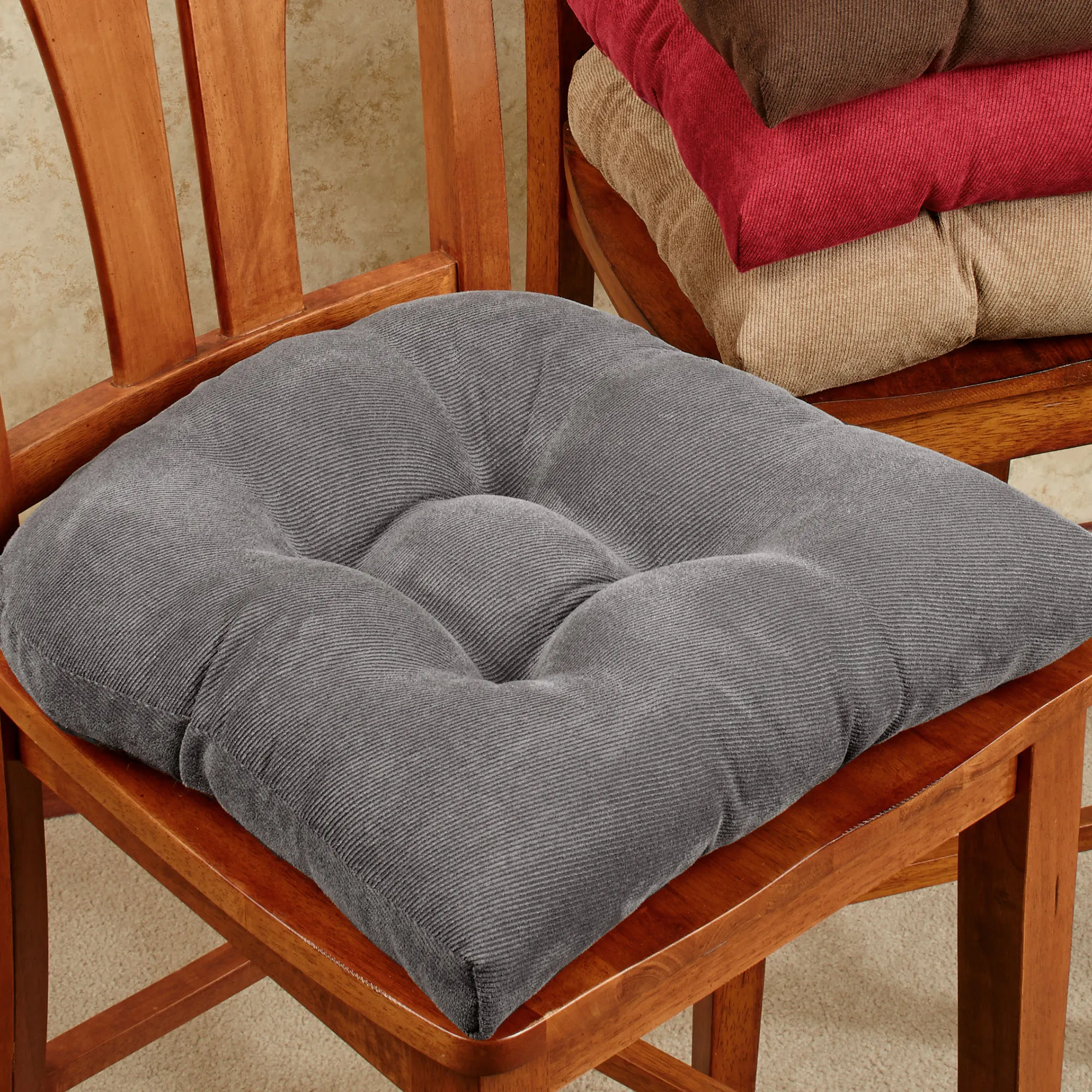 Update the look of your chairs with the Twillo Chair Cushion Set. These polyester, button-tufted chair cushions are a solid color and have The Gripper(R) slip-resistant latex foam and polyester backing that keeps them in place without ties. Fill is polyester. Each chair cushion is 18"sq.x3"H; sold as a two-piece set. Spot clean.