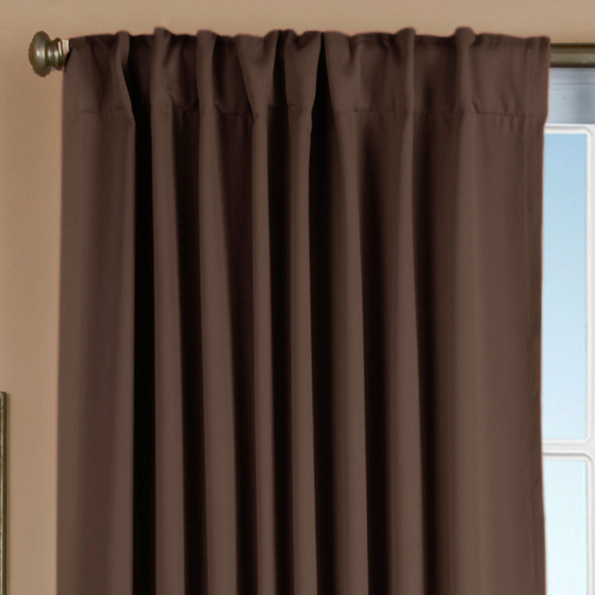 Accent your space with the subtle style and major convenience of the Ultimate Blackout Back Tab Curtain Panel. Woven with a special layered design that sandwiches black yarn between a tight weave of colored yarns, each polyester window panel features a thick fabric that blocks light and drafts, helps maintain room temperature, and hangs via the 4" rod pocket or hidden back tabs. Specify Latte, Chocolate, Dark Gray, Garnet, Ivory, Midnight Blue, Natural, or Sage. Sold individually, each curtain panel is 56"W. Machine washable. Imported.