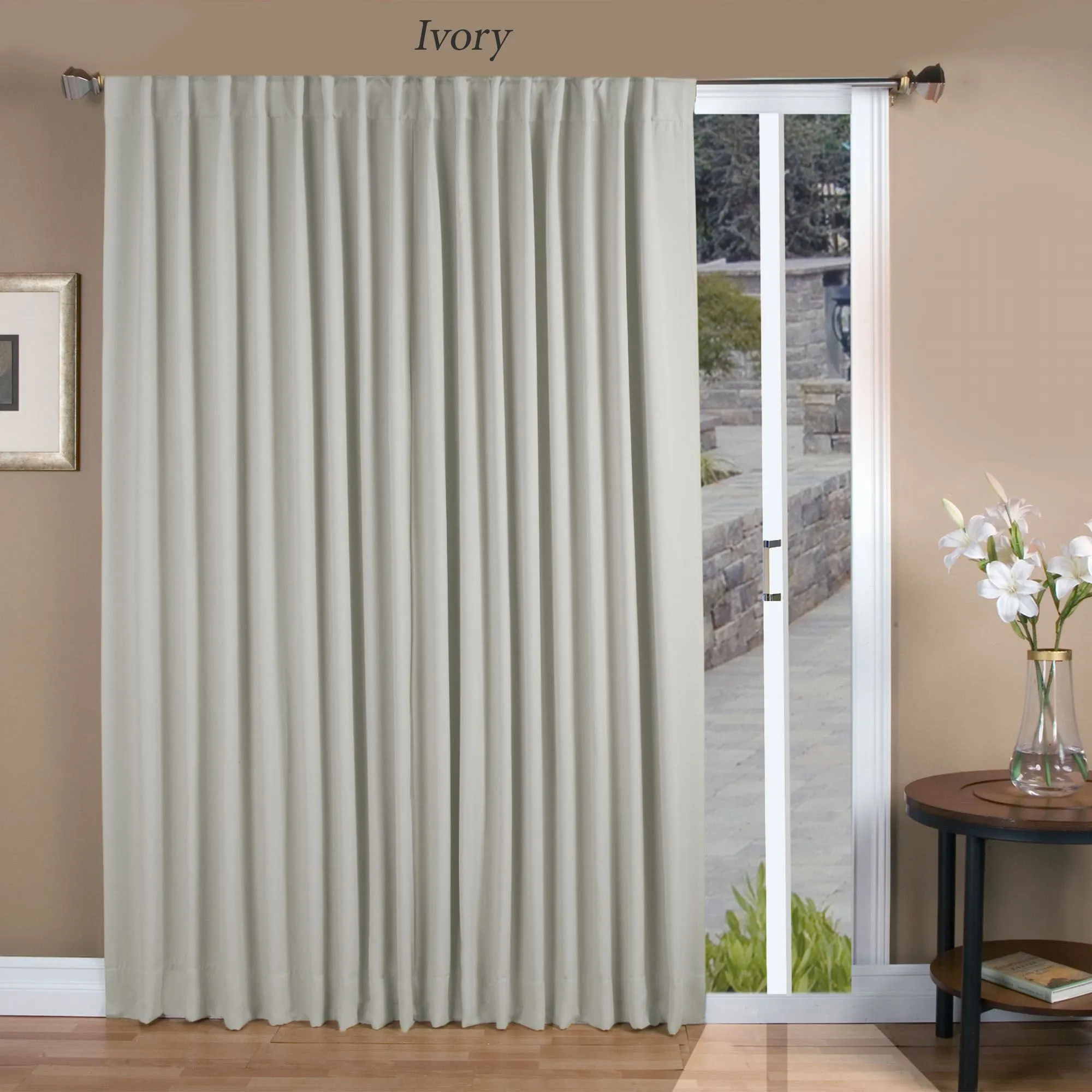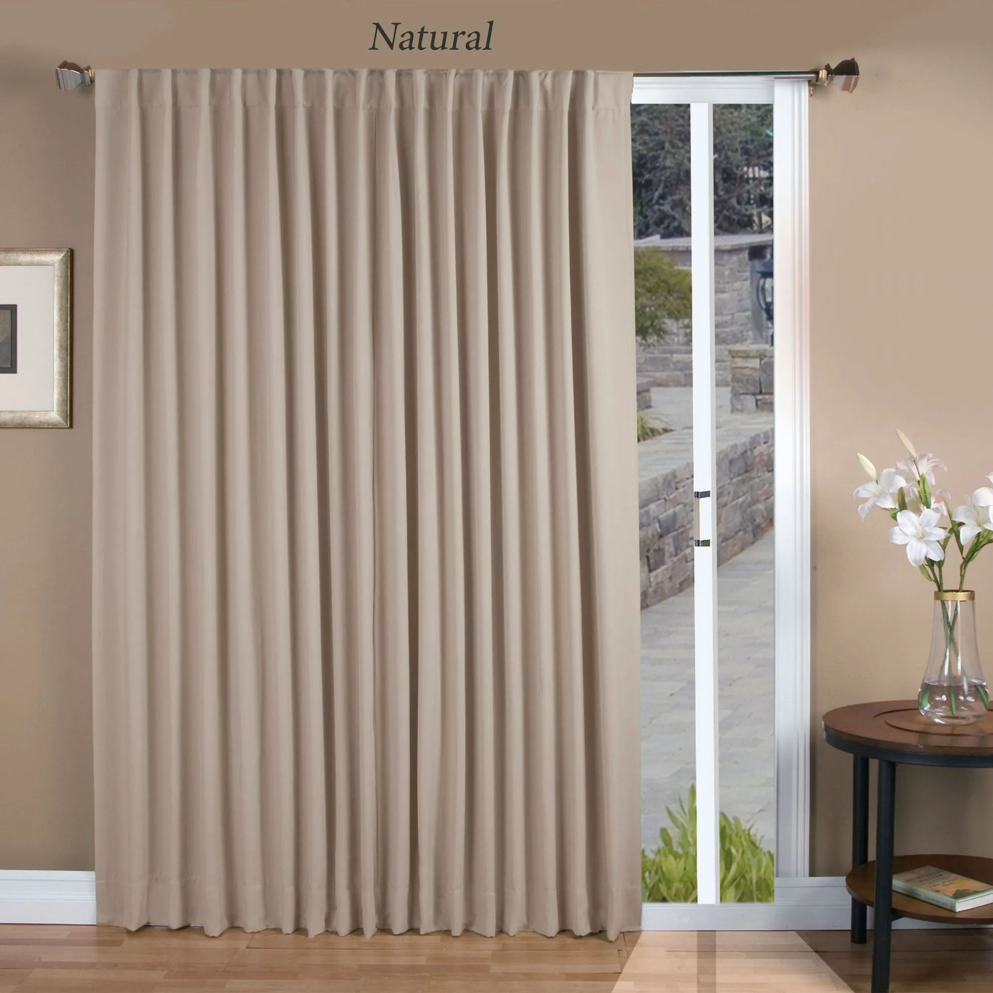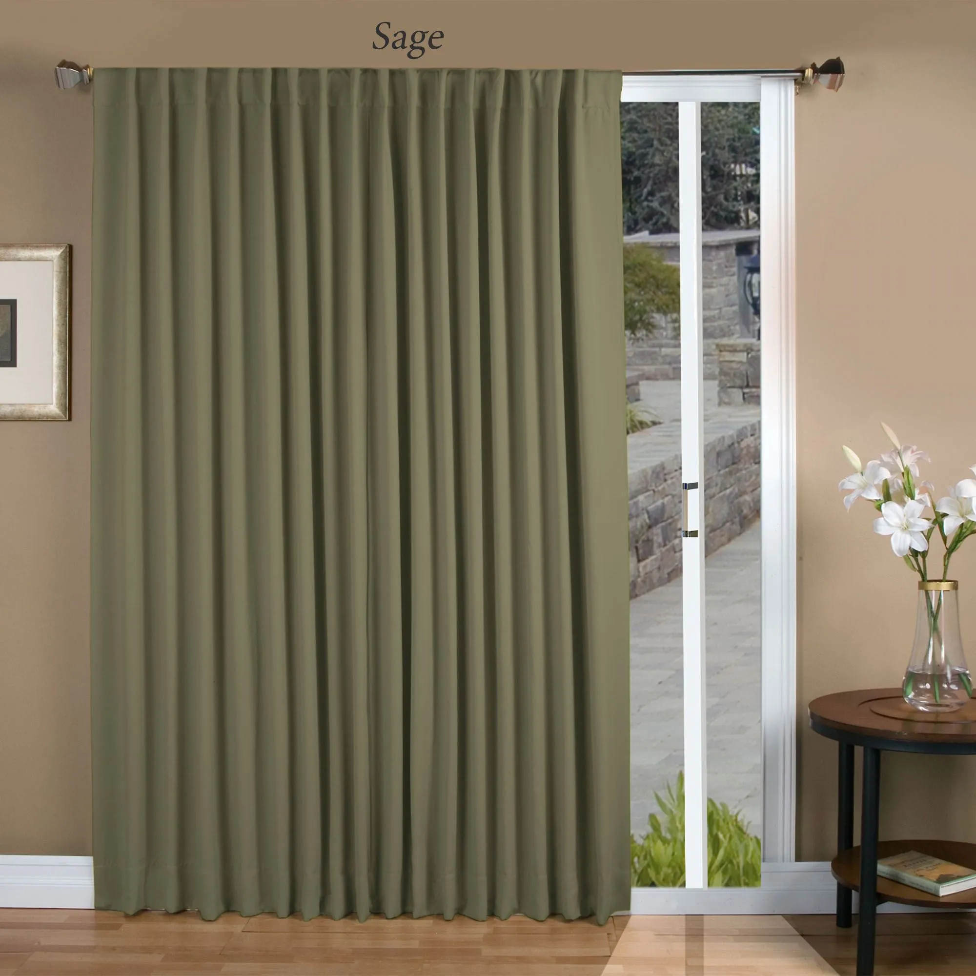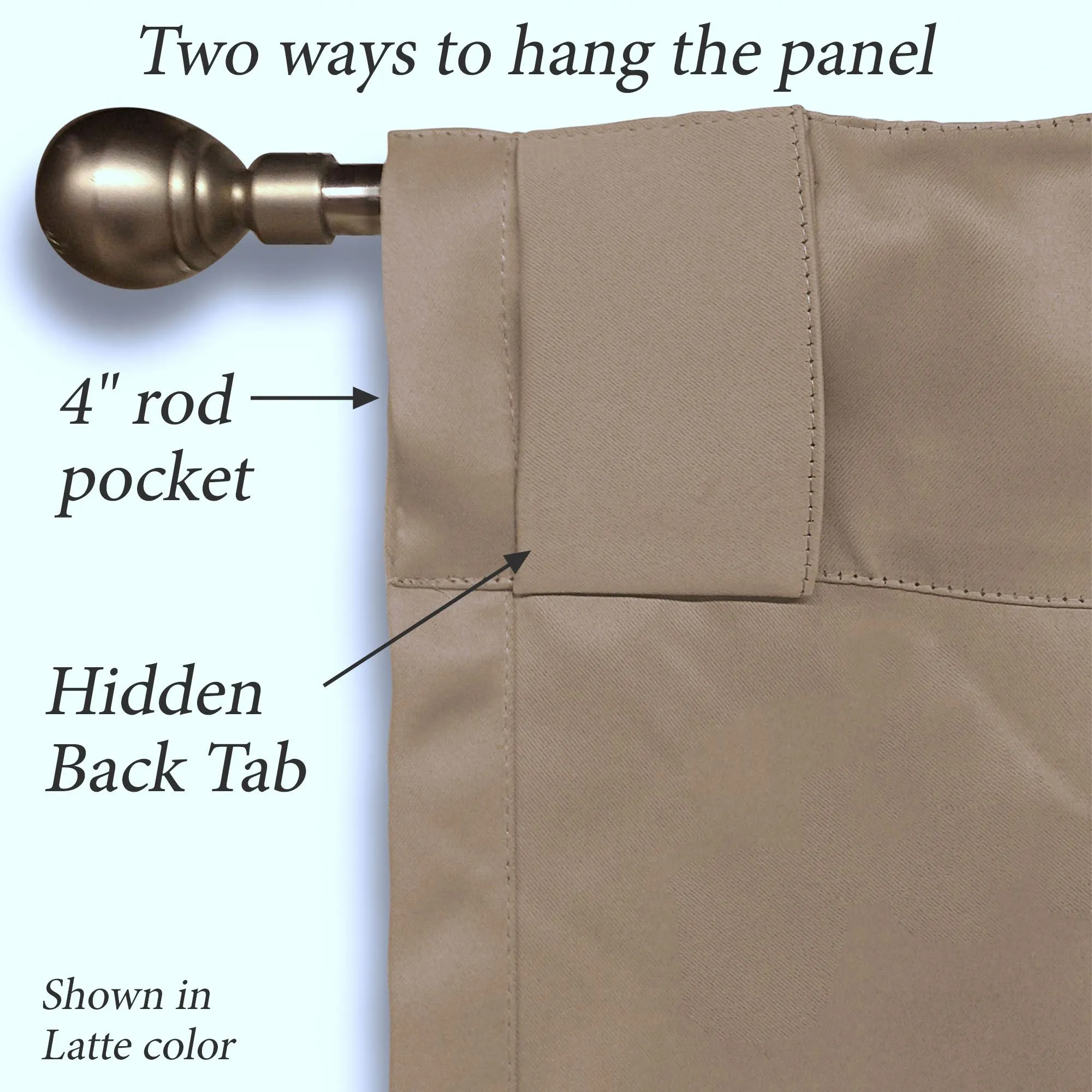 Accent your space with the subtle style and major convenience of the Ultimate Blackout Back Tab Patio Panel. Woven with a special layered design that sandwiches black yarn between a tight weave of colored yarns, each polyester patio panel features a thick fabric that blocks light and drafts, helps maintain room temperature, and hangs via the 4" rod pocket or hidden back tabs. Specify Dark Gray, Ivory, Latte, Midnight Blue, Natural, or Sage. Patio panel is 112"Wx84"L. Machine washable. Imported.