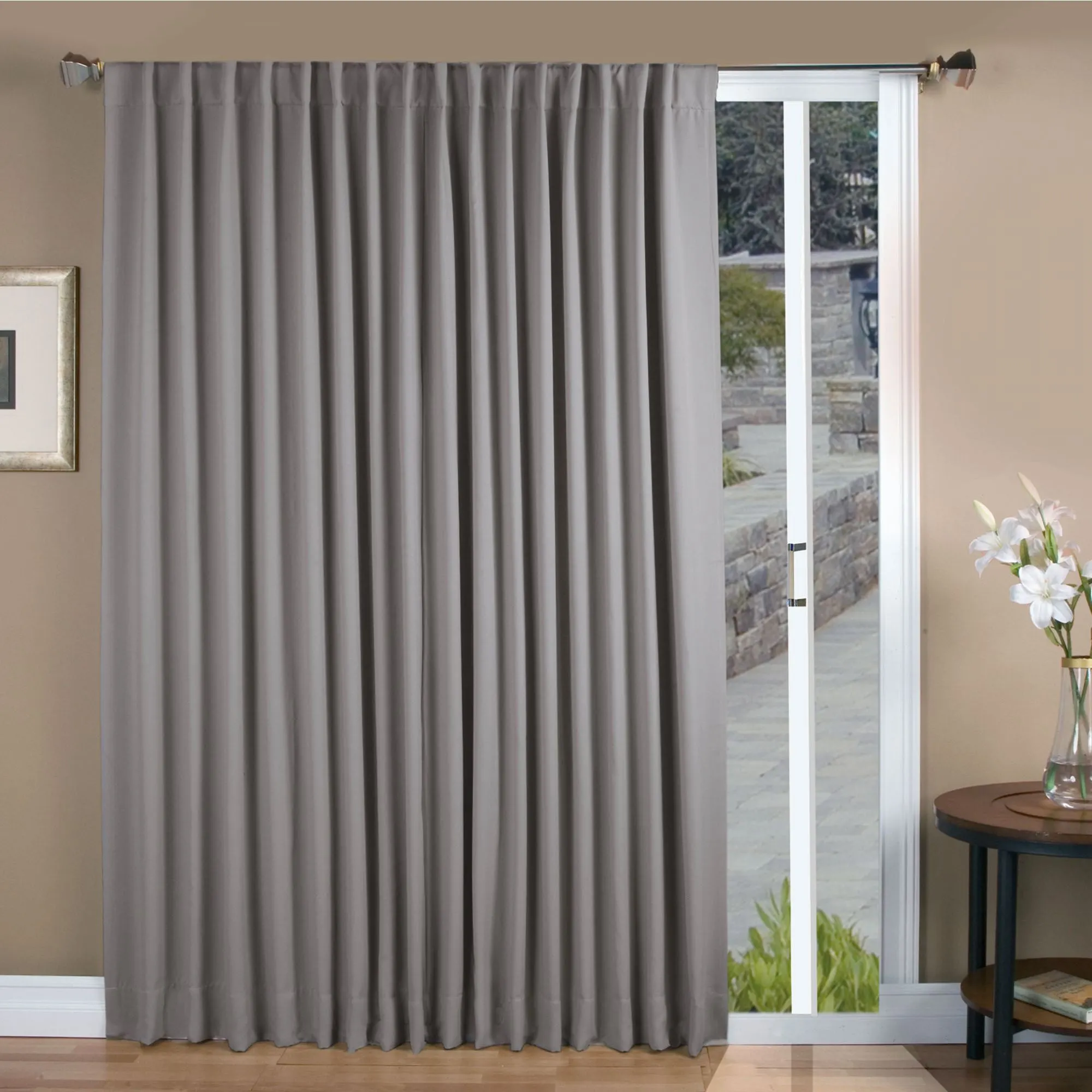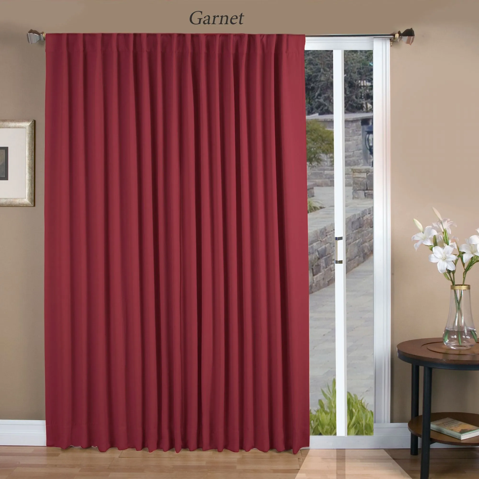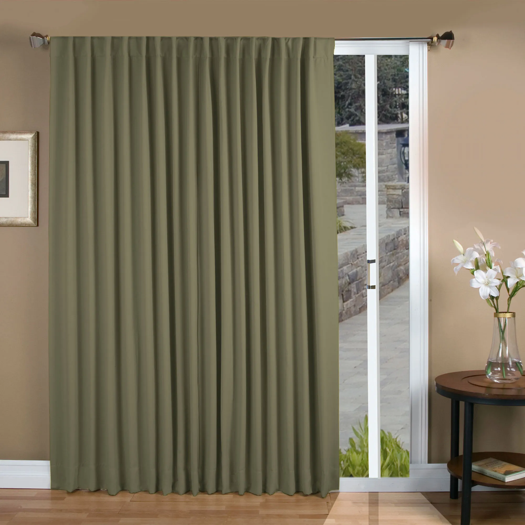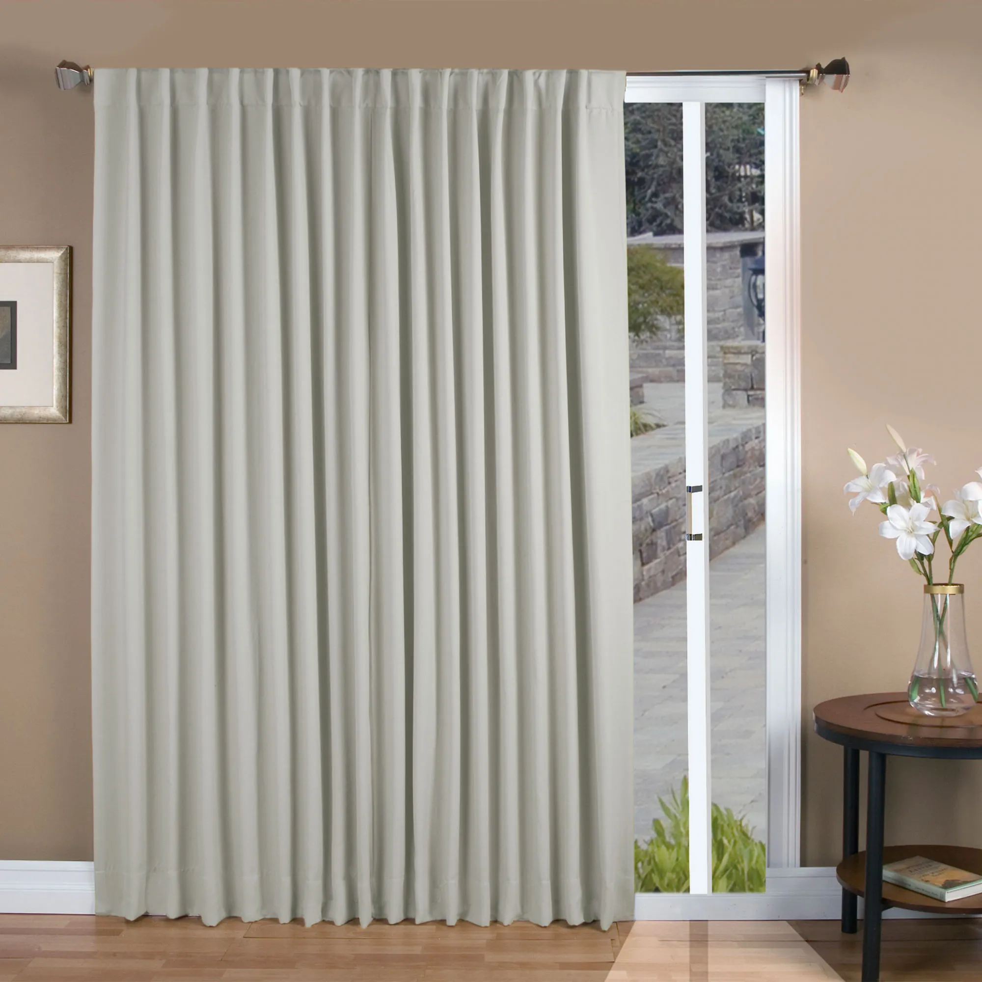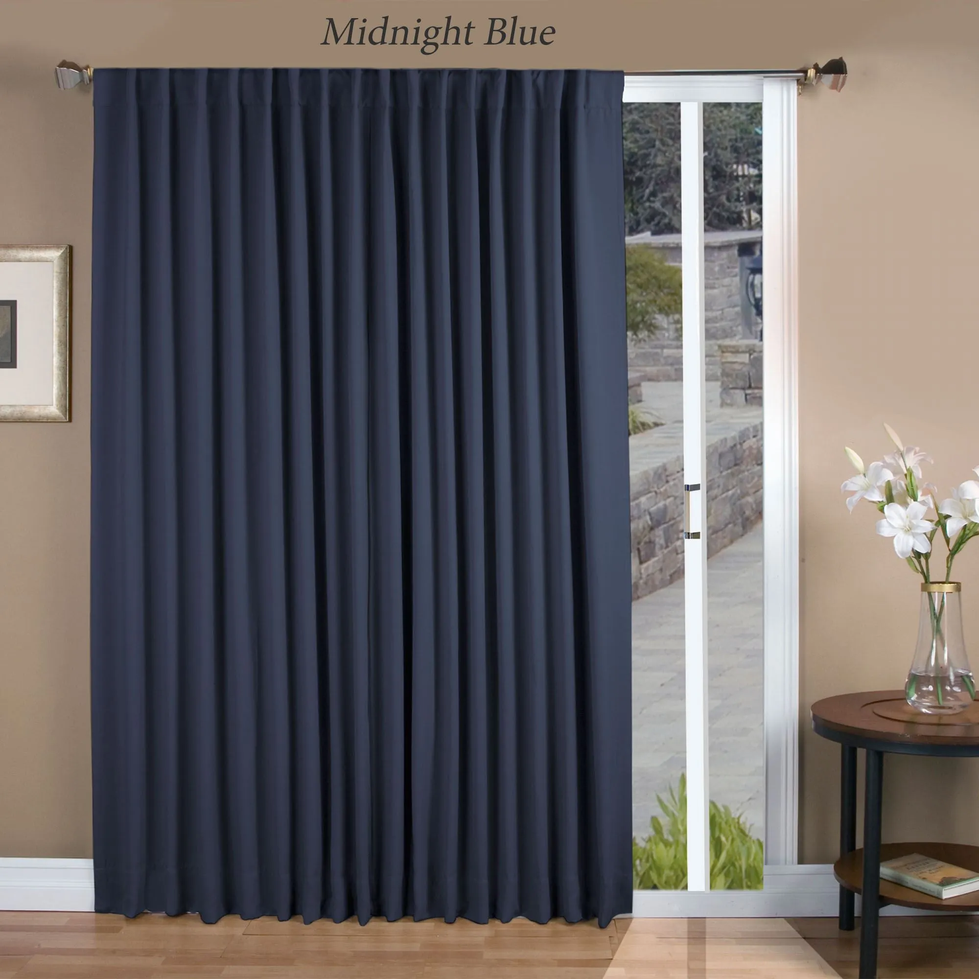 Accent your space with the subtle style and major convenience of the Ultimate Blackout Back Tab Patio Panel. Woven with a special layered design that sandwiches black yarn between a tight weave of colored yarns, each polyester patio panel features a thick fabric that blocks light and drafts, helps maintain room temperature, and hangs via the 4" rod pocket or hidden back tabs. Specify Dark Gray, Ivory, Latte, Midnight Blue, Natural, or Sage. Patio panel is 112"Wx84"L. Machine washable. Imported.