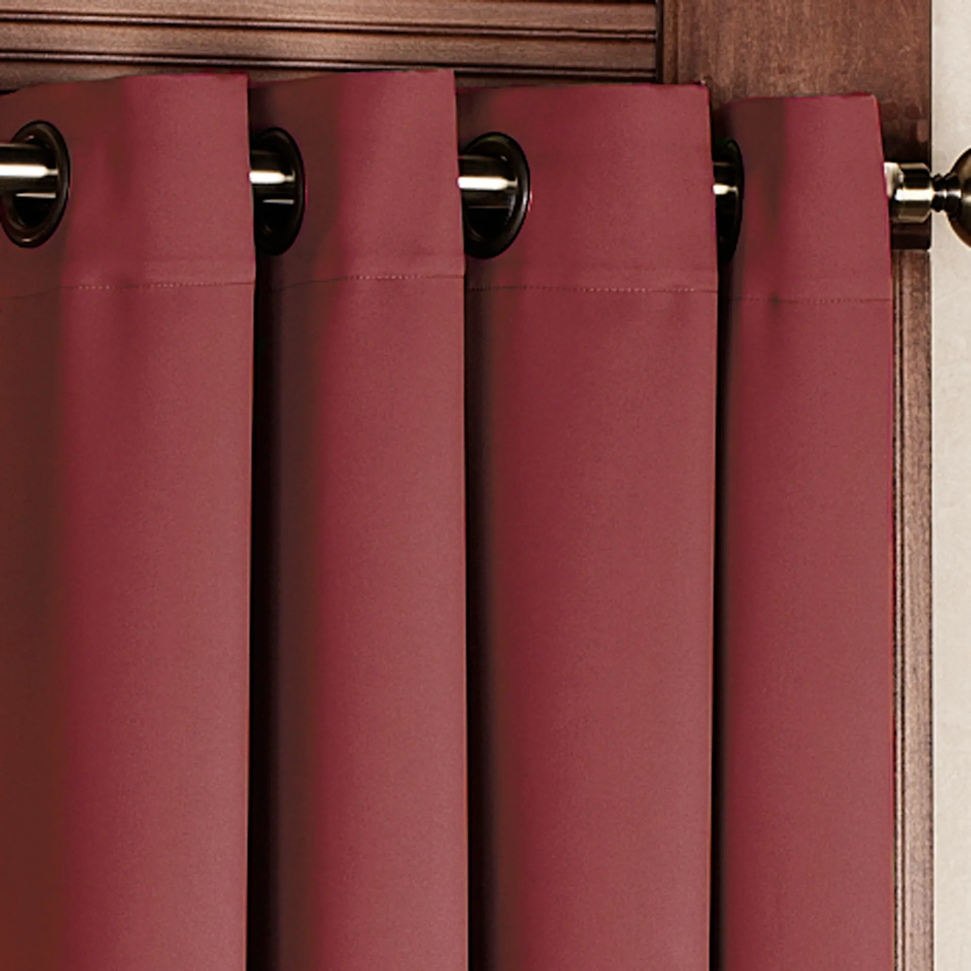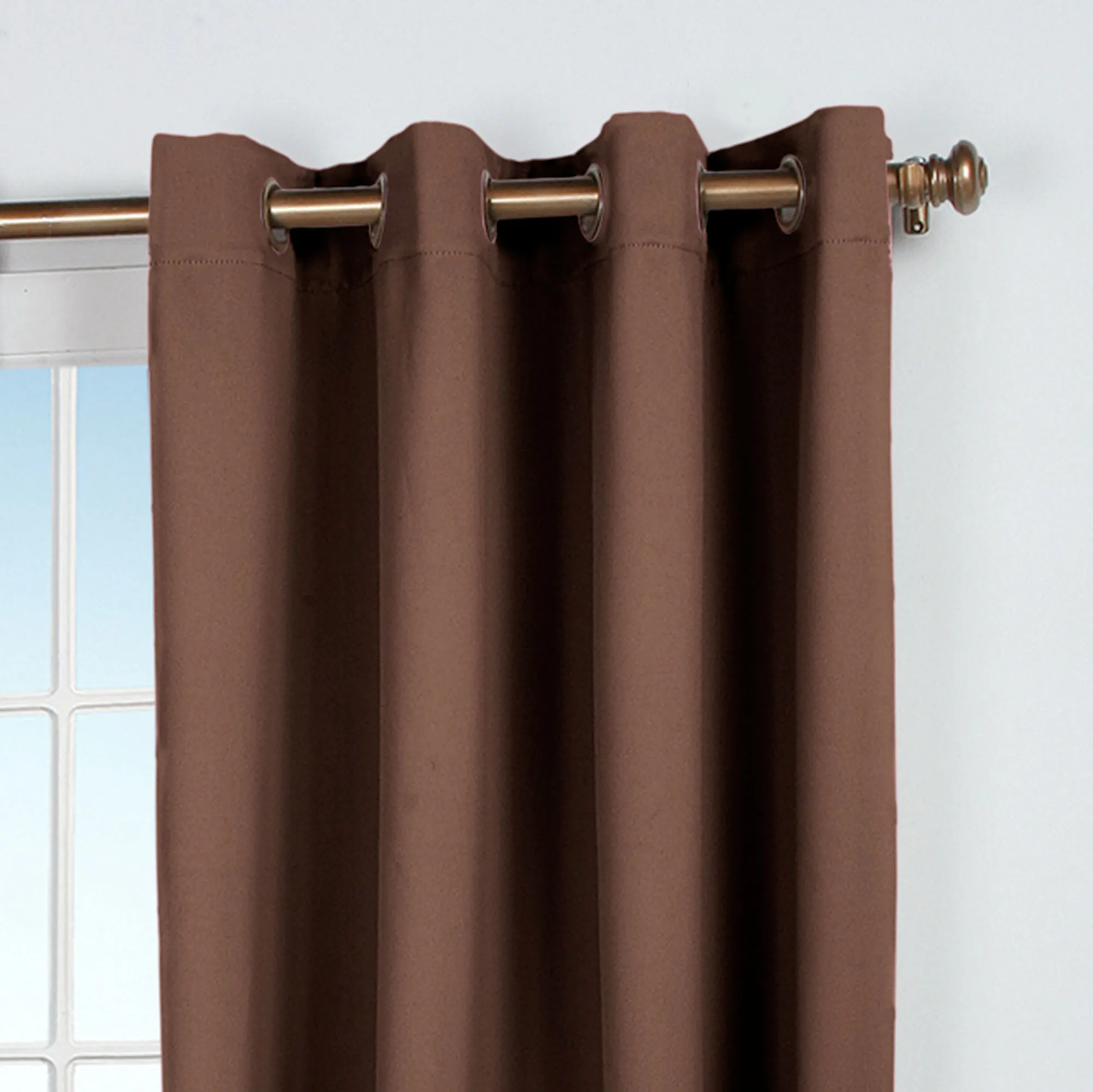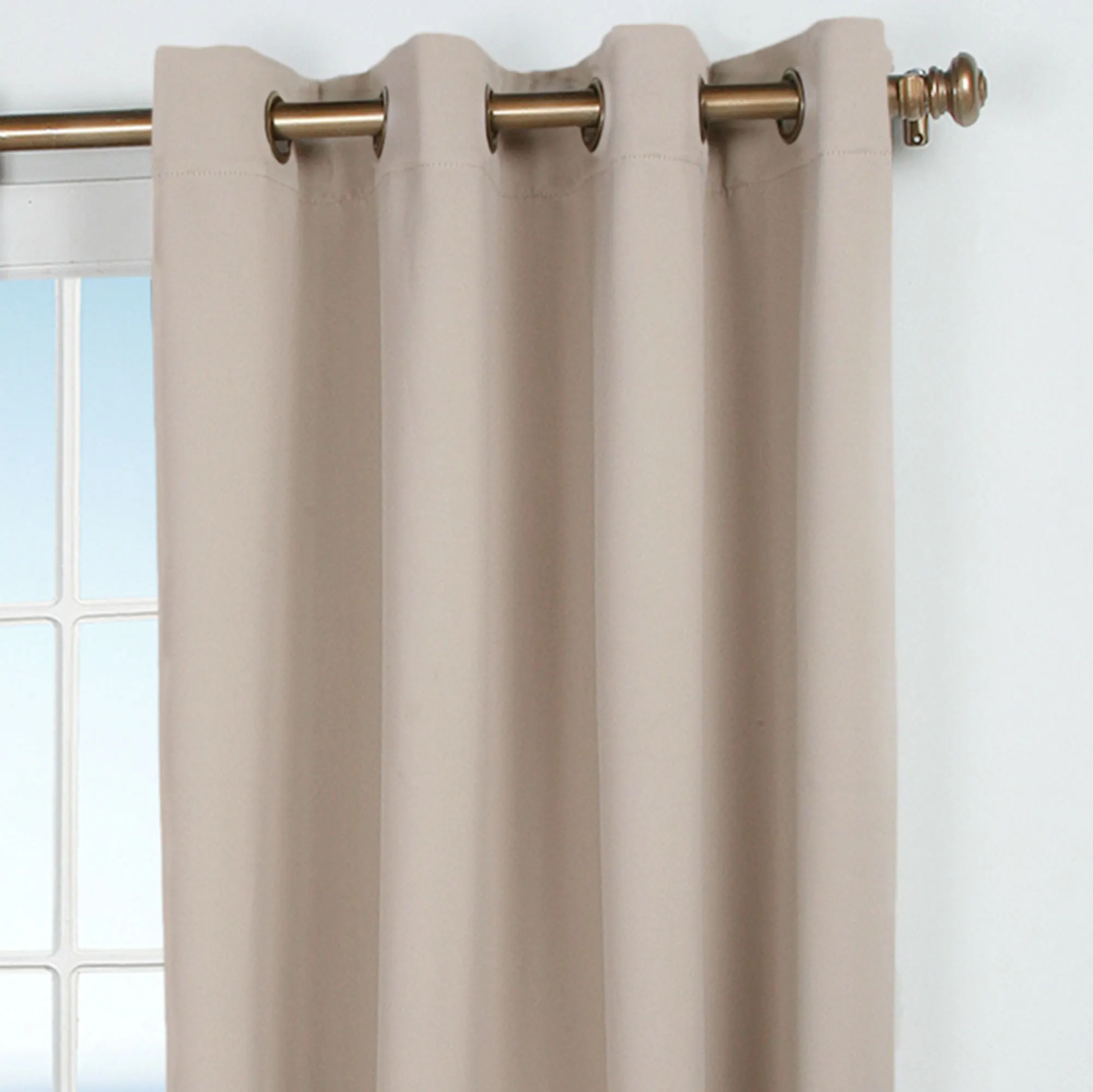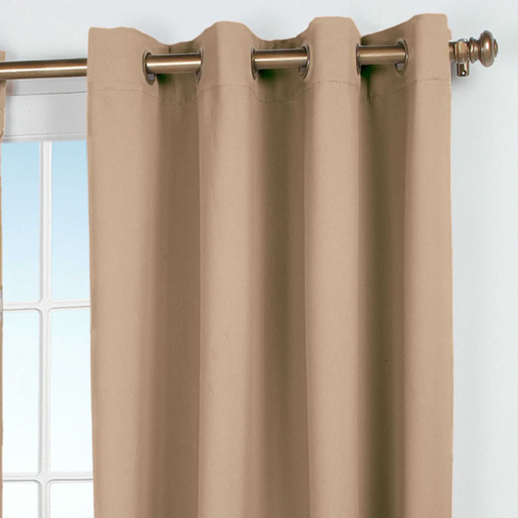 Effectively block out light with the Ultimate Blackout Short Grommet Curtain Panel. Each polyester panel is woven in three layers using a tight weave of colored yarns on the front and the back, sandwiched around an inner layer of black yarns. Panel feels soft and smooth. The thick fabric and density will block drafts and help maintain room temperature. Metal grommets are 1.75" dia. The grommets on Chocolate, Garnet, Latte, Natural, and Sage have an antique brass finish. The grommets on Dark Gray, Ivory, and Midnight have a silver finish. Curtain panels are sold individually; each measures 56"W. Specify Latte, Chocolate, Dark Gray, Garnet, Ivory, Midnight, Natural, or Sage. Machine washable; follow manufacturer's instructions. Imported.