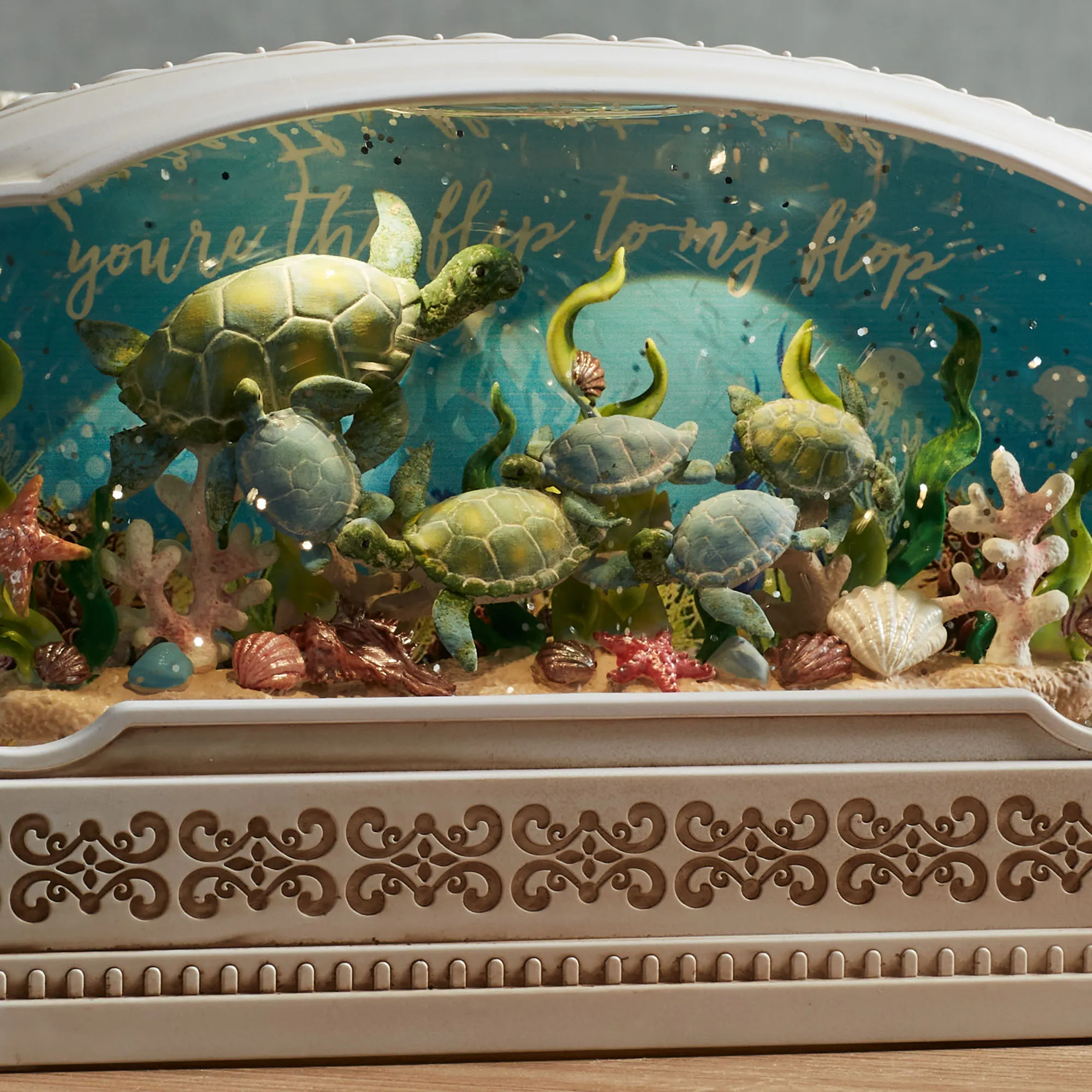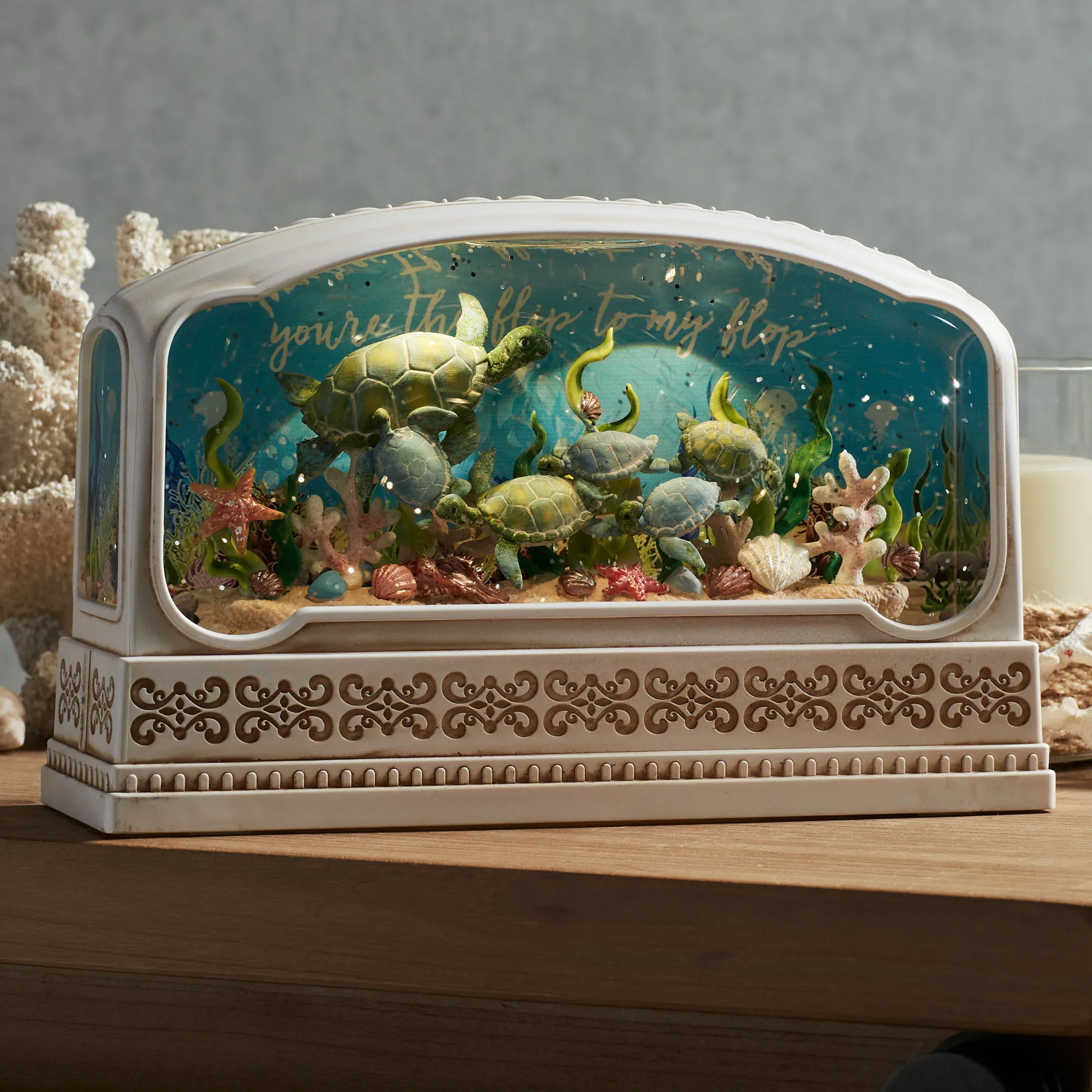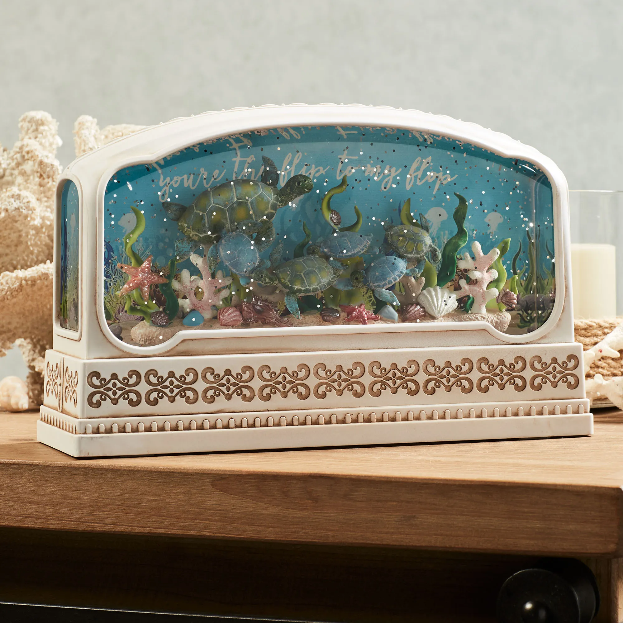 The Under the Sea Swirl Water Globe magically transports viewers beneath the waves. From Kurt S. Adler, the off-white molded plastic design features classic detailing, brown antiquing, and clear windows to the ocean floor. The liquid-filled interior shimmers with swirling glitter, glows with LED lights, and features sea turtles around a bright reef with starfish and shells. The background reads "you're the flip to my flop." Requires three of your AA batteries or your adapter for use with the included USB cord. Overall, the coastal water globe measures 9"Wx3"Dx6"H.