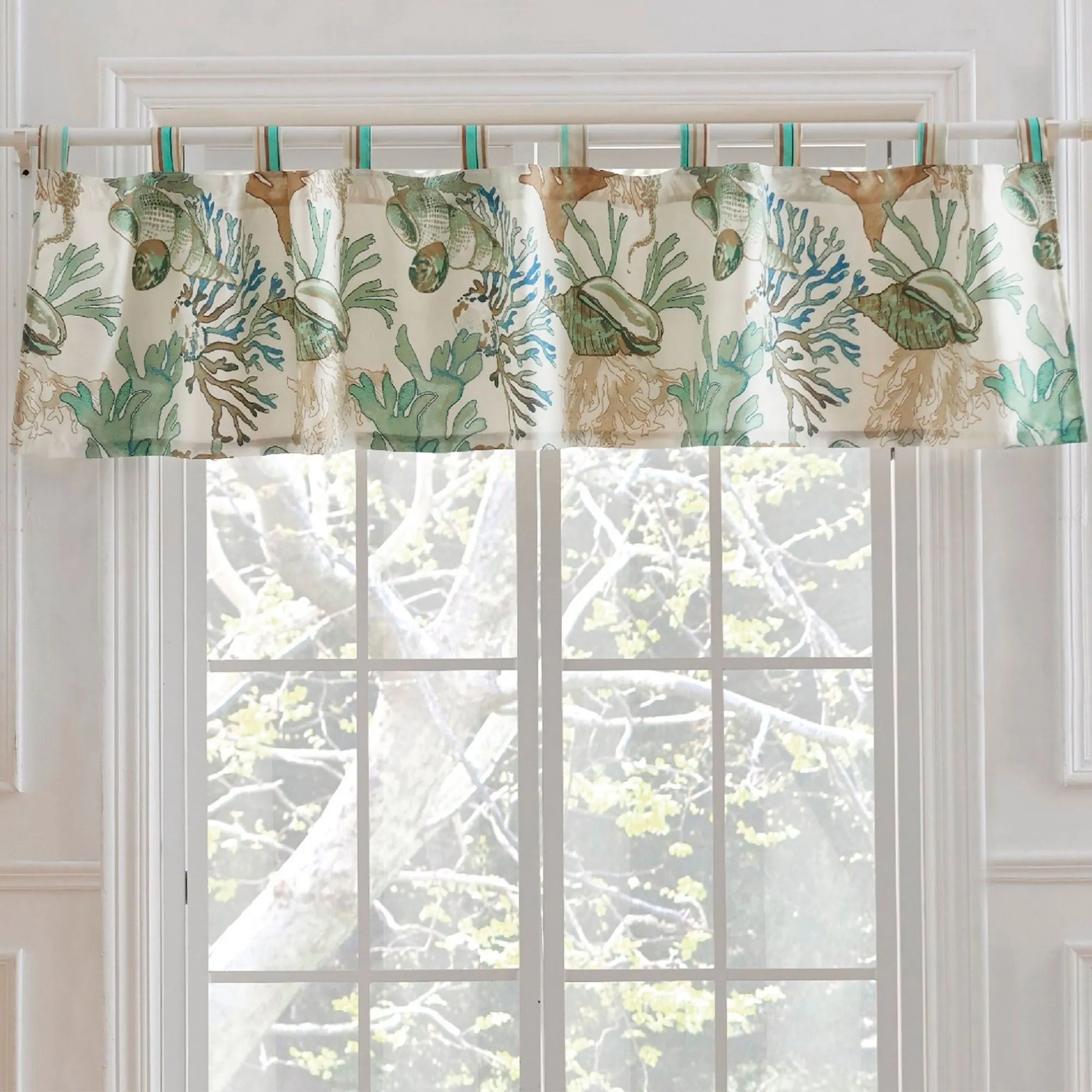 Make waves with the Under the Sea Coastal Window Treatment. Made of polyester microfiber, this pre-washed and preshrunk ensemble features printed sea life designs of seahorses, coral, and seashells. Colors include the shades of warm green, light brown, dark blue, and ecru. Window treatment has 3"L tabs at the top. Specify Curtain Pair or Valance. The tailored, lined Curtains include tiebacks. Machine washable. Imported. The curtain pair width is the total width of two panels together.