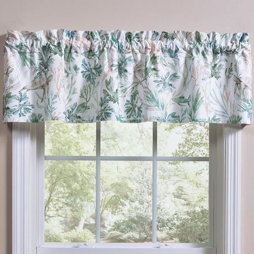 Under the Sea, creatures swim through the ocean currents and flowing seagrasses. Printed in a watercolor style, the white cotton window valance features sage green and taupe sea turtles, blue crabs, and turquoise fish floating among the blue, green, taupe, and coral-hued seaweed, seagrasses, and coral motifs. Rod pocket measures 2". Overall, the tailored valance measures 60"Wx14"L. Machine washable. Imported.