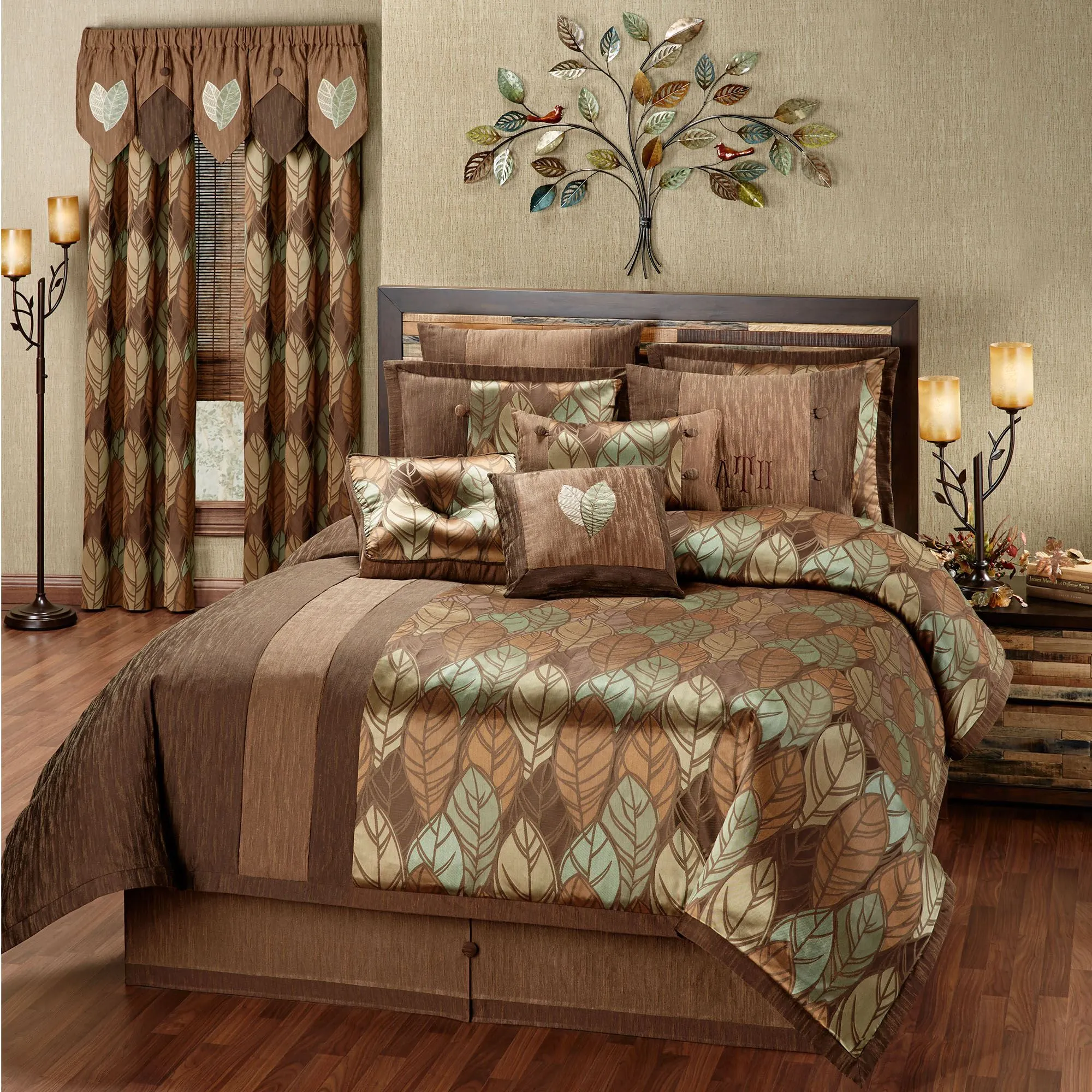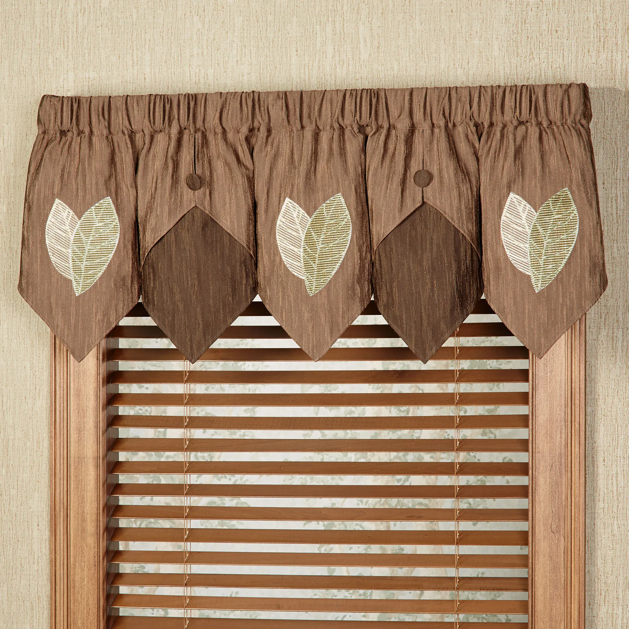 Window Treatments: Grommet Curtains feature the leaf design with tailored edges and 3" dia. bronze-finished metal grommets. Grommet Valance has the leaf design with a cocoa border accented with leaf buttons; 3" dia. bronze-finished metal grommets line the top. Layered Valance is cocoa accented with coordinating leaf embroidery and chocolate-covered buttons, with a chocolate underlayer; 3" rod pocket.
