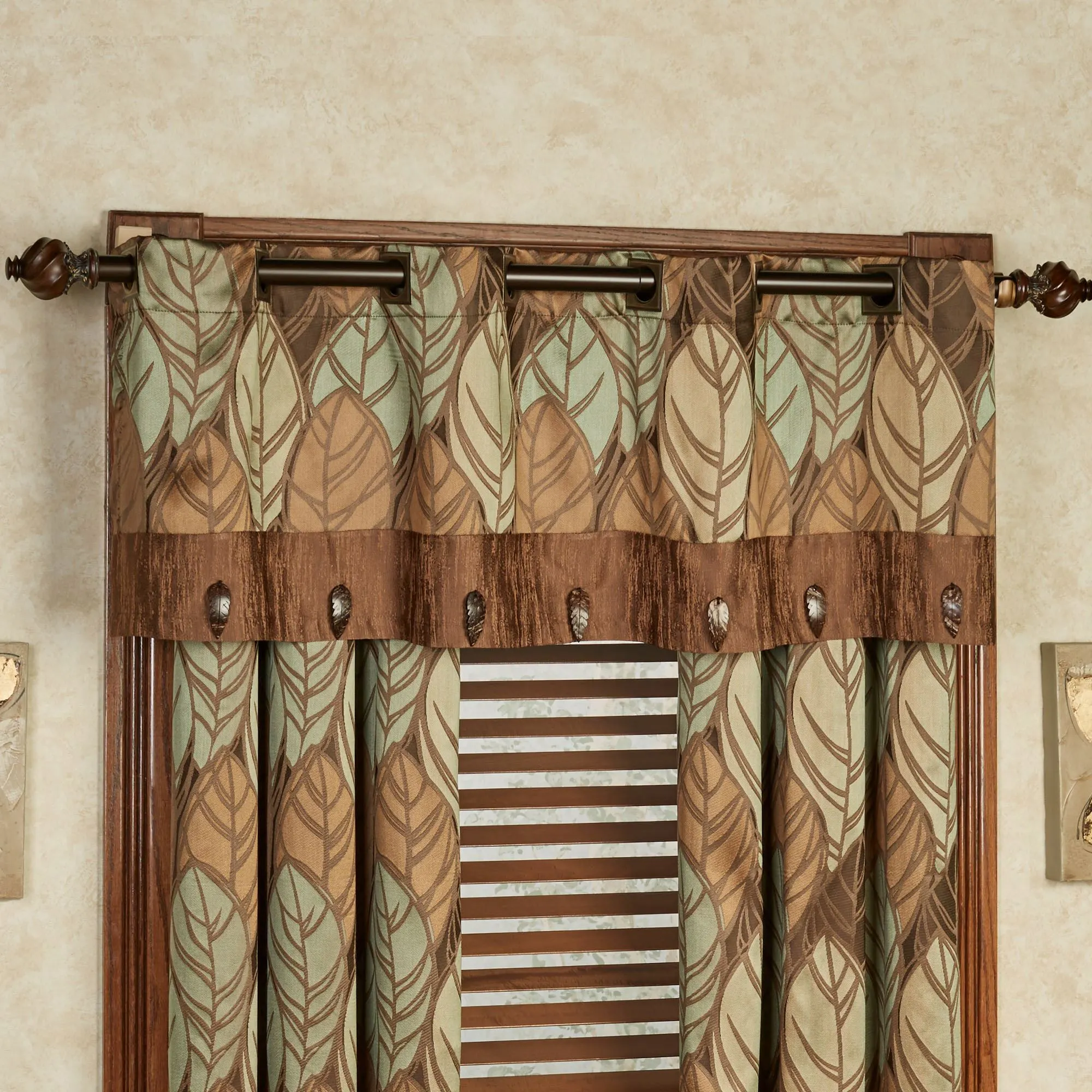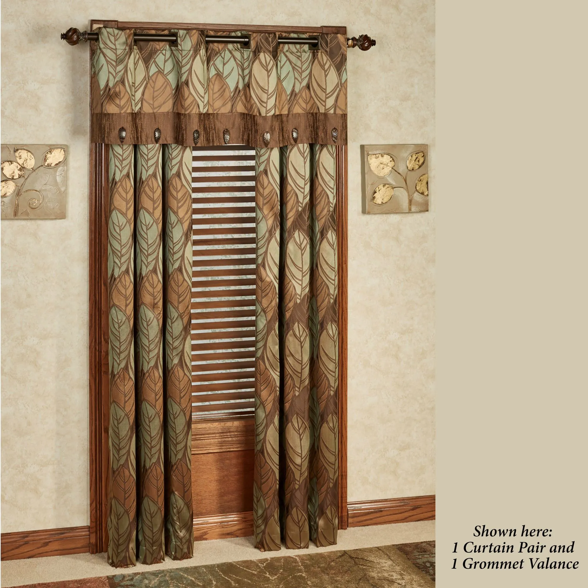 Inspired by nature, the Urban Leaves II Factory Second Window Treatment has a slight sheen on a slub-textured background. Polyester window treatment features veined leaves in shades of chocolate, cocoa, brown, pale green, and jade. The 3" dia. metal grommets have a bronze finish. Specify Grommet Curtain Pair, 84"Wx84"L; or Grommet Valance, 60"Wx18"L. Curtain Pair is tailored. Grommet Valance has a 5" scratched cocoa bottom border with leaf button details. Items are factory seconds and have slight runs in the fabric. Dry clean. Imported. The curtain pair width is the total width of two panels together.