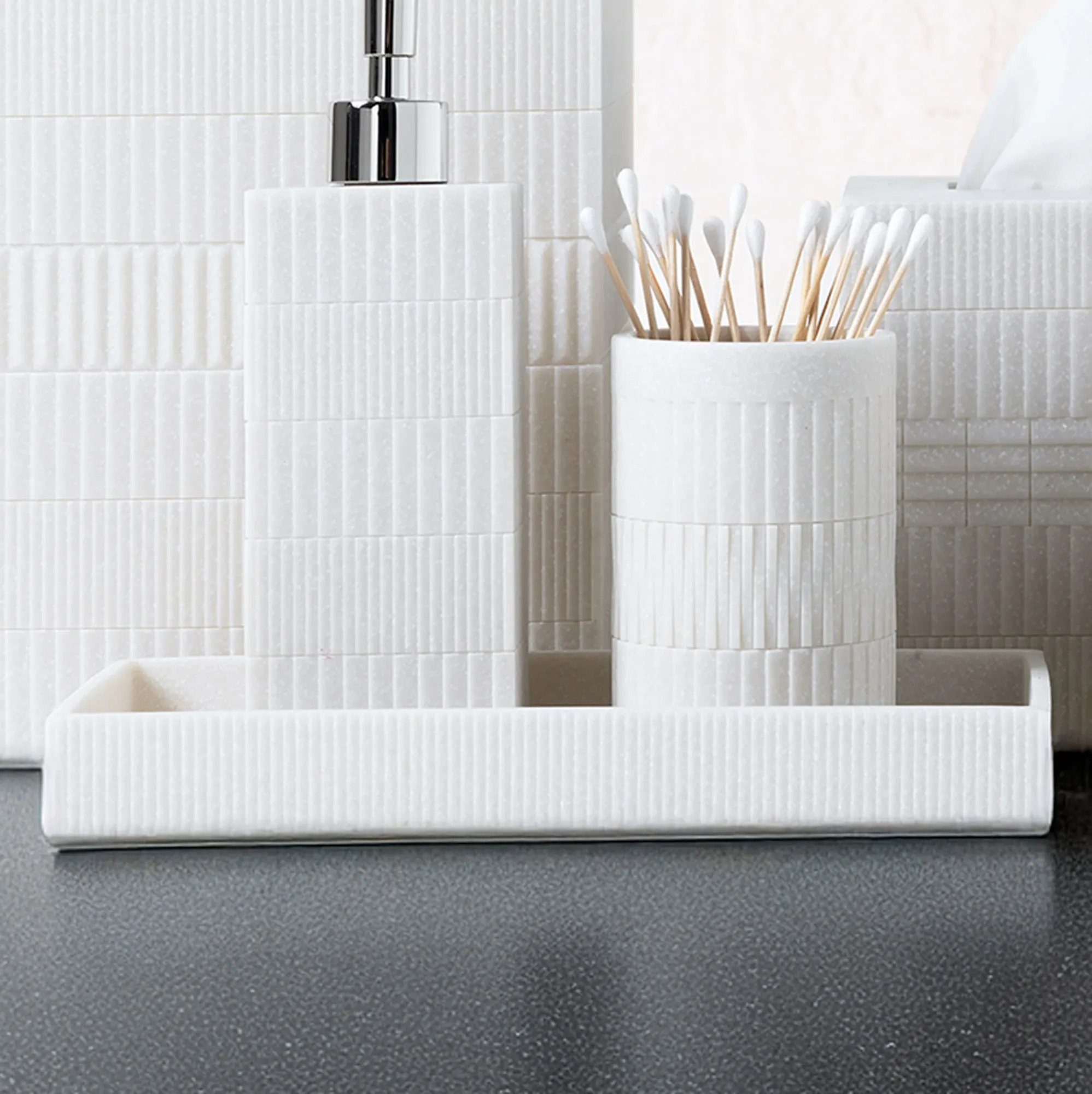 The Urbano Bath Accessories are flecked resin.