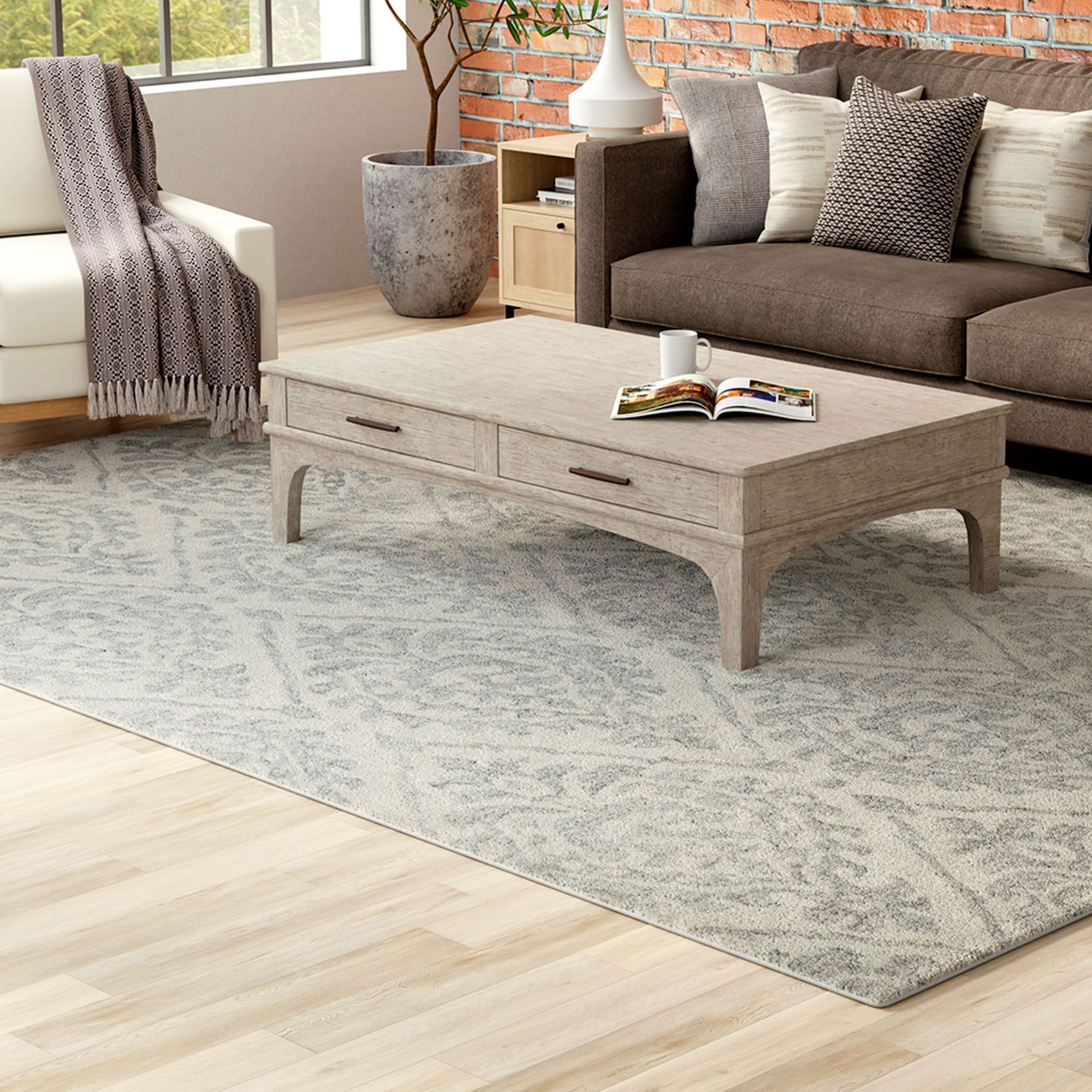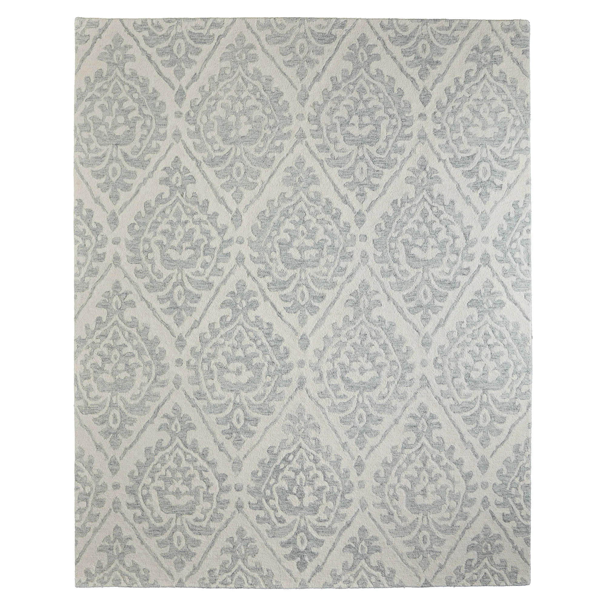 The damask pattern on the Vaila Rug showcases a modern presentation of a classic design. This hand-hooked wool area rug, .5" thick, has ornate motifs. Colors include shades of gray and ivory. The natural lanolin in this rug allow it to be fade-, water-, and stain-resistant. Backing is cotton. We recommend professional cleaning by a rug cleaner. Imported.