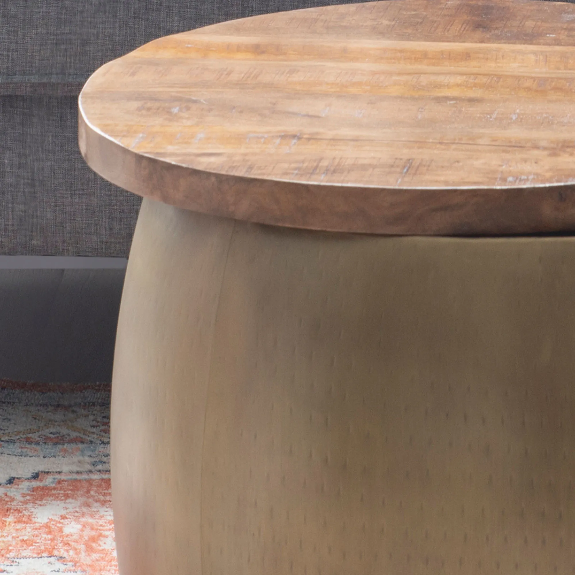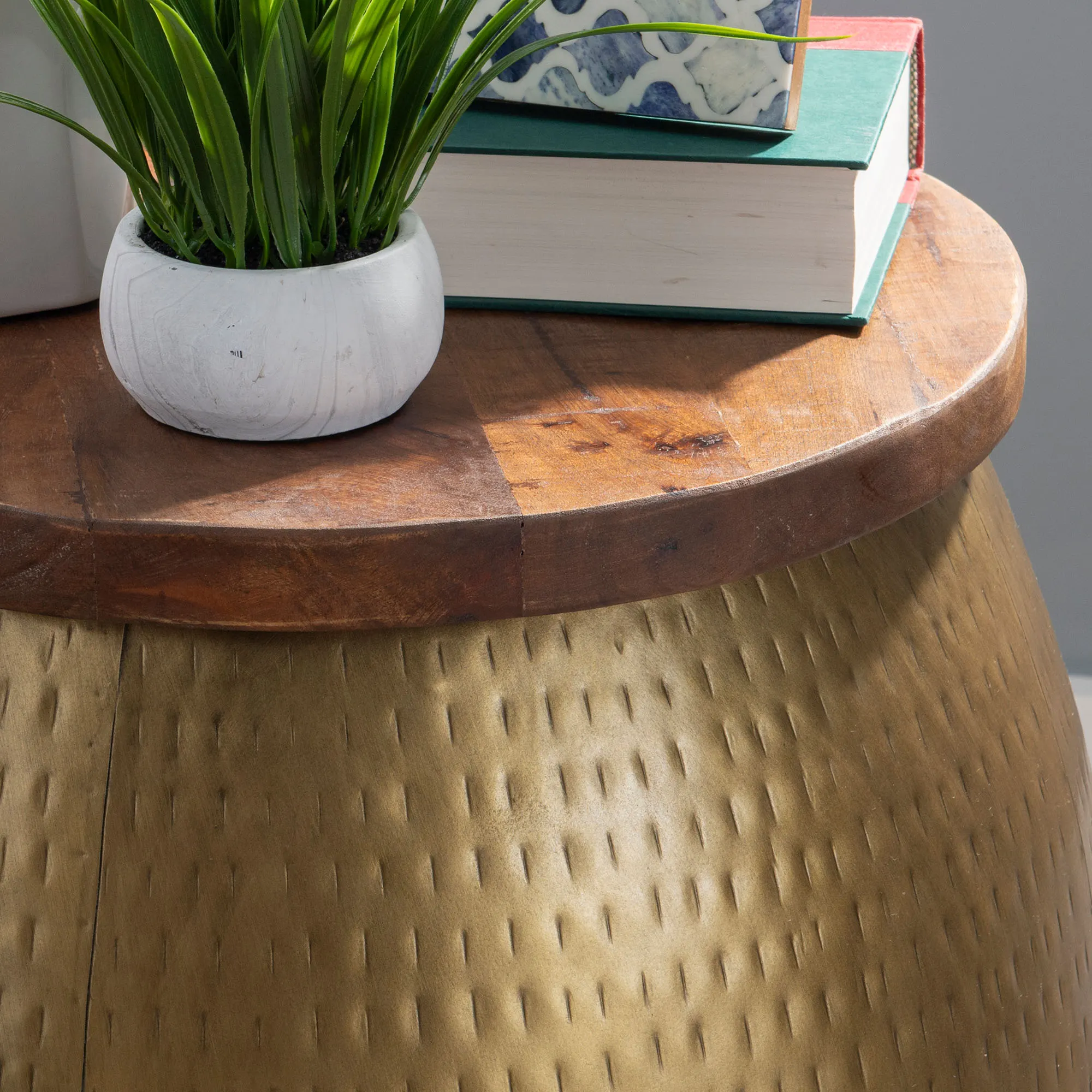 Vale Gold Hammered Metal Storage Drum Side Table with Mango Wood Top