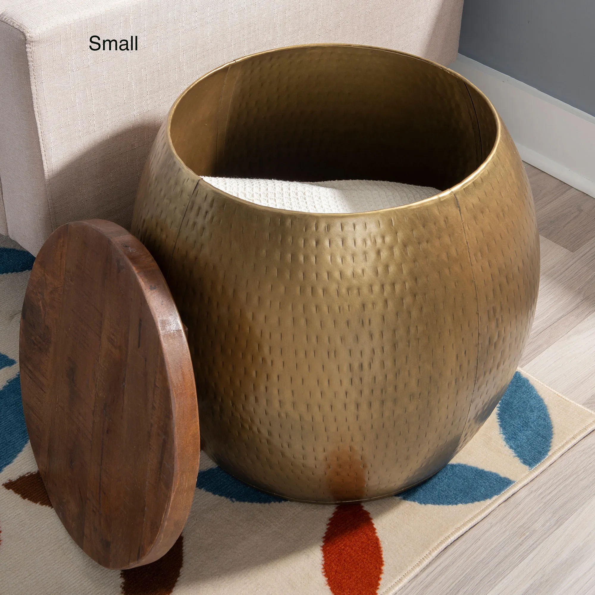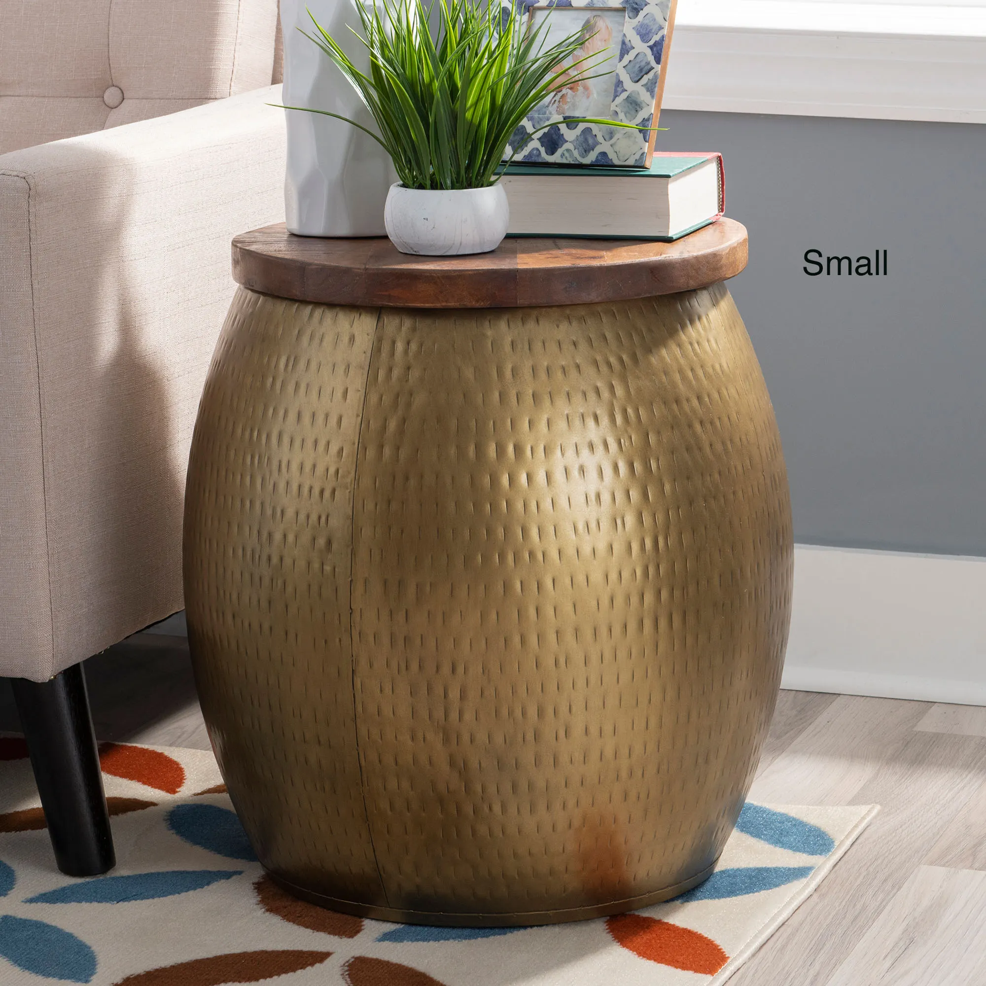 Place the Vale Gold Drum Side Table where it can be admired for its simplistic yet modern look. The handcrafted storage drum is hammered gold metal and is topped with a distressed, mango wood lid for rustic contrast. Lift off the lid to place items inside. The maximum recommend weight is 60 lbs. for the Large table and 45 lbs. for the Small table. Due to the handcrafted nature, slight variations may occur. Large table is 27.5"dia.x18.5"H; weighs 28 lbs. Small table is 19"dia.x20"H; weighs 16 lbs.