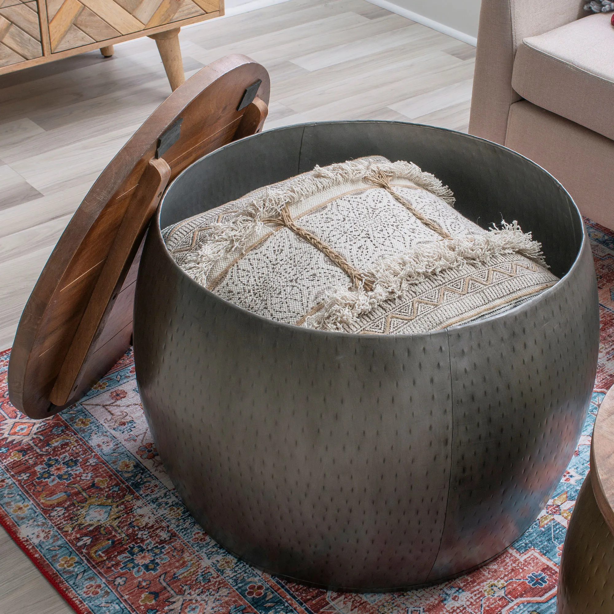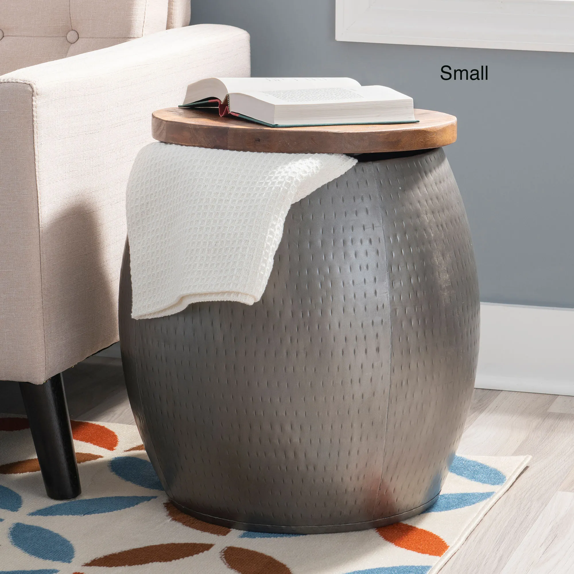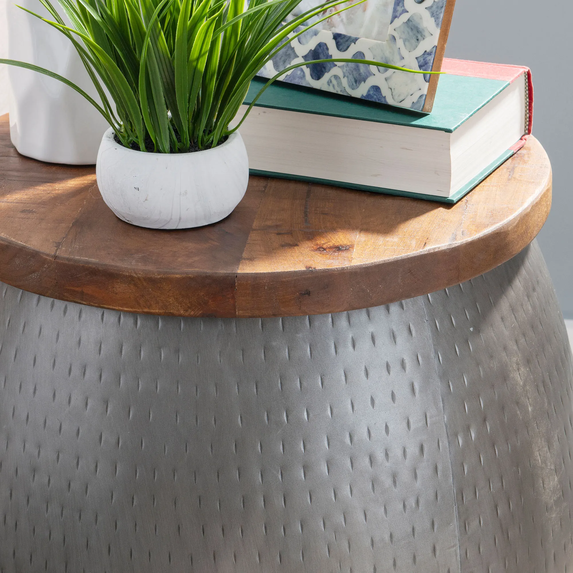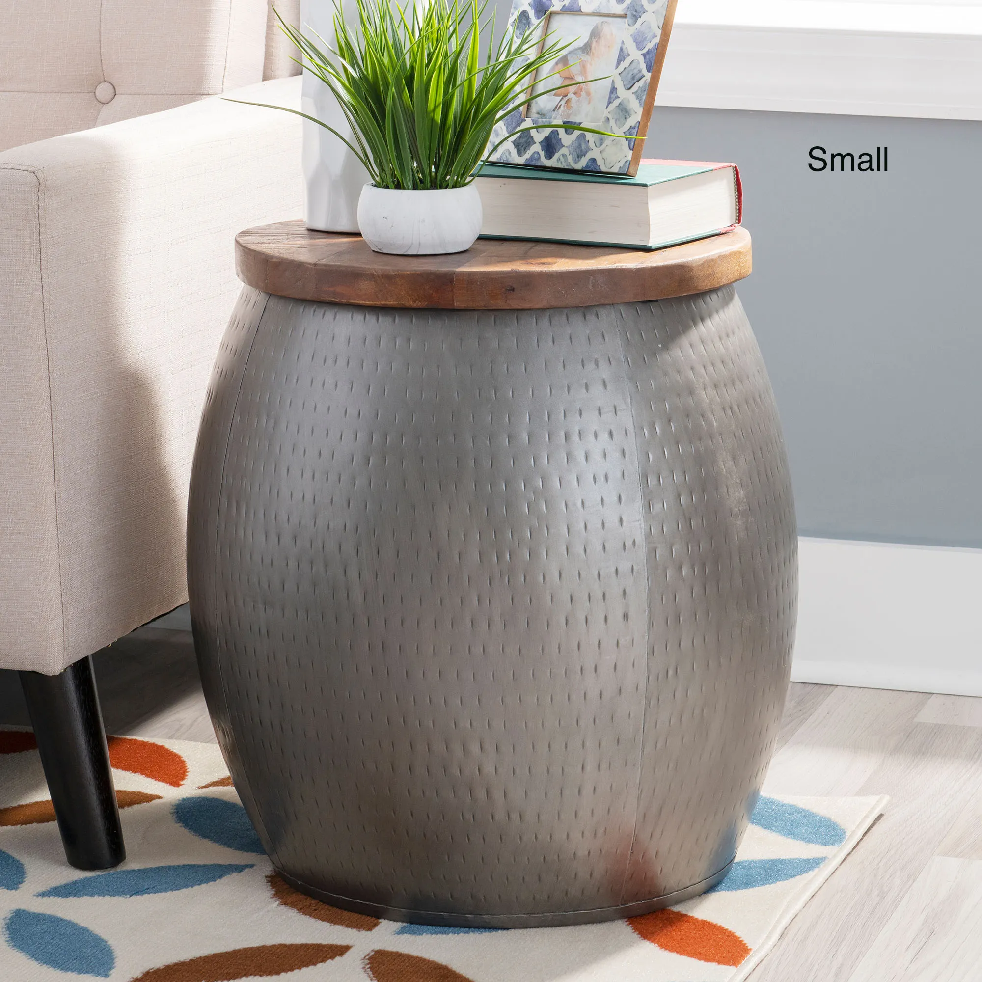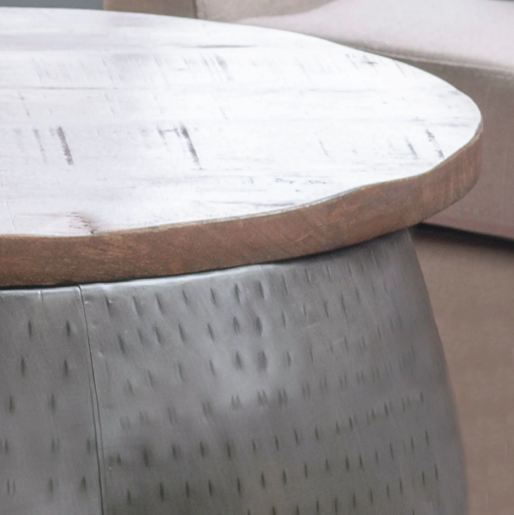 Vale Pewter Hammered Metal Storage Drum Side Table with Mango Wood Top
