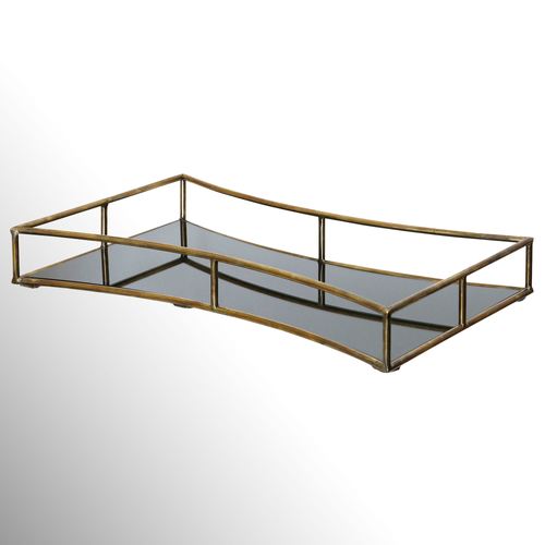 Display your favorite items in the unique charm of the Vale Large Mirror Tray. Perfect for bathrooms or vanities, the brass tray features openwork sides, a unique curved shape, an antique brass finish, and a glass mirrored bottom. Measures 24"Wx14"Dx4"H.