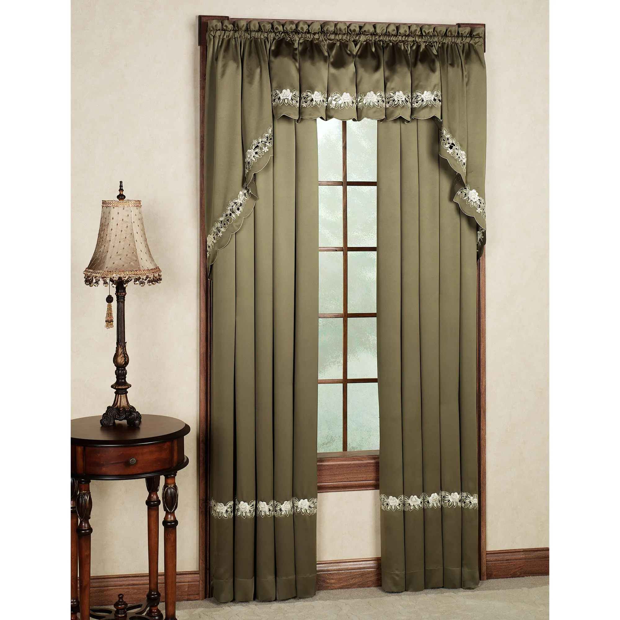 Valencia Window Treatment makes a sophisticated statement in any room. Solid color, polyester faux silk accents have an antique look with intricate floral embroidery and cutwork. Specify Curtain Panel, Swag Valance Pair, or Tailored Valance. Window treatment has a 1.5" rod pocket. Washable. Imported.