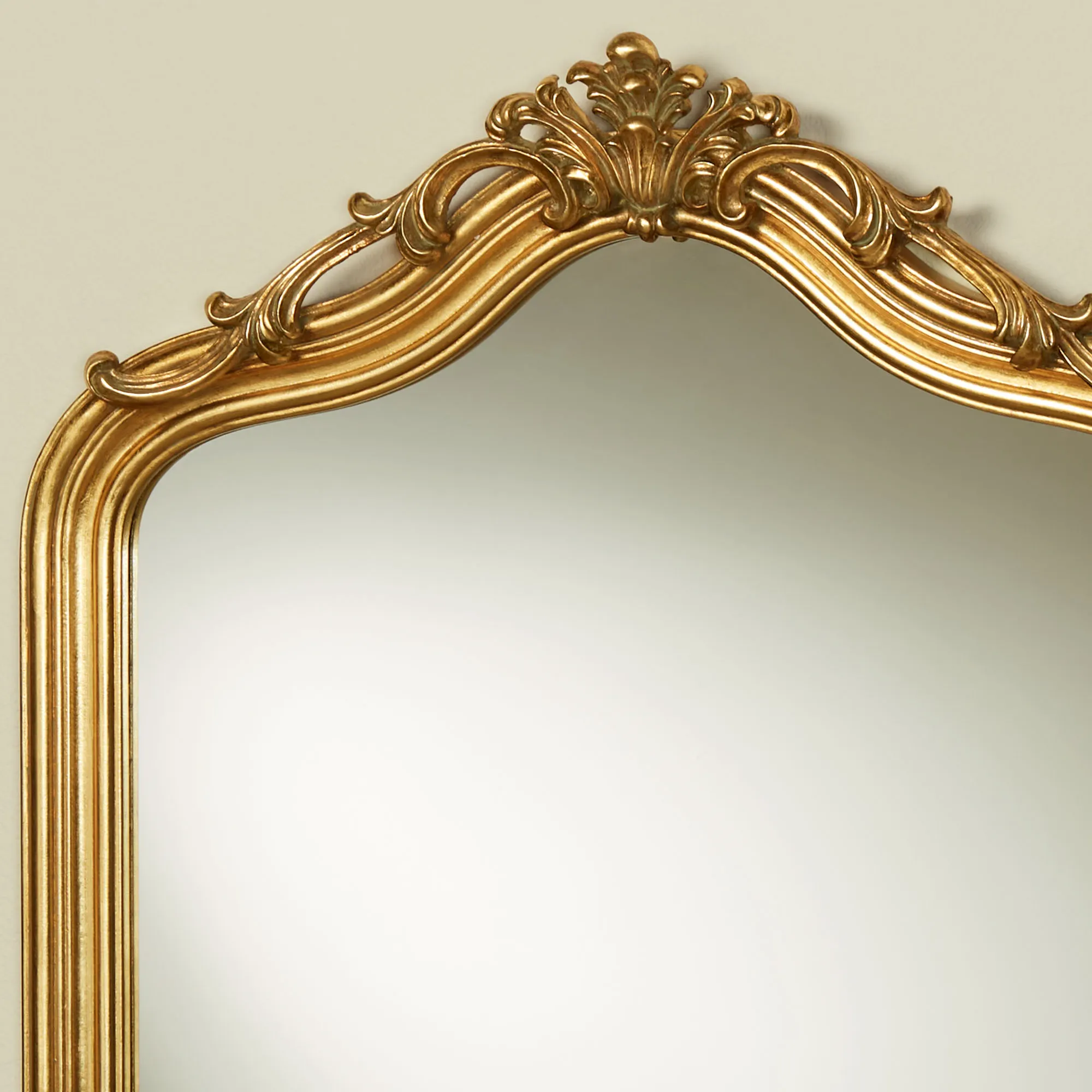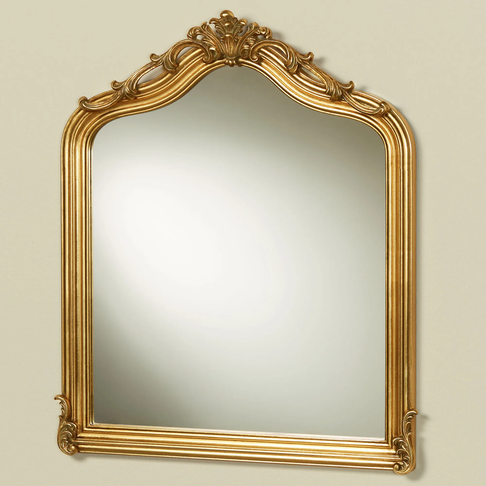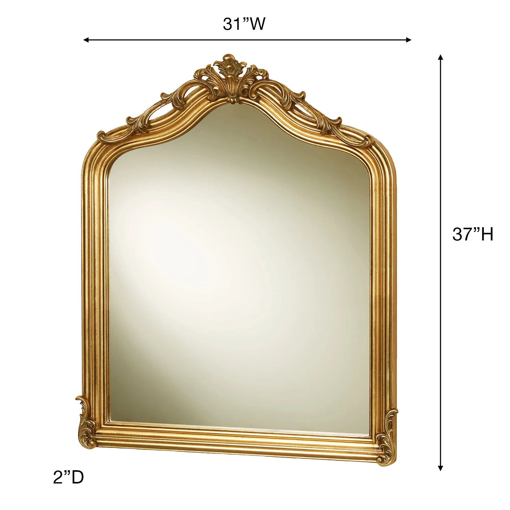 The Valencia Wall Mirror reflects a grand charm. With a center glass mirror, the lovely arched resin frame features a wide grooved design, radiant antique gold finish, openwork crowning acanthus leaf flourishes, and further acanthus leaf corner details. Overall, the shaped wall mirror measures approx. 31"Wx2"Dx37"H and weighs approx. 20 lbs.