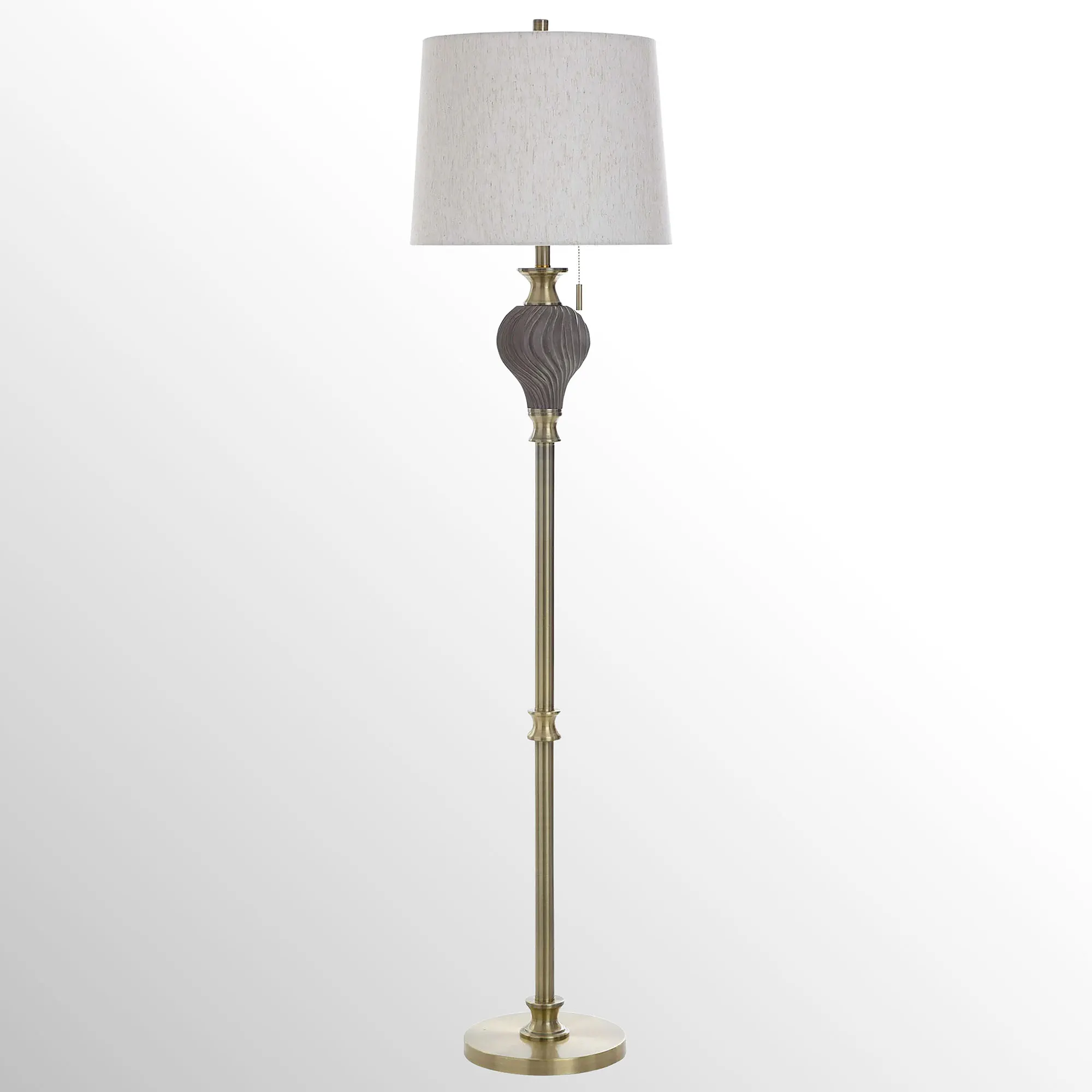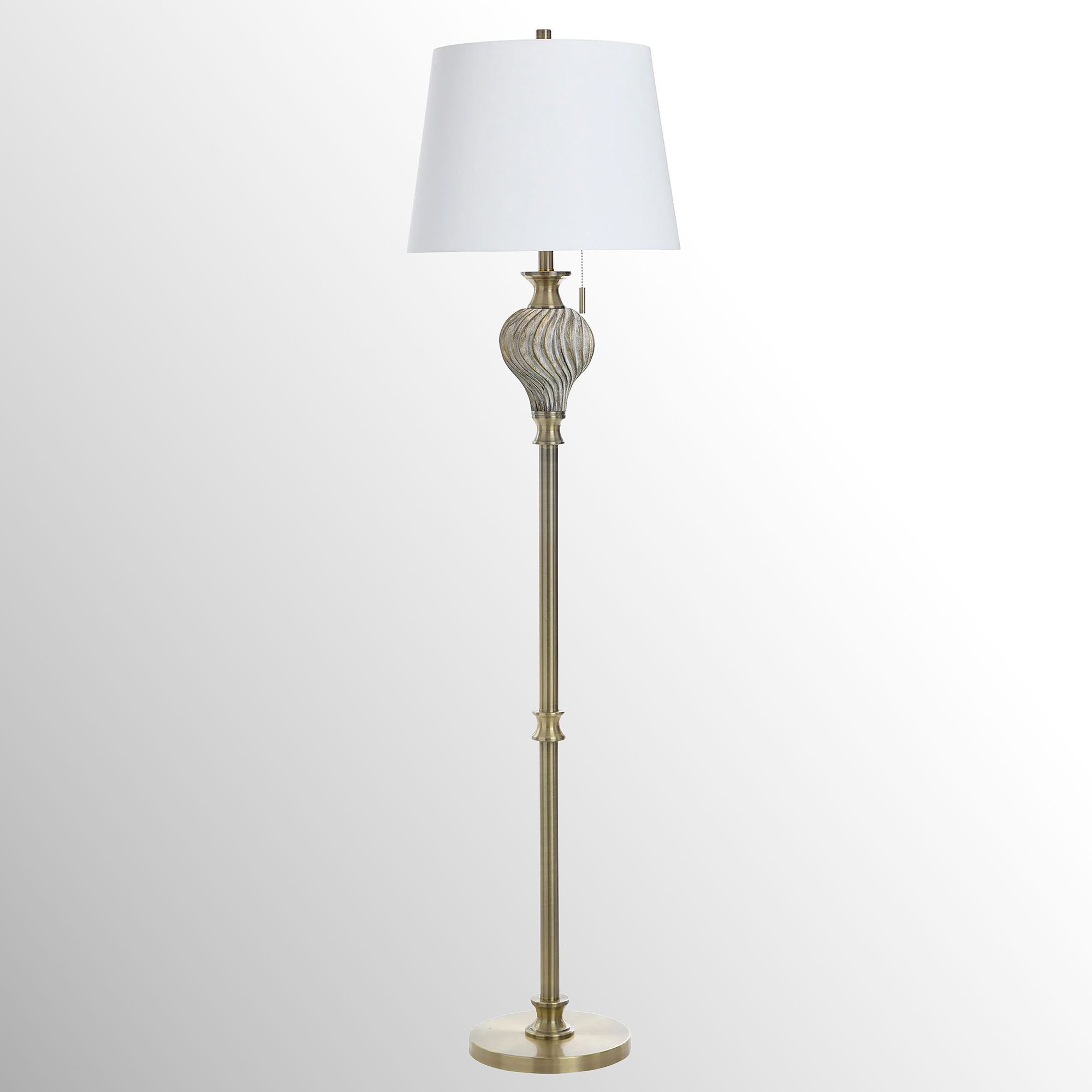 Sophistication is uniquely defined with the swirl design on the Valenza Floor Lamp. The polyresin floor lamp has a twist design on the font and gold metal accents. The neutral, cotton/polyester shade has a tapered design. UL listed. Pull chain requires one 100W max. bulb, not included. Measures 16"dia.x63"H; weighs 16.5 lbs.