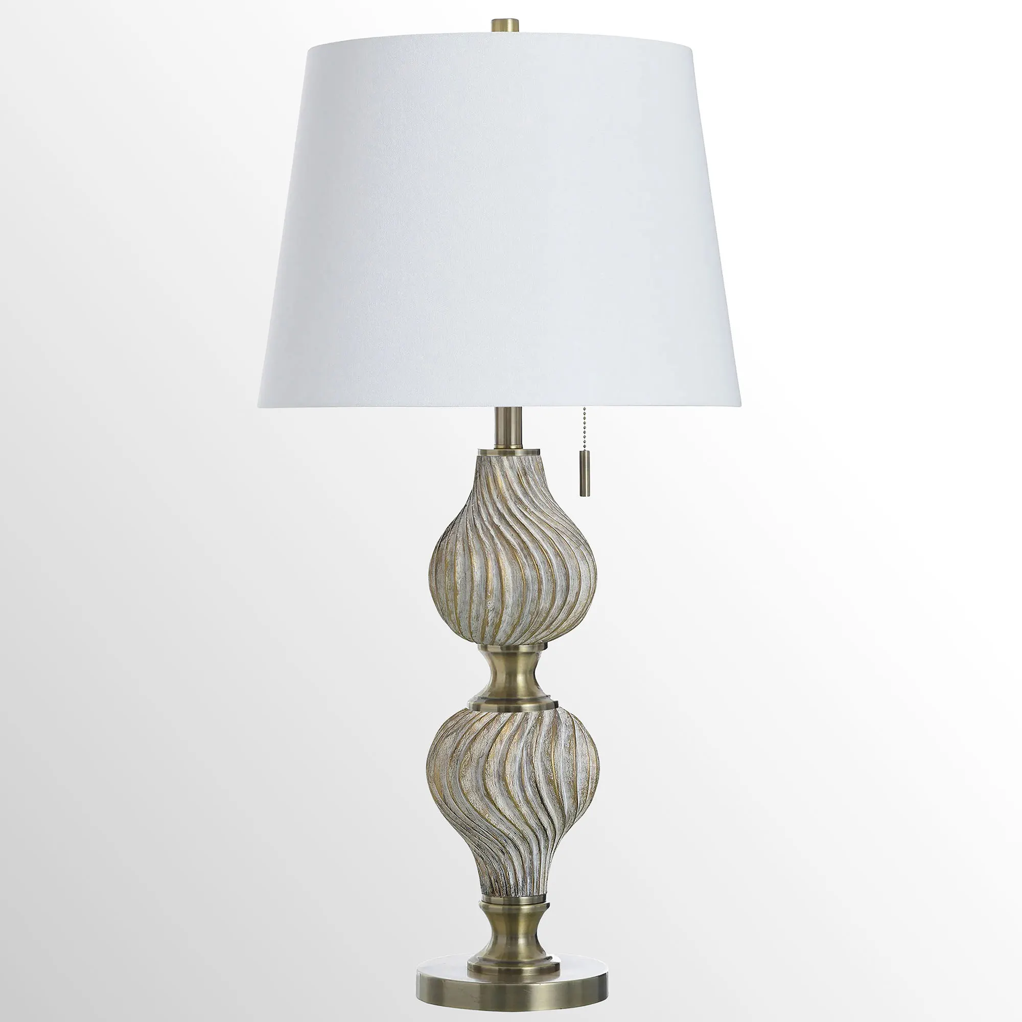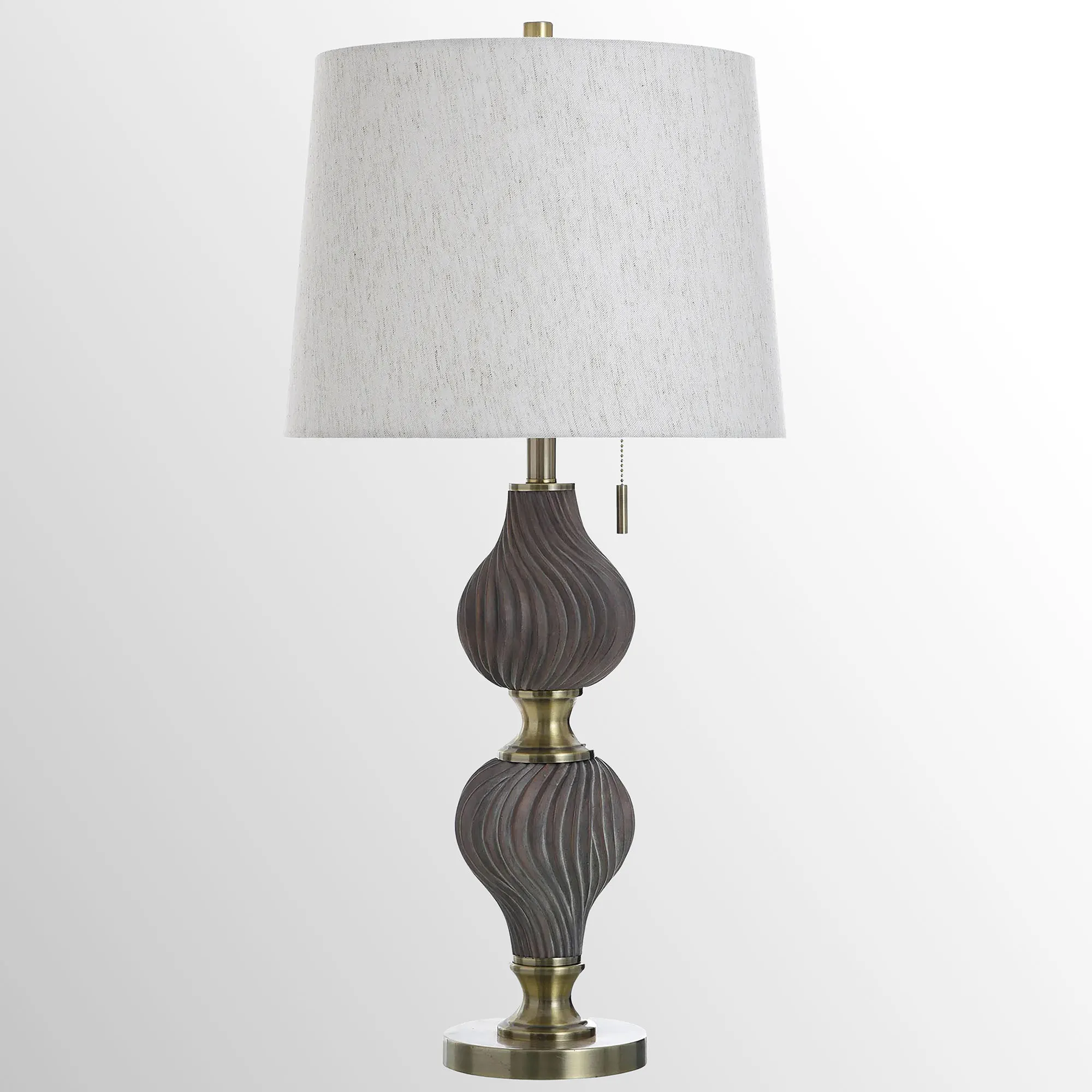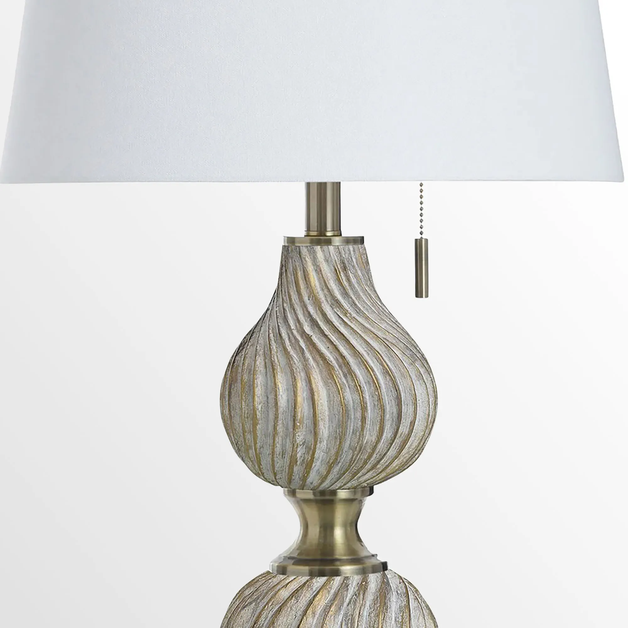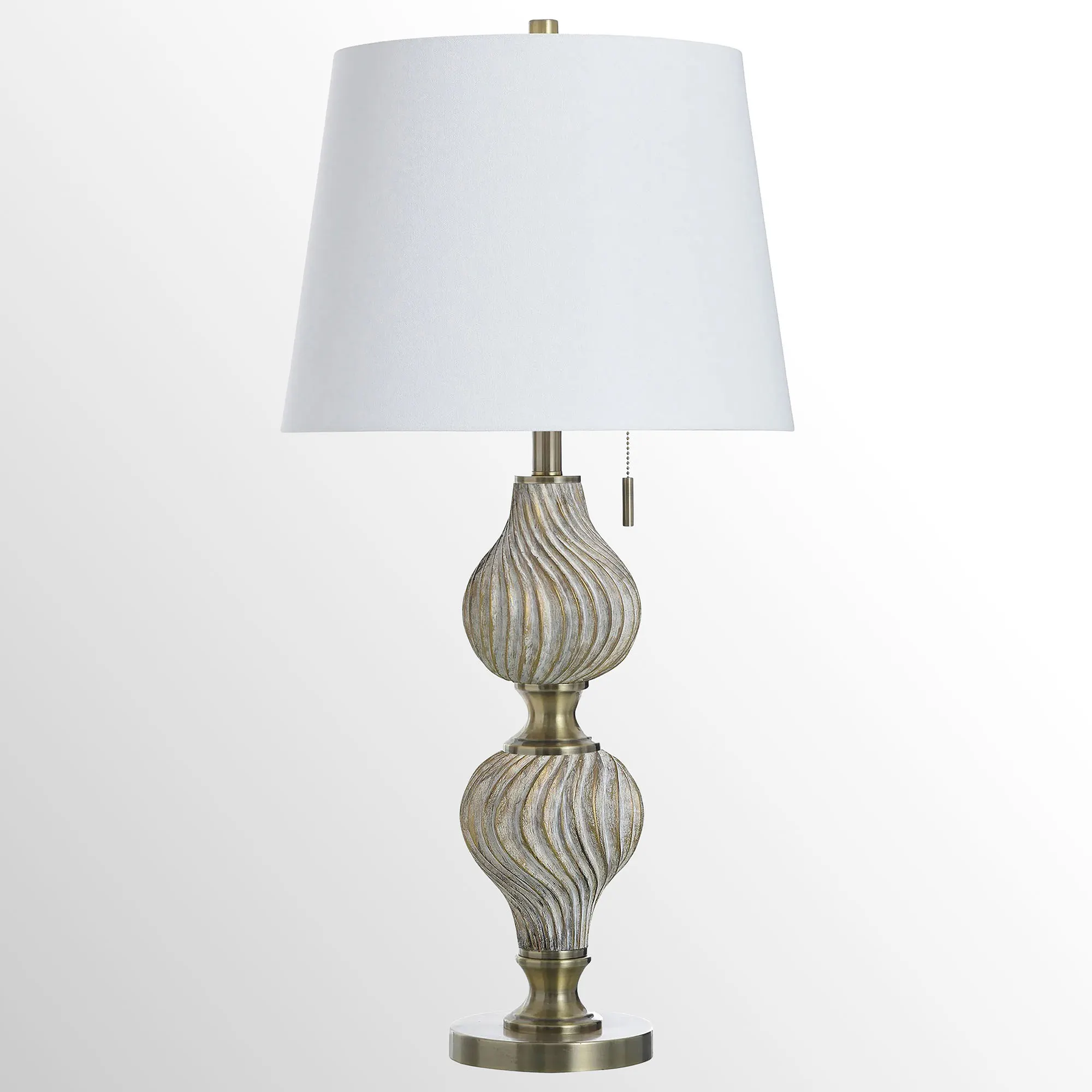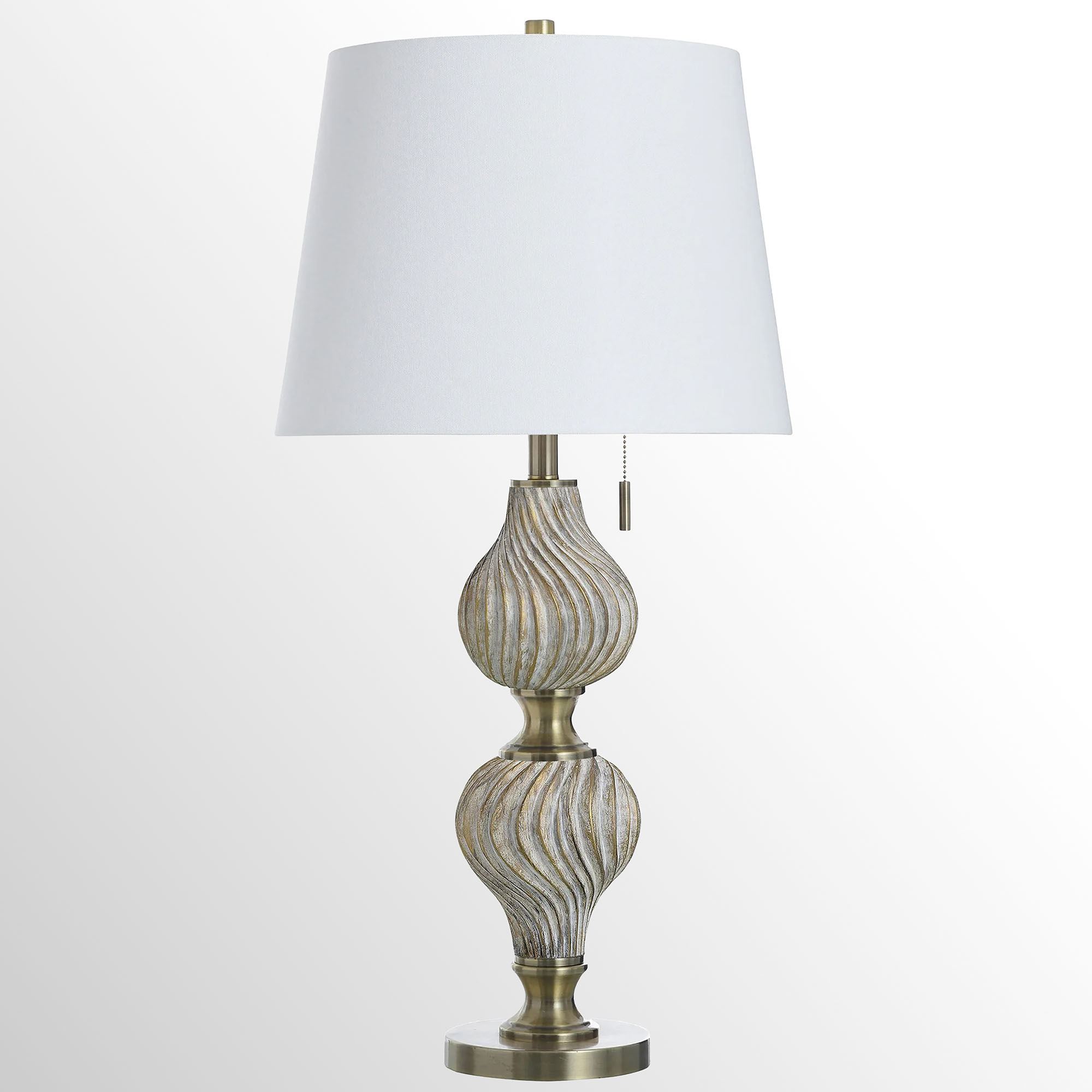 Sophistication is uniquely defined with the swirl designs on the Valenza Table Lamp. The polyresin table lamp has twist designs on the font and gold metal accents. The neutral, cotton/polyester shade has a tapered design. UL listed. Pull chain requires one 100W max. bulb, not included. Measures 16"dia.x33"H, including the 2"H finial.