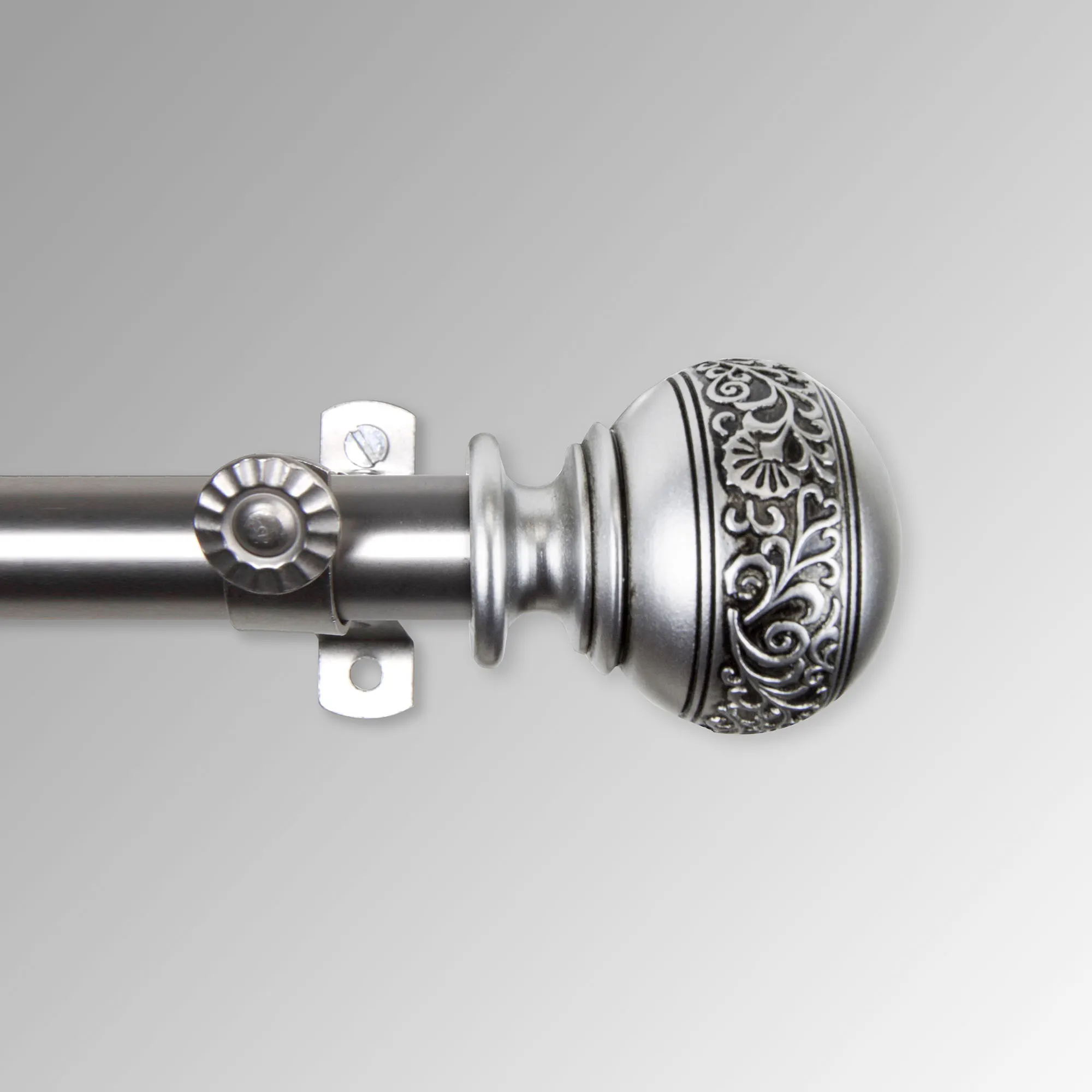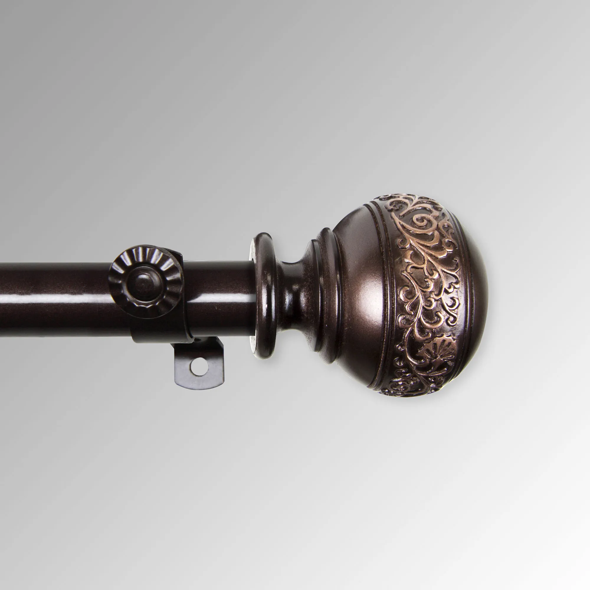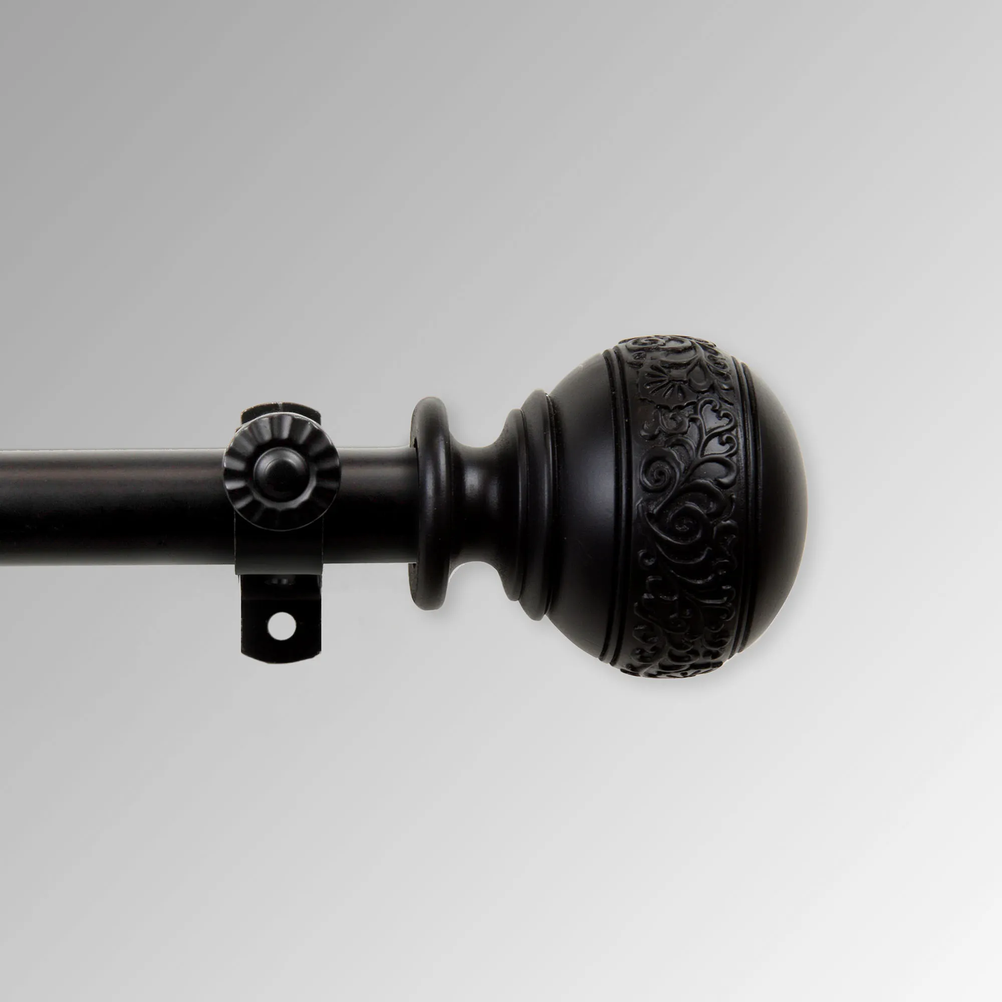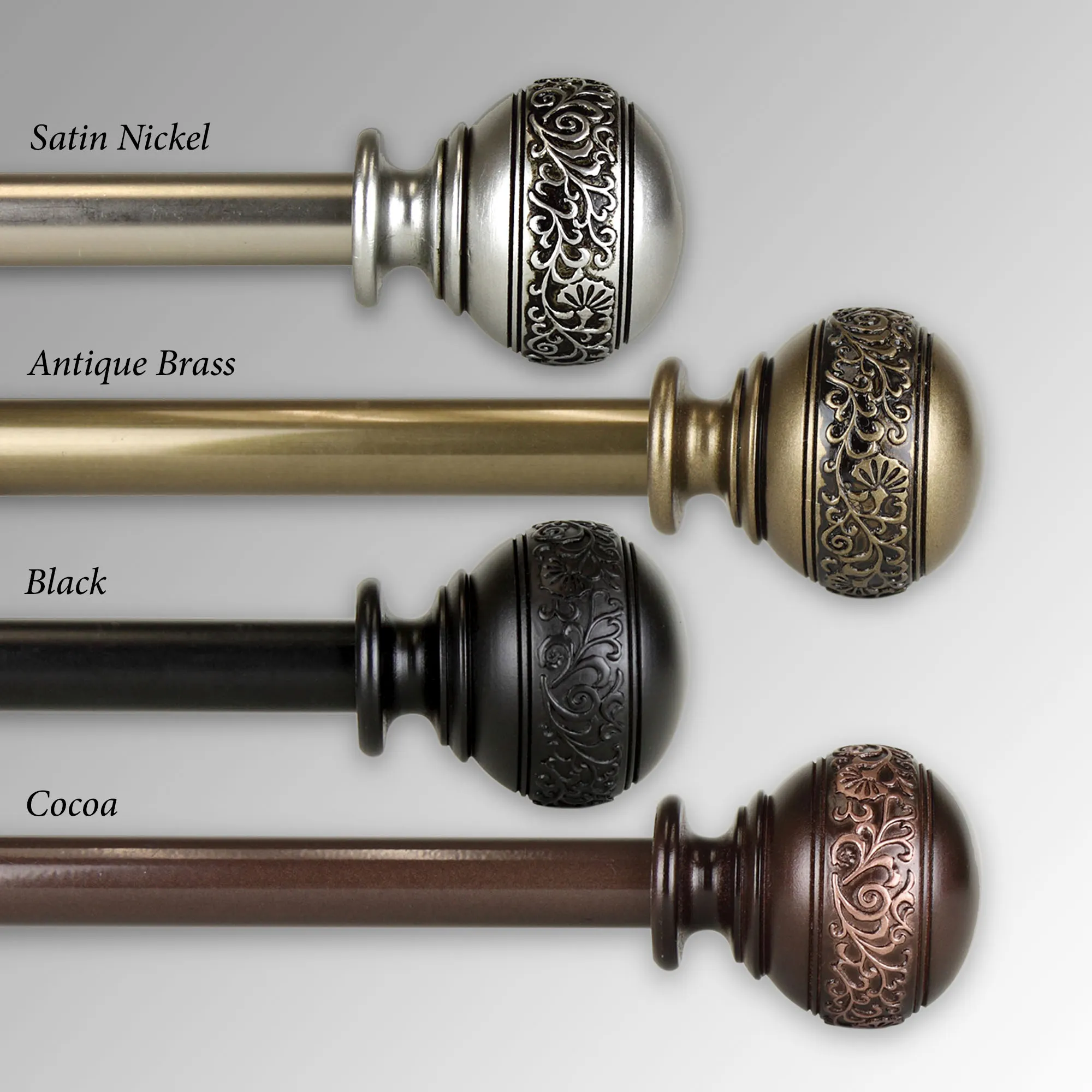 The Valeriana Curtain Hardware hangs your window treatment with a sophisticated look. Made of steel and resin, these window accents have finials with ornate scroll designs. The Decorative Curtain Rod Set includes a telescoping rod, .75" dia.; brackets that project 2.875"; and two resin finials, 2.5"dia.x2.75"L each. The 18"-28" and 28"-48" rods come with two brackets. The 48"-84" and 66"-120" rods come with three brackets. The 120"-170" rod comes with four brackets. The Curtain Holdback Pair is sold separately; the J-hook holdbacks are each approx. 6"L with 3" projections.
