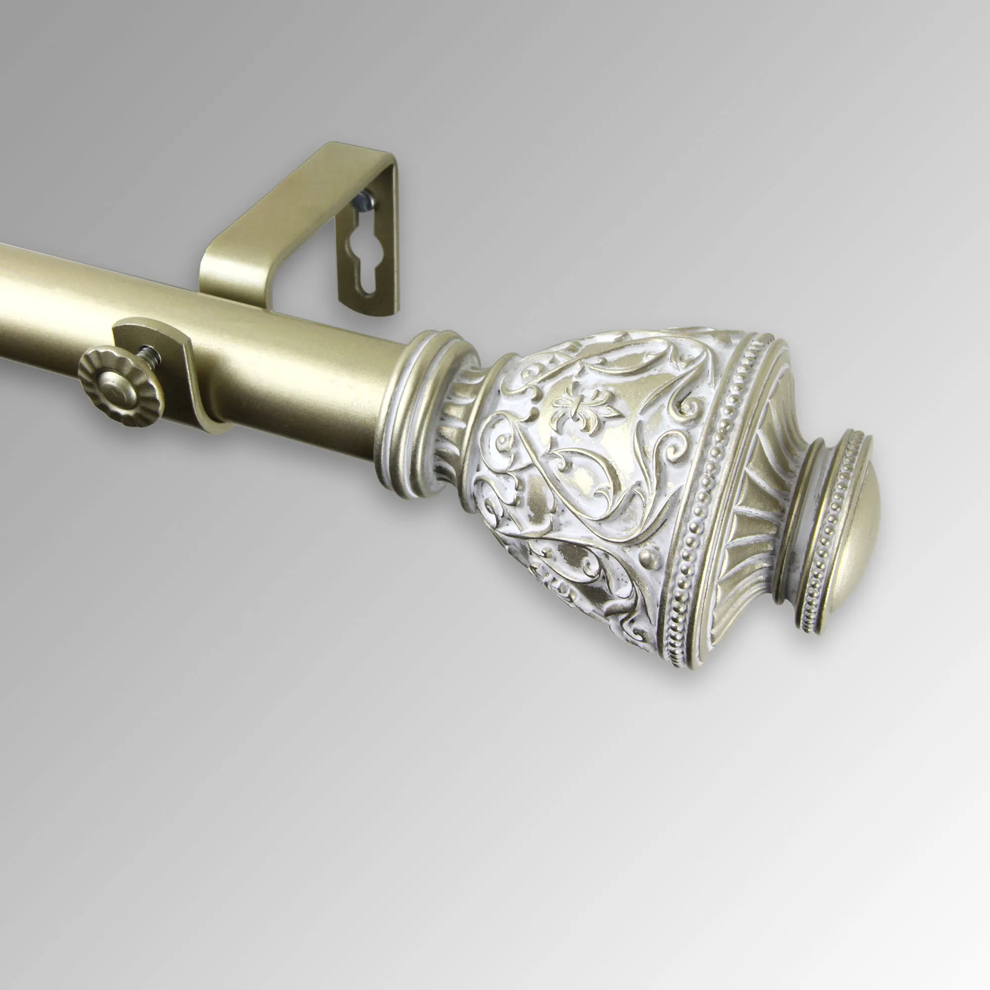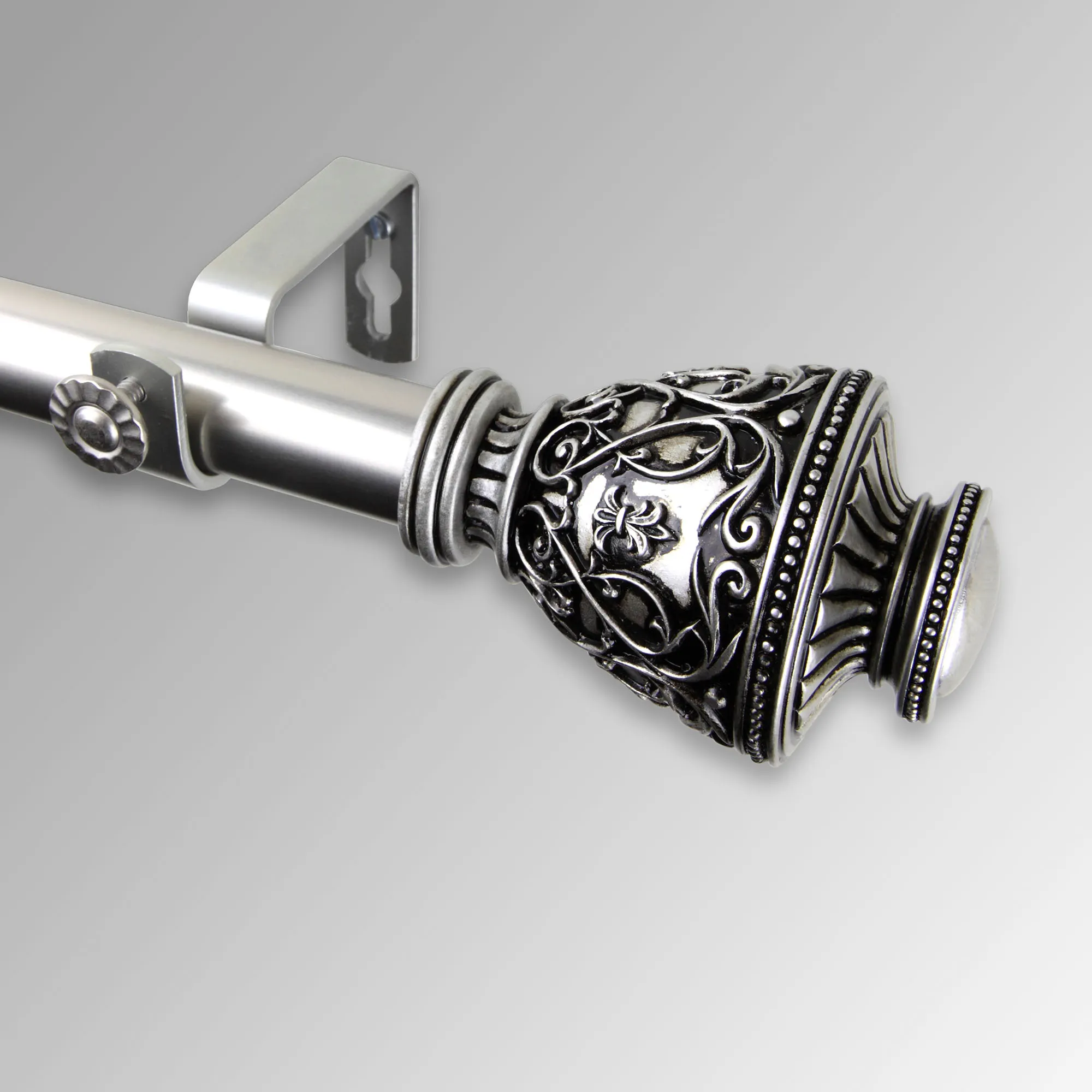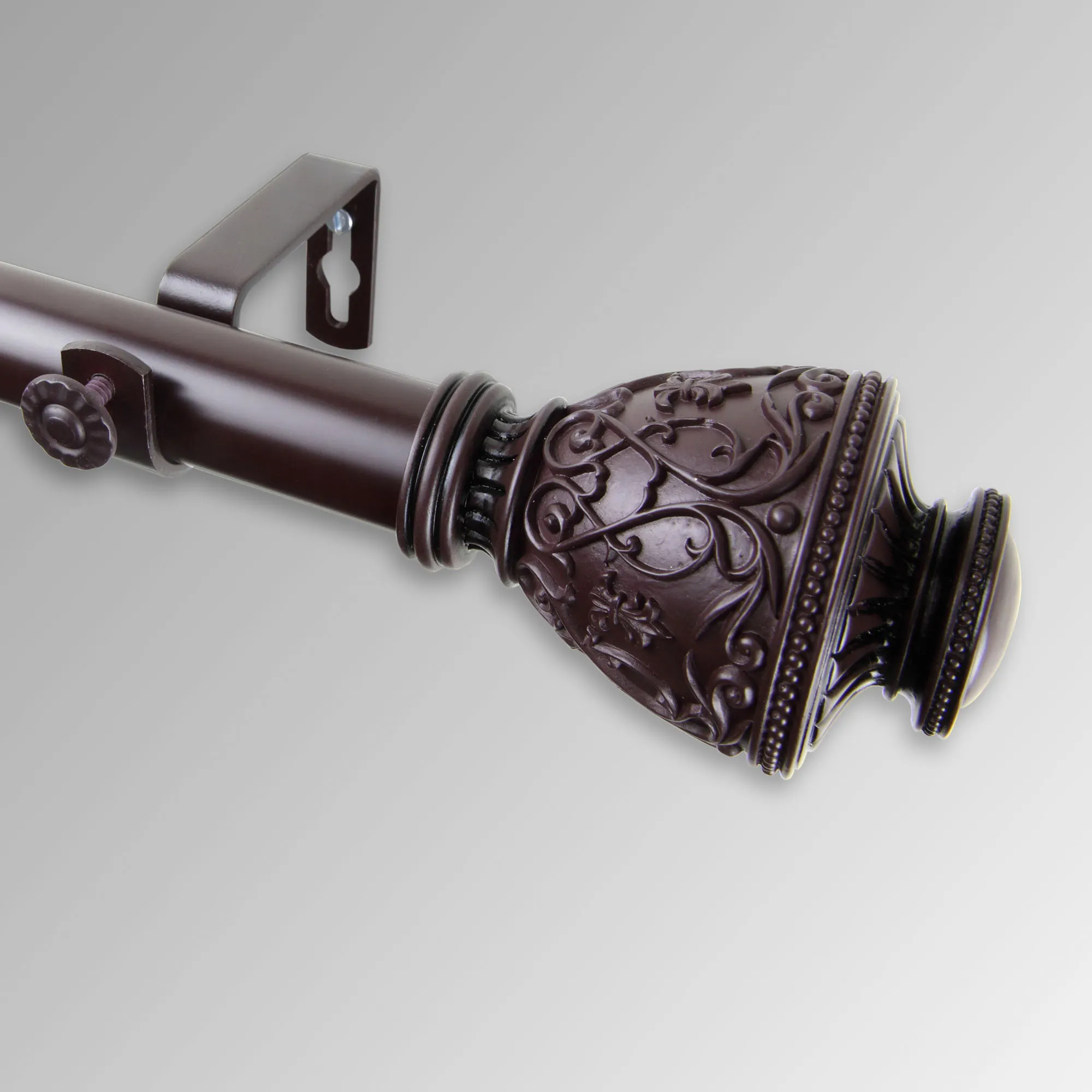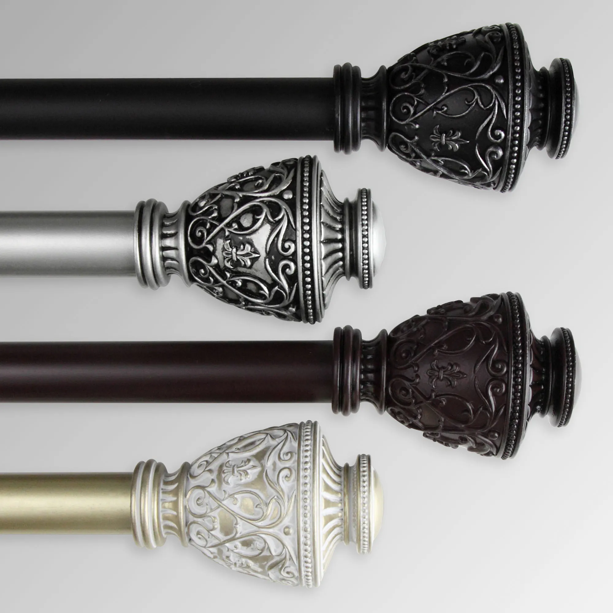 The Valo Decorative Curtain Rod Set adds a traditional touch with an urn shape, elegant scrollwork, classic fleurs-de-lis, and beaded detailing. Crafted from resin, each decorative finial measures 2.5"dia.x2.5"L. Rod set includes a 1" dia. telescoping steel rod, brackets that project 3.625", and two finials. The 28"-48" rod includes two brackets. The 48"-84" and 66"-120" rods include three brackets. The 120"-170" rod includes four brackets. The 160"-240" rod includes five brackets.