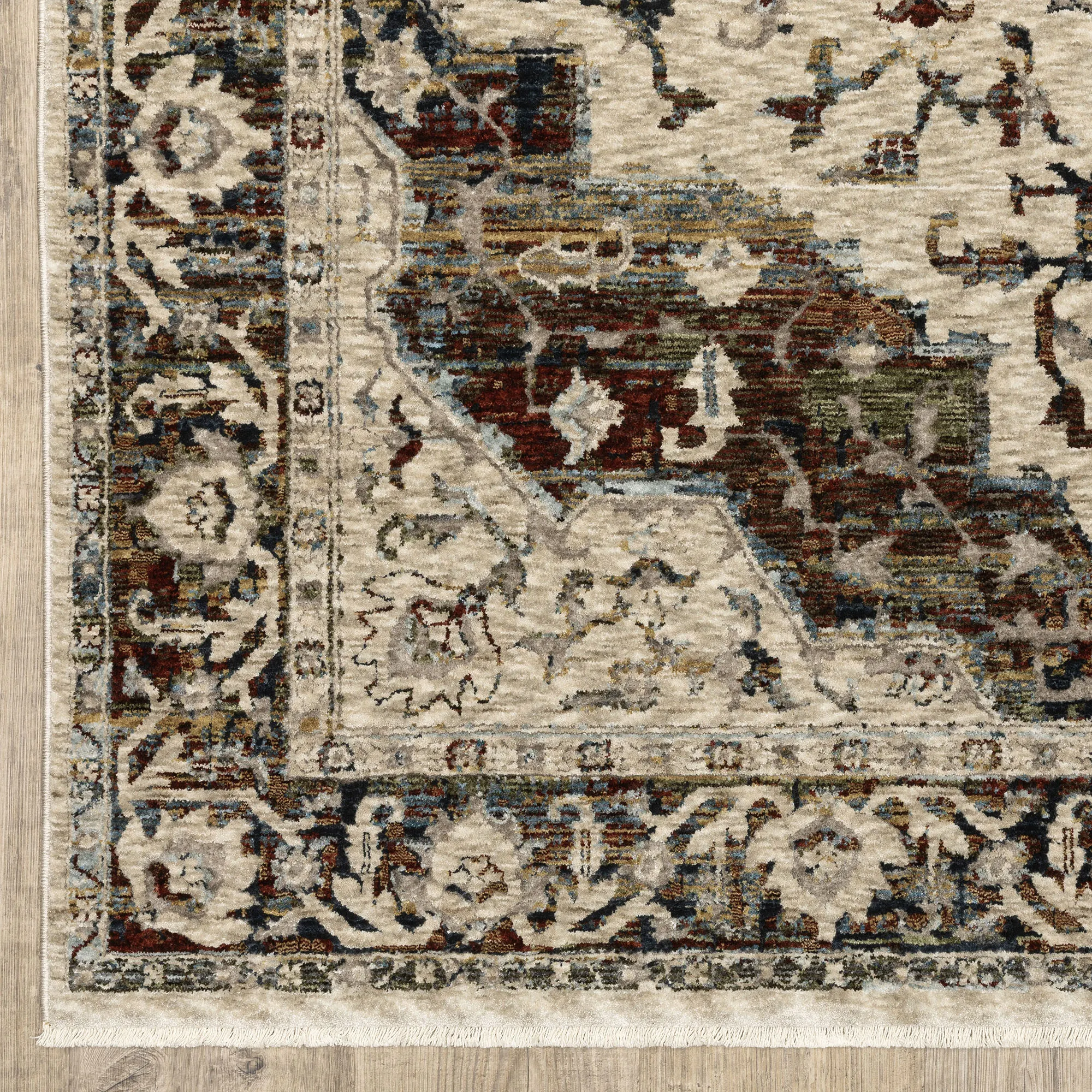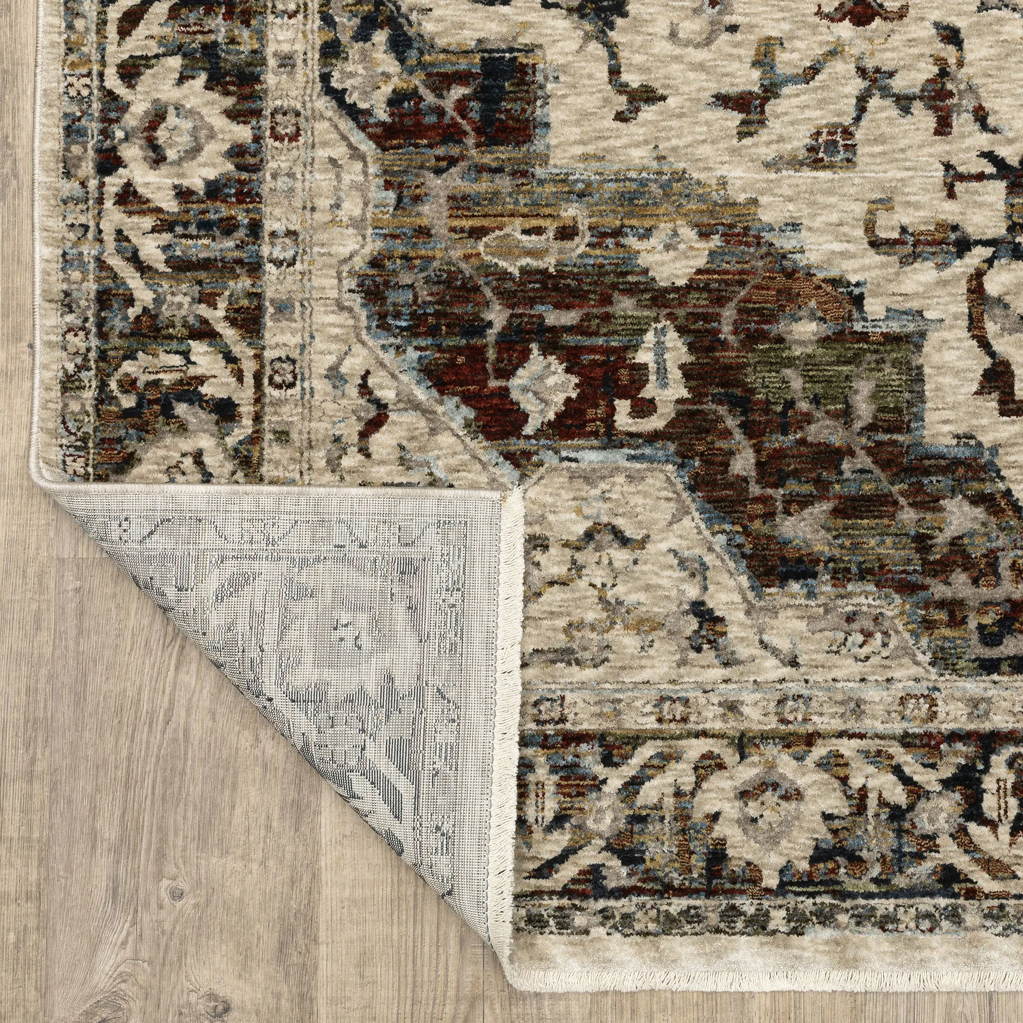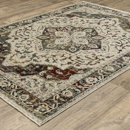 Ornate motifs look stunning on the Valyrie Rug. Power-loomed area rug, .32" thick, is made with incredibly soft space-dyed polyester and shrink polyester, has a high density and a low profile, and features a medallion design. Colors include shades of blue, green, burgundy, gold, gray, ivory, parchment, and tan. The length ends have .5"L ivory fringe. Backing is woven polyester. We recommend professional cleaning by a rug cleaner. Imported.