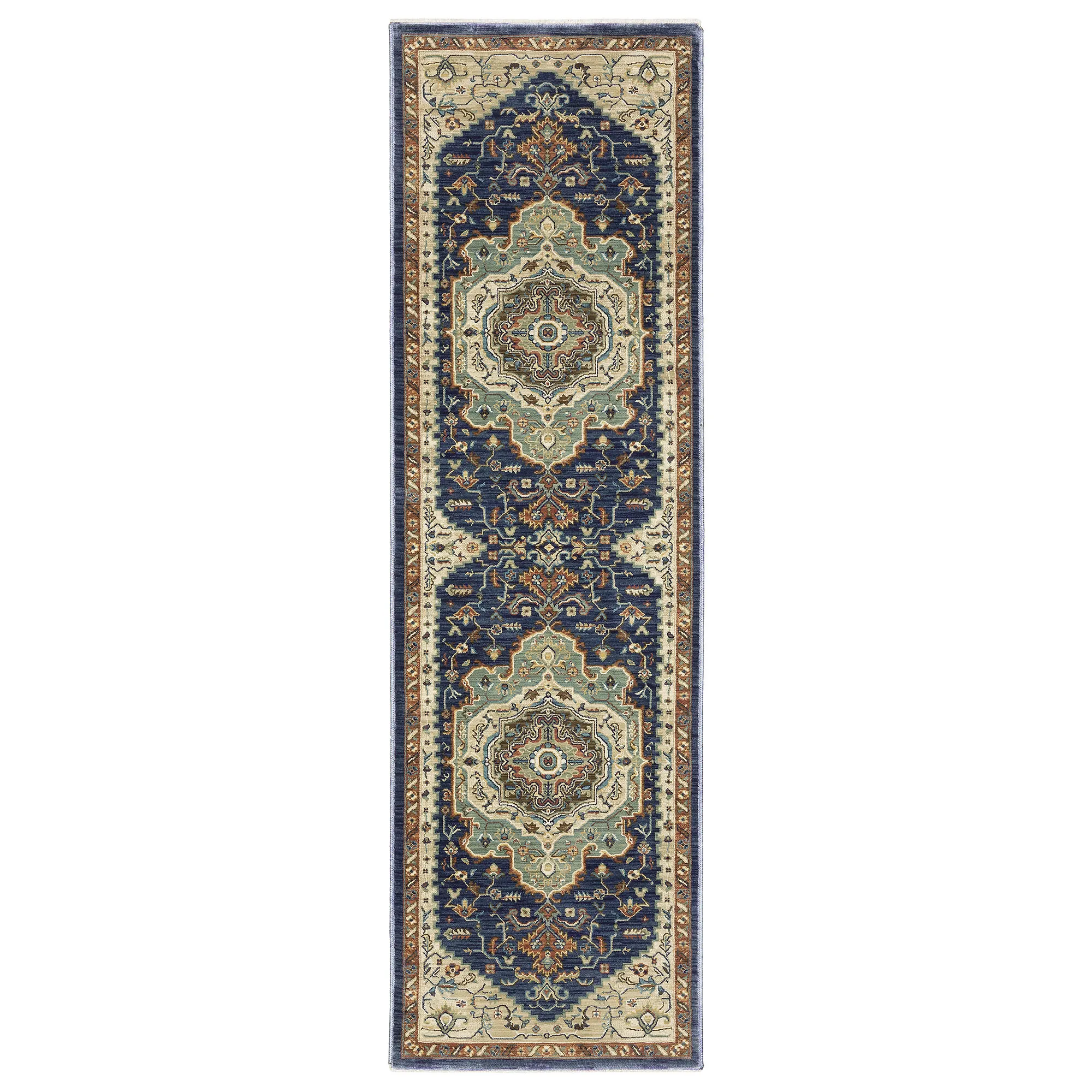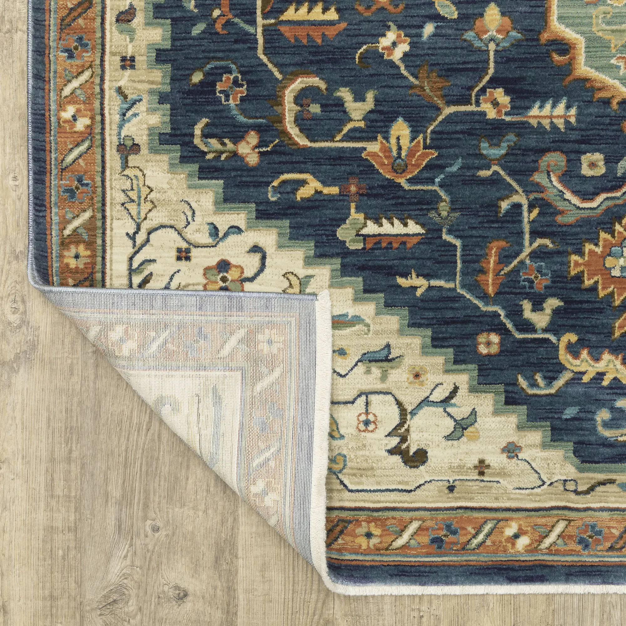 The contrasting colors on the background of the Vardell Blue Area Rug beautifully showcase the vining floral designs. This space-dyed, power-loomed polypropylene area rug for the living room, .31" thick, is super-soft and features ornate motifs. Fringe decorates the length ends on the rectangles. The blue coloration includes shades of navy, pale green, light blue, ivory, sand, and cinnabar. We recommend professional cleaning by a rug cleaner. Imported.