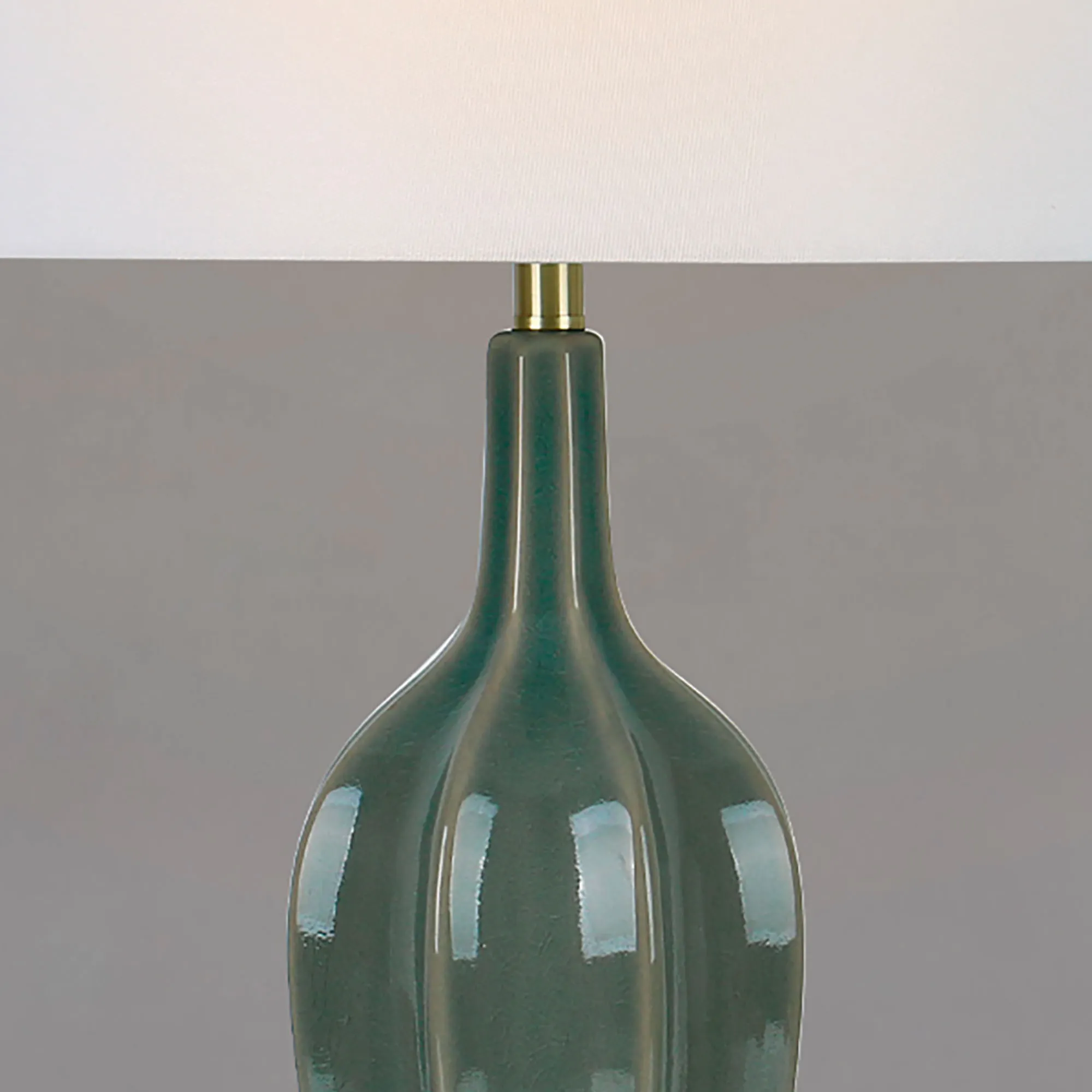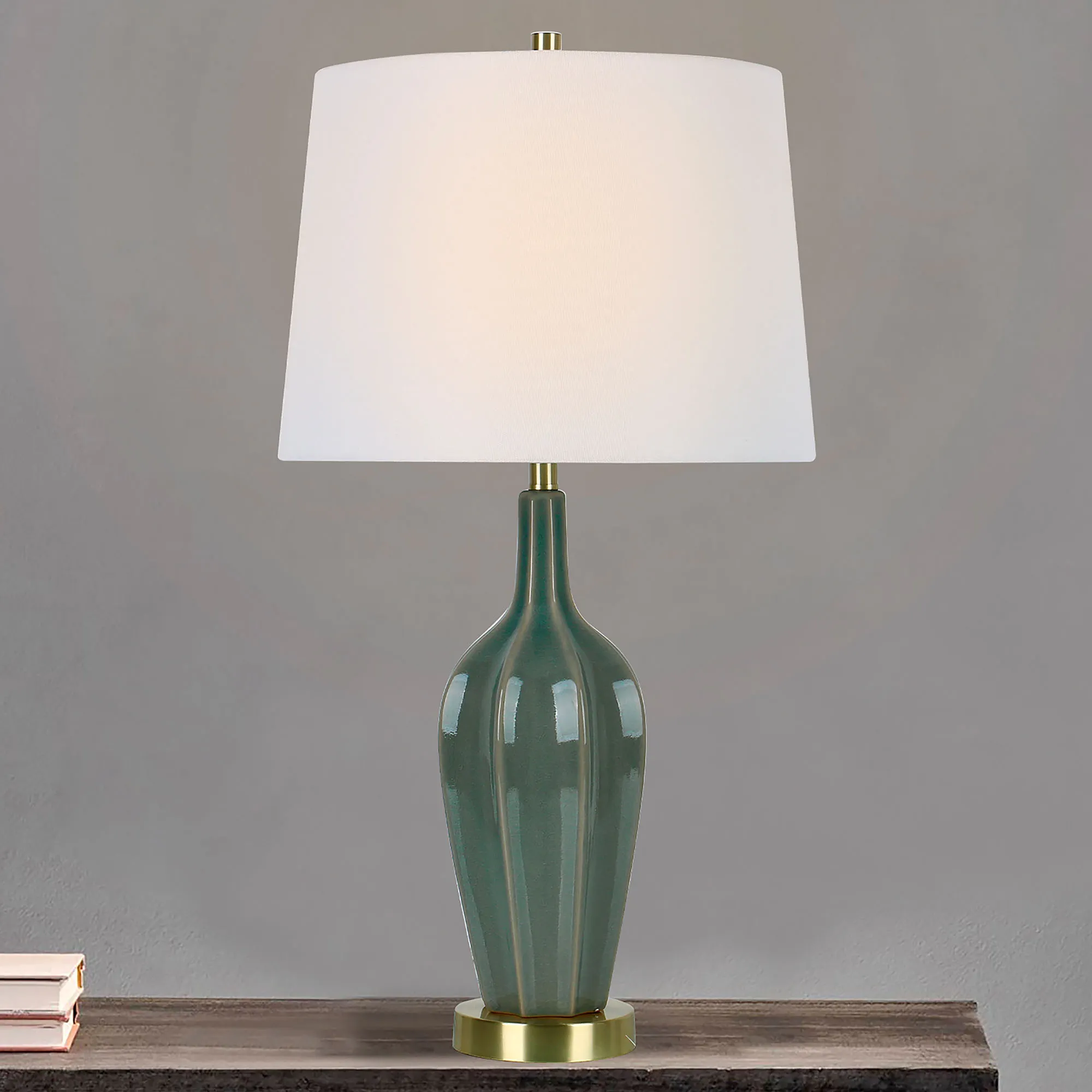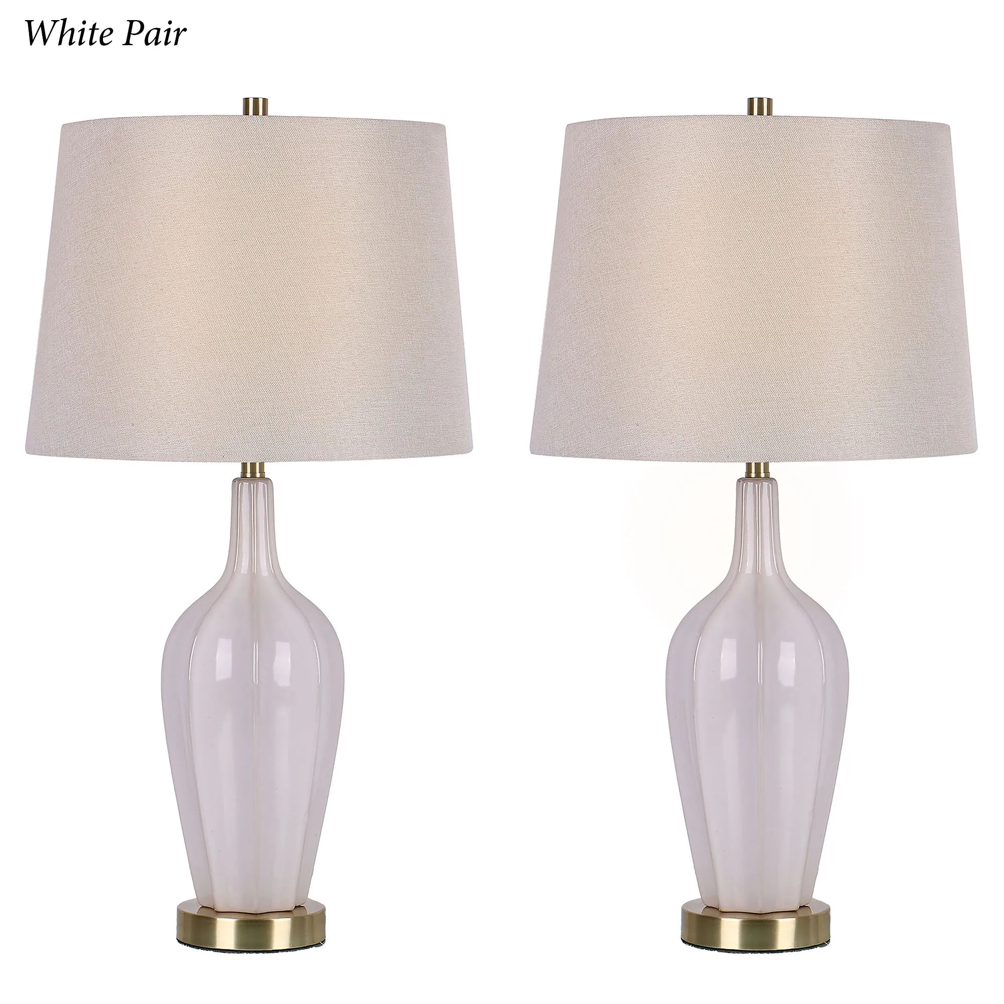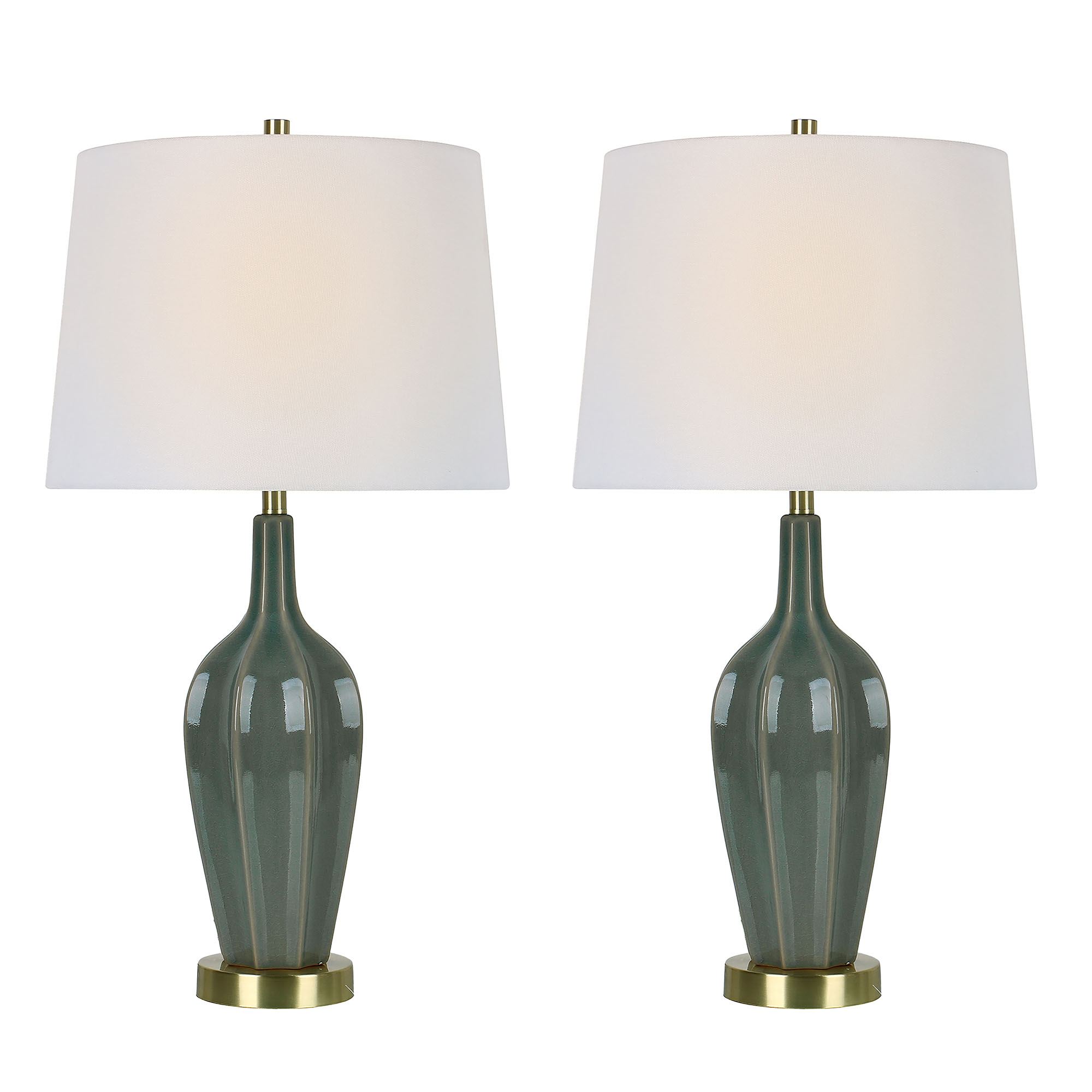 The Varese Table Lamp shines with a classic style. Atop a satin brass metal base, each solid color ceramic font features a uniquely stylized fluted urn shape topped with a cream linen tapered drum shade. UL listed. Each lamp requires one 100W max. bulb. Overall, each table lamp measures 14"dia.x26.5"H, including the matching metal finial. Pair weighs 14 lbs.