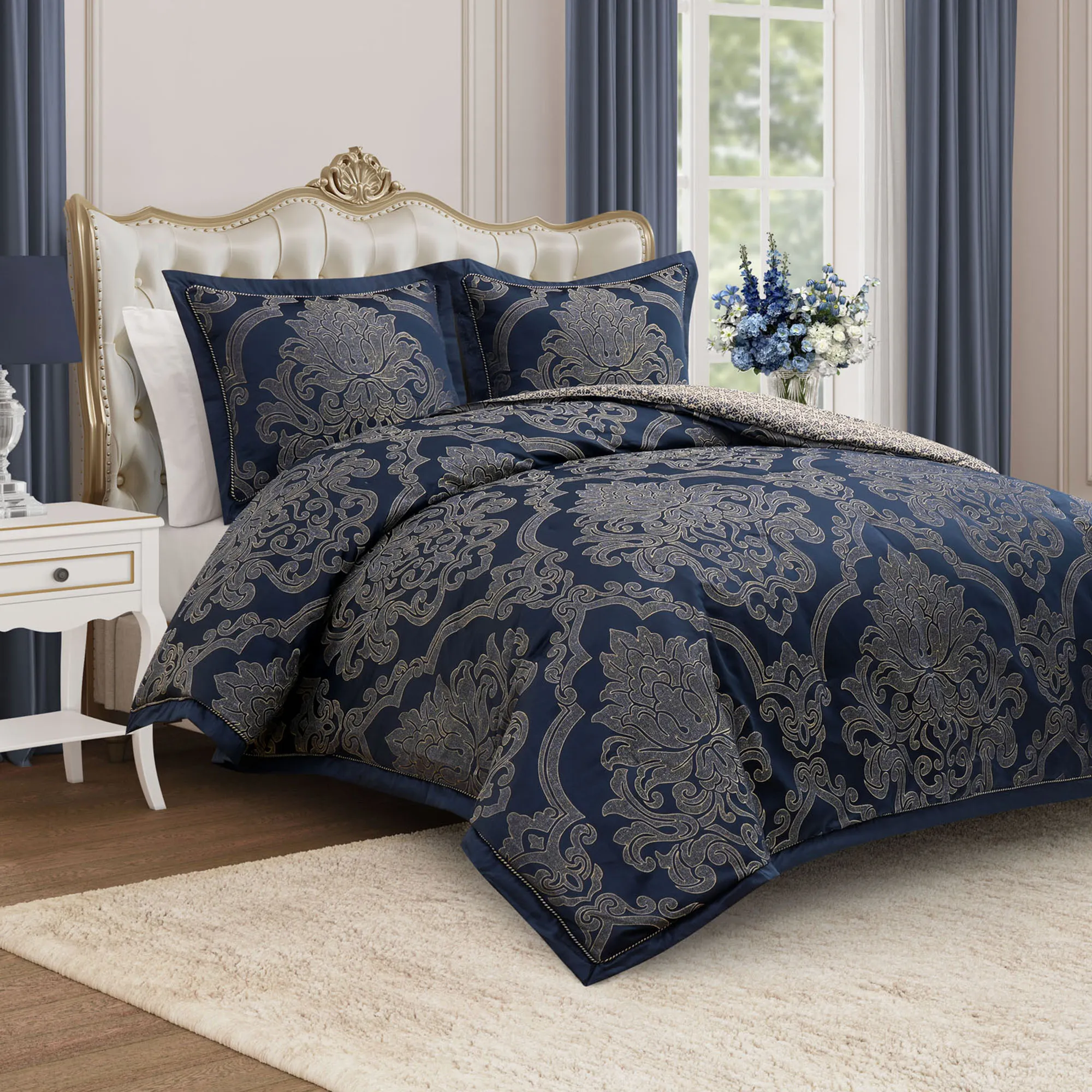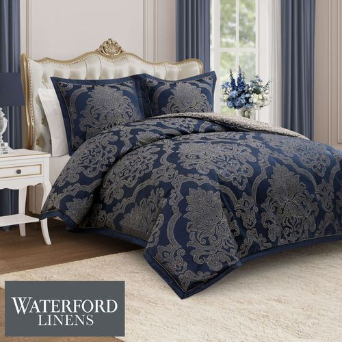 Vaughn Navy Damask 3 pc Comforter Set Luxury Bedding by Waterford Linens
