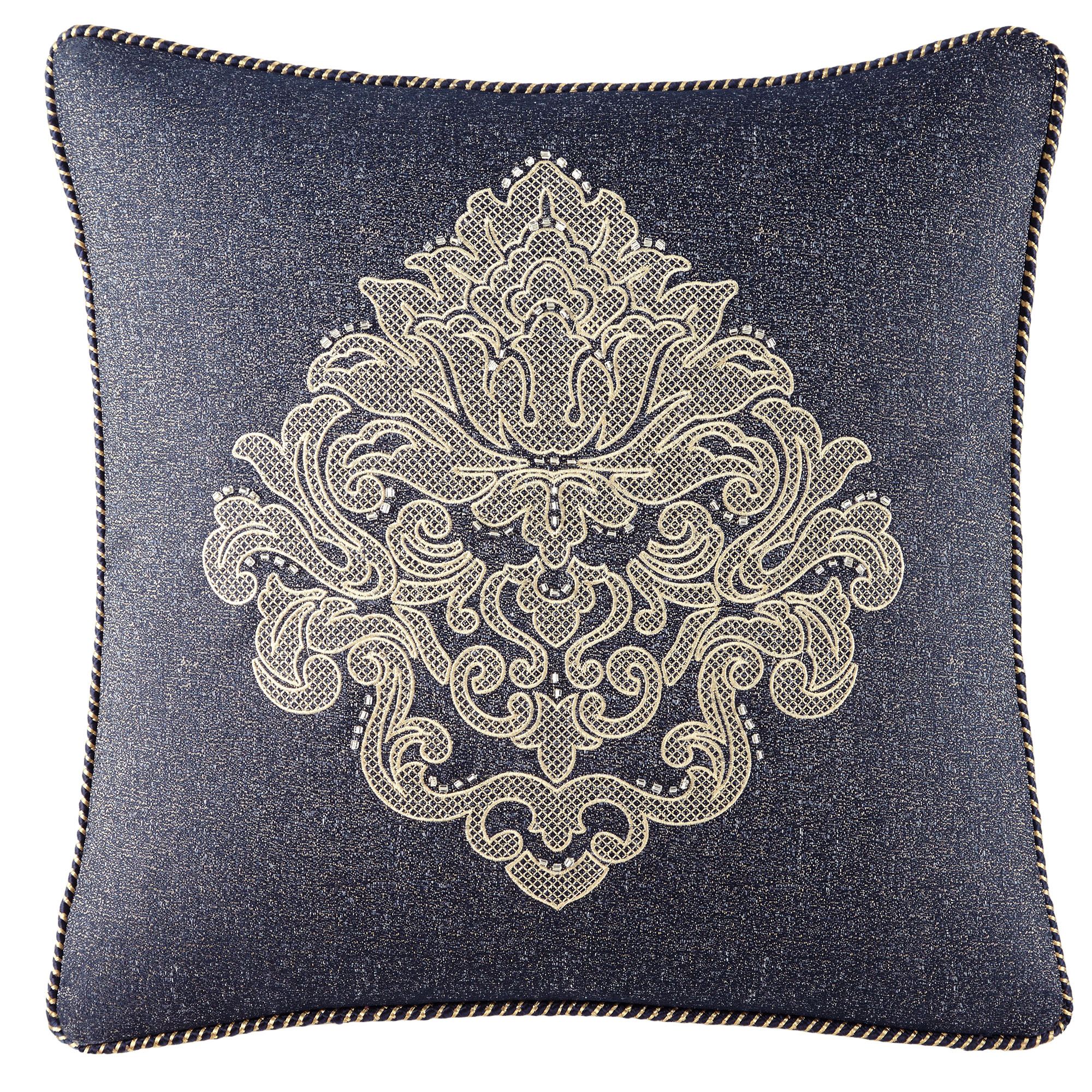 Pillows have zipper closures. The Envelope Rectangle has a woven scroll tile design, a solid navy envelope flap detailed with a tassel, and twist cording; reverses to solid navy with an envelope flap of woven scroll tile motifs. The 14" Square has gold sequins and twist cording. The 18" Square has an embroidered, light gold damask medallion and beads on a textured background and braid cording.