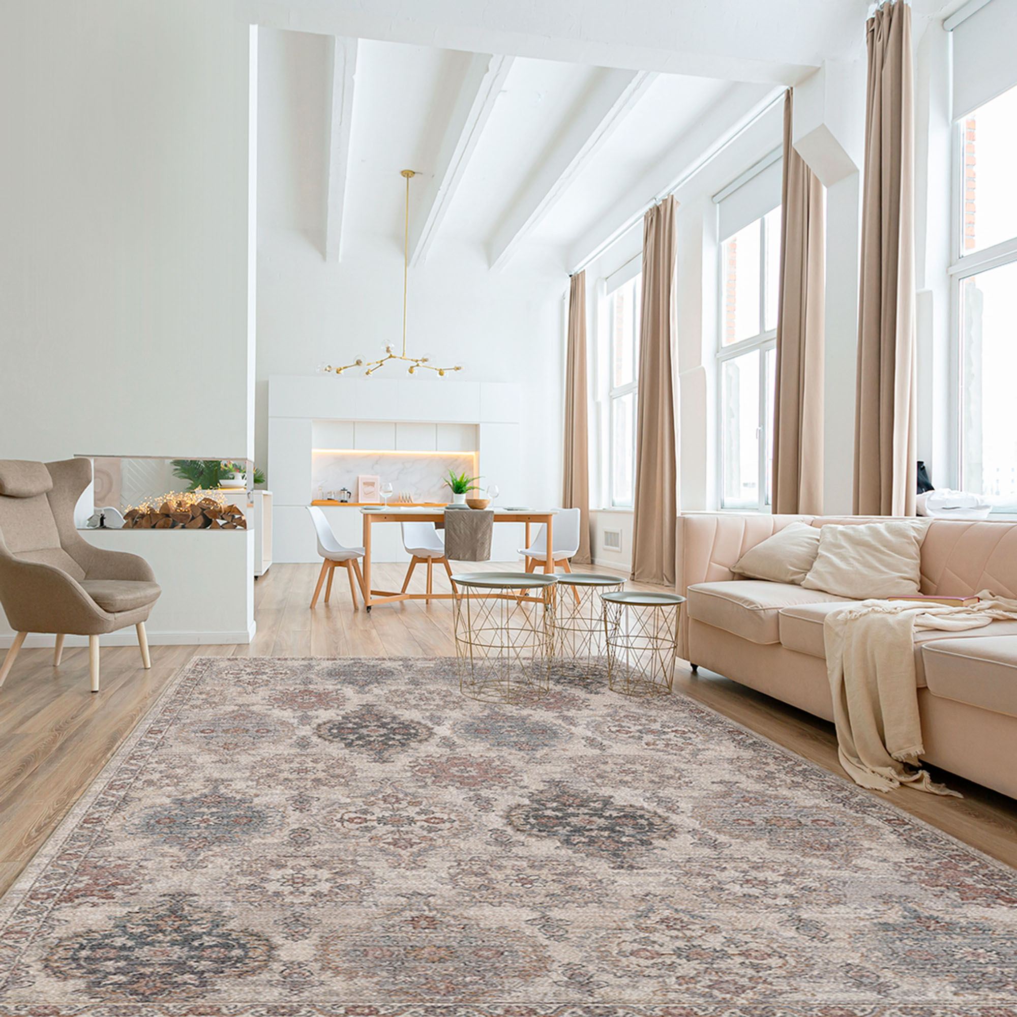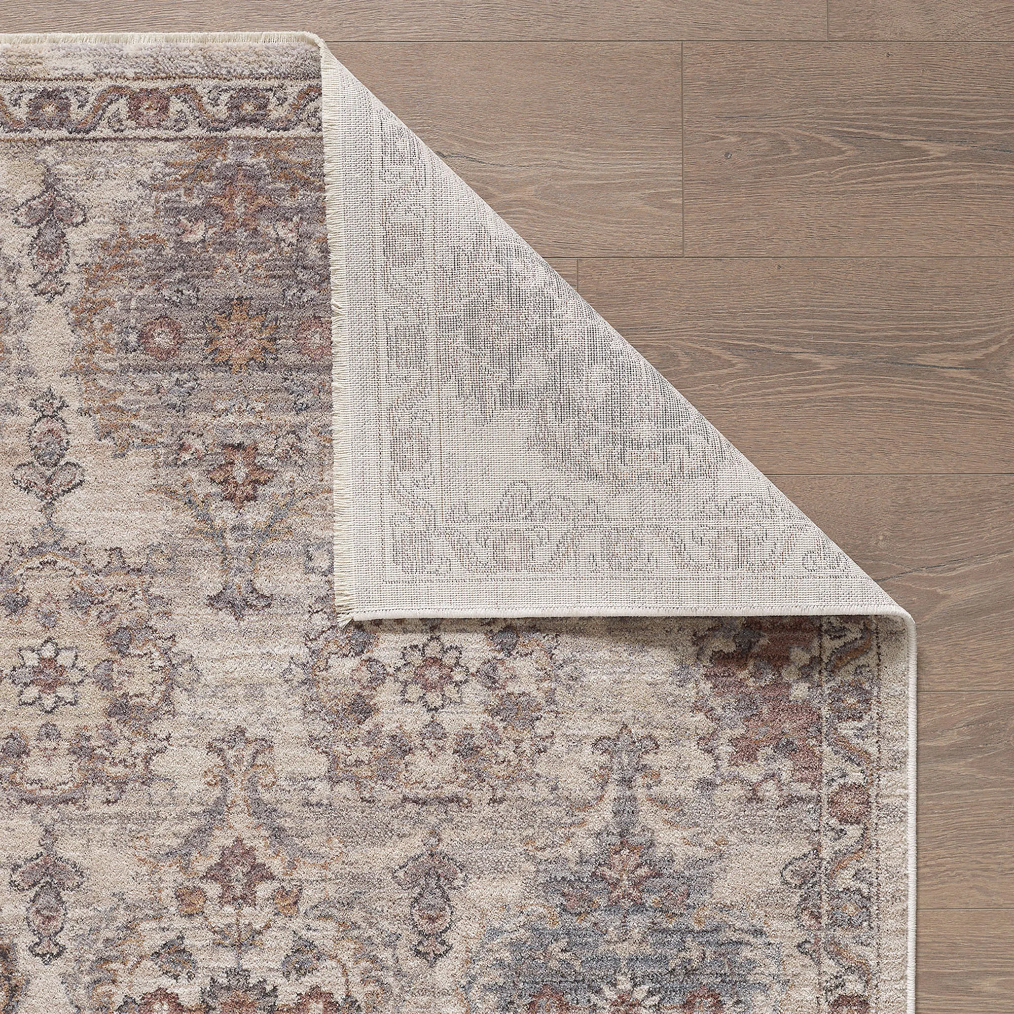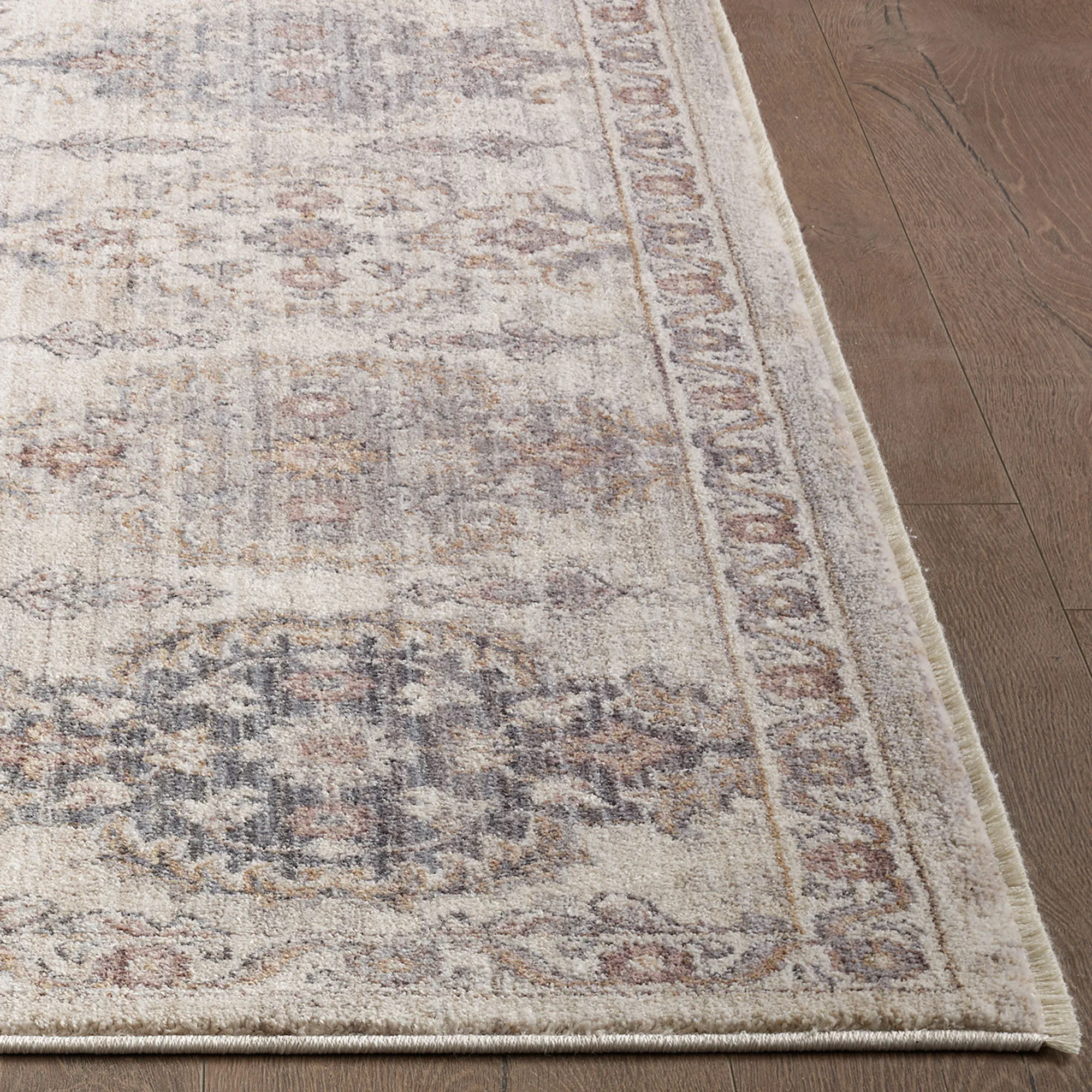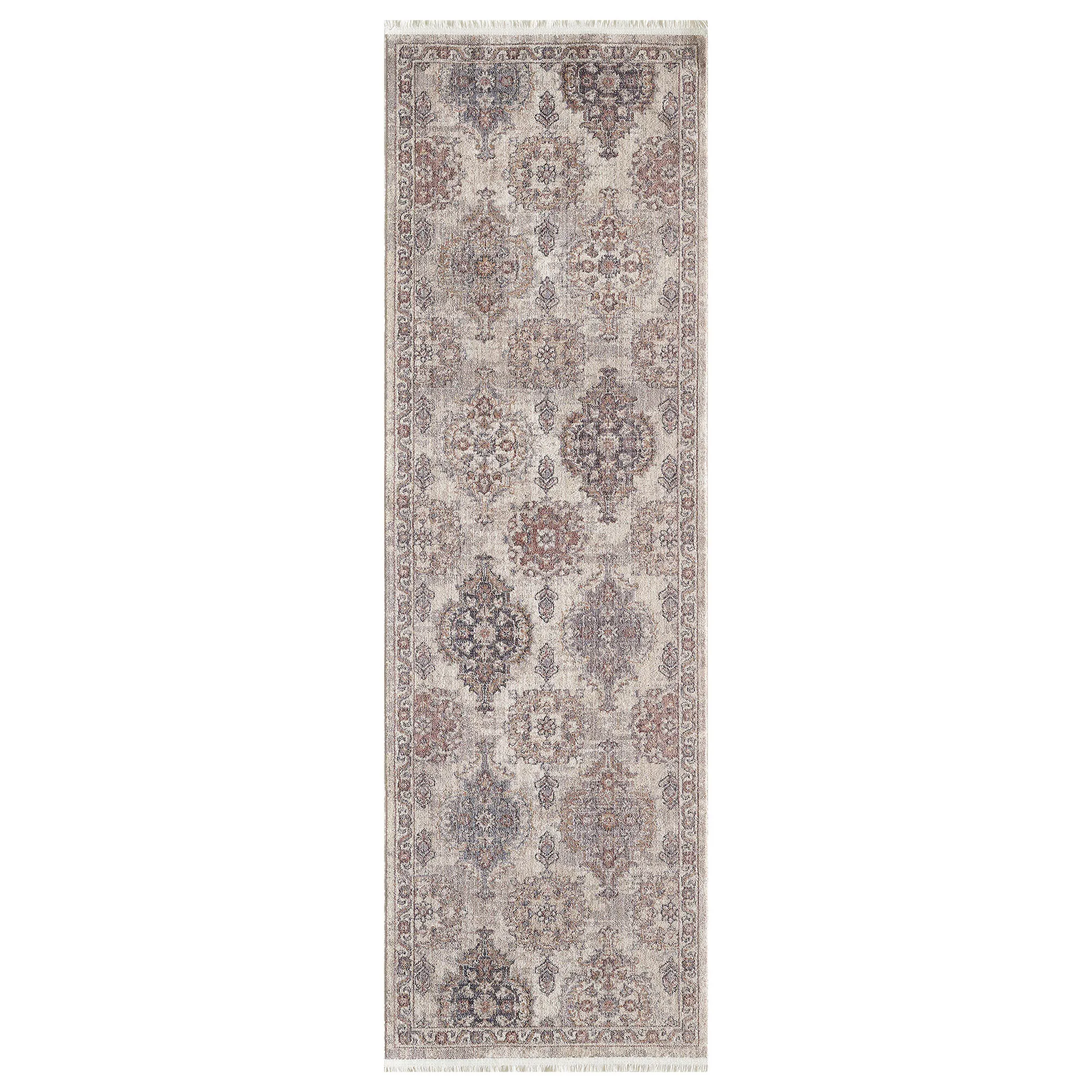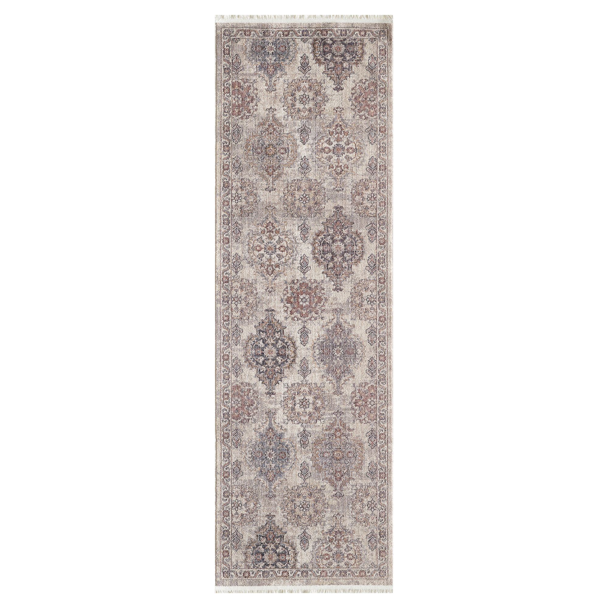 The mosaic of ornate medallion designs always looks sophisticated on the Venetia Rug. This power-loomed polyester area rug, .5" thick, has intricate motifs and .25"L length-end fringe. Colors include neutral hues of gray, ivory, tan, taupe, mauve, and blue. We recommend professional cleaning by a rug cleaner. Imported.