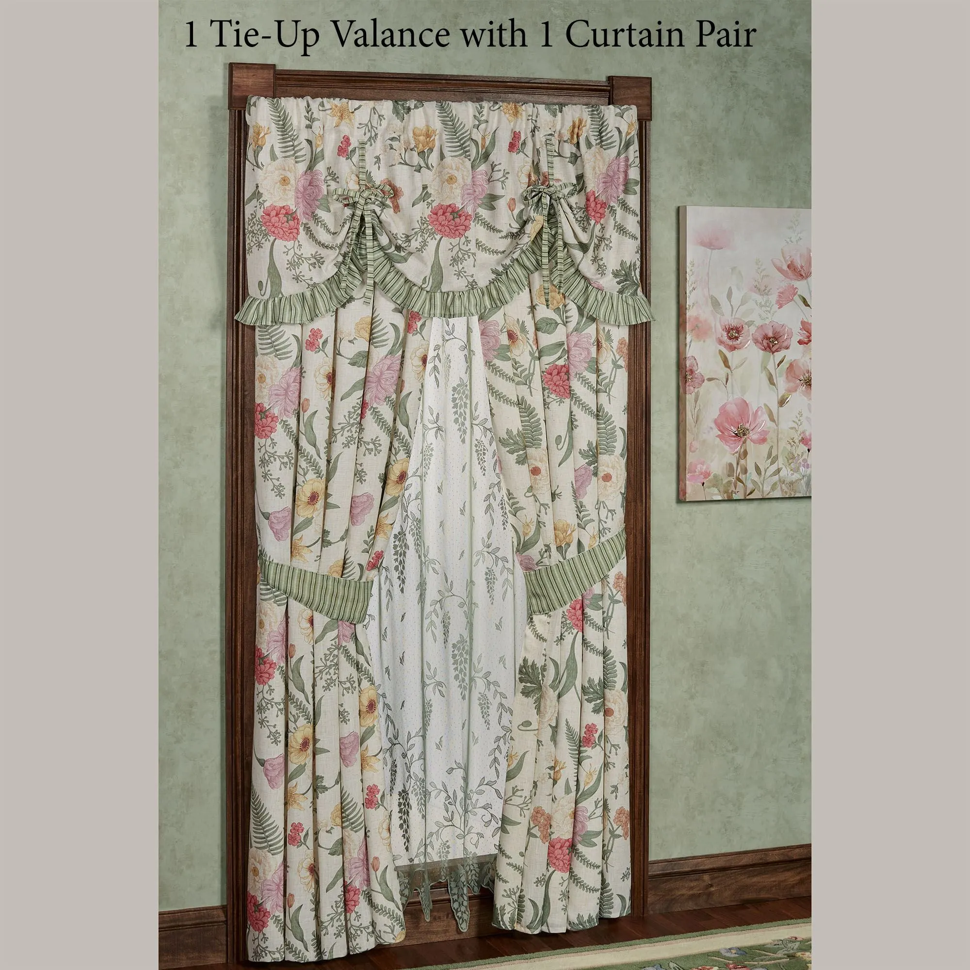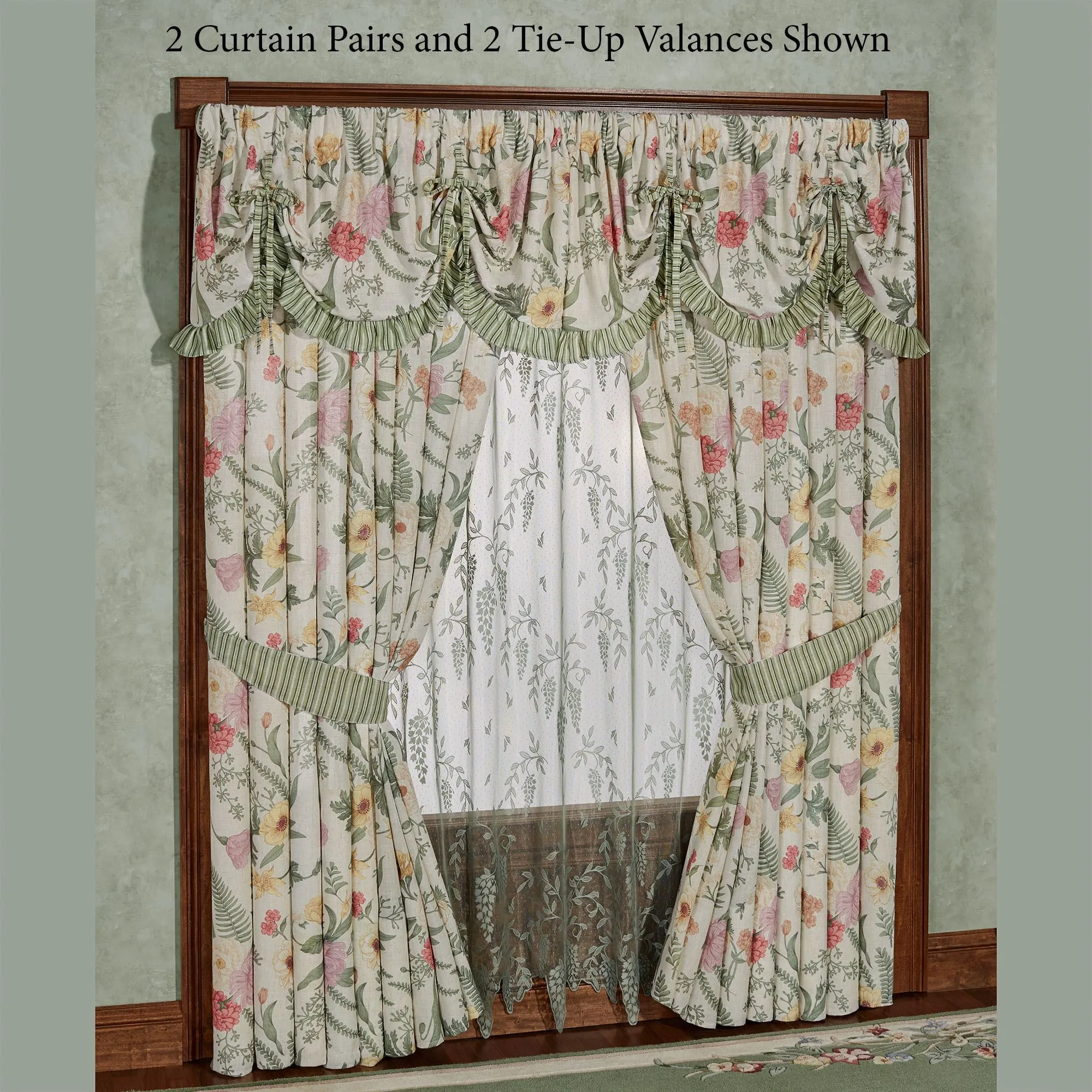 Lined Window Treatments have florals and 3" rod pockets. The tailored Curtains include reversible tiebacks. The Scalloped Valance has pieced stripes on the bottom and gimp trim. The Tie-Up Valance is pieced with a striped ruffle and ties.