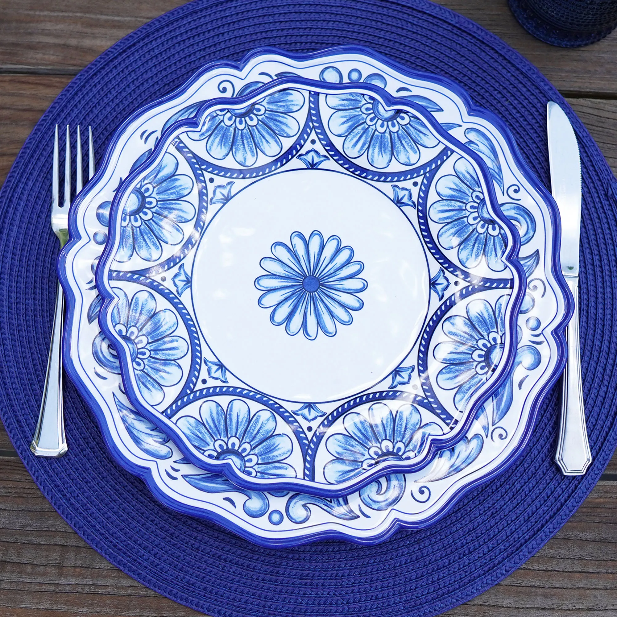 • Dishwasher-safe plates have scalloped edges