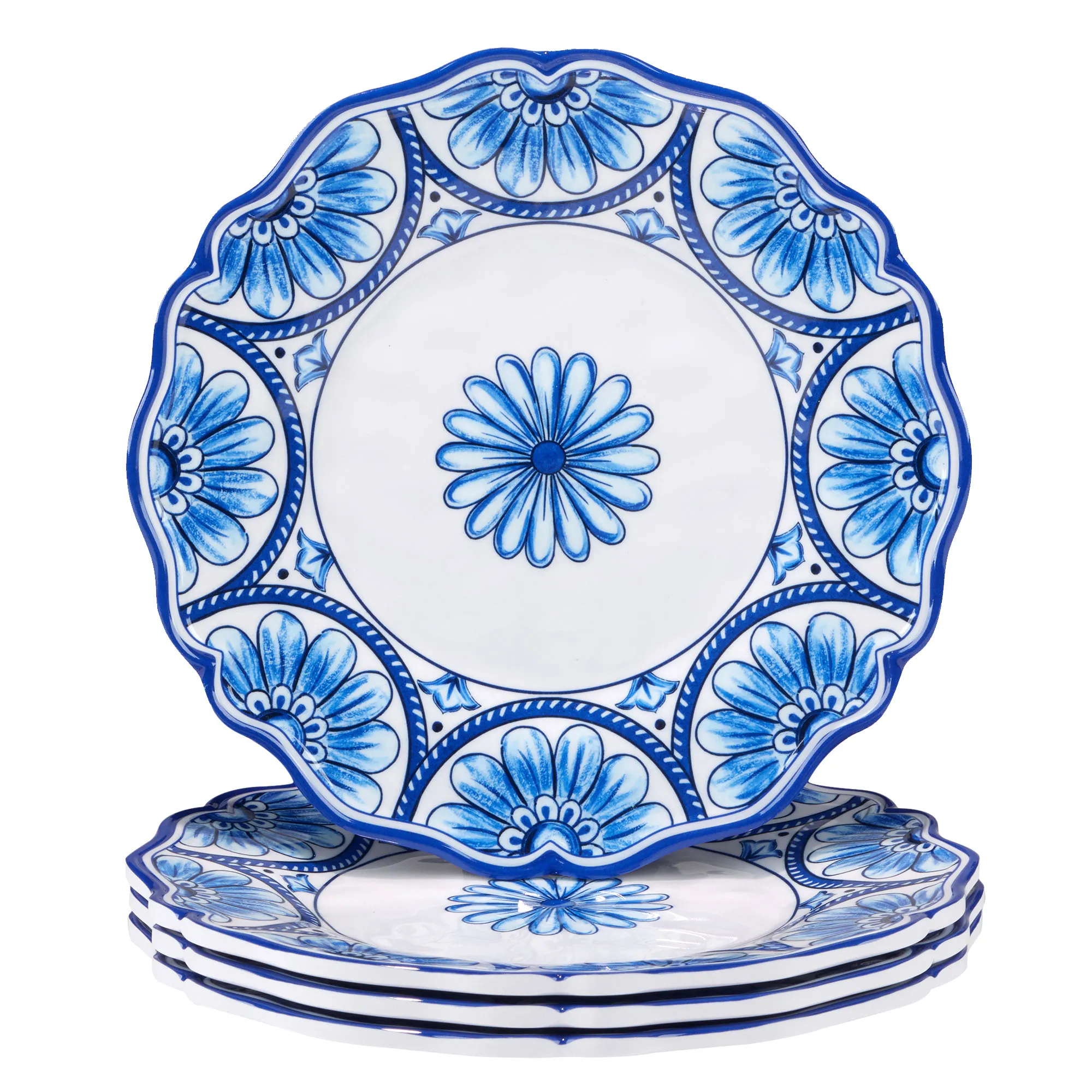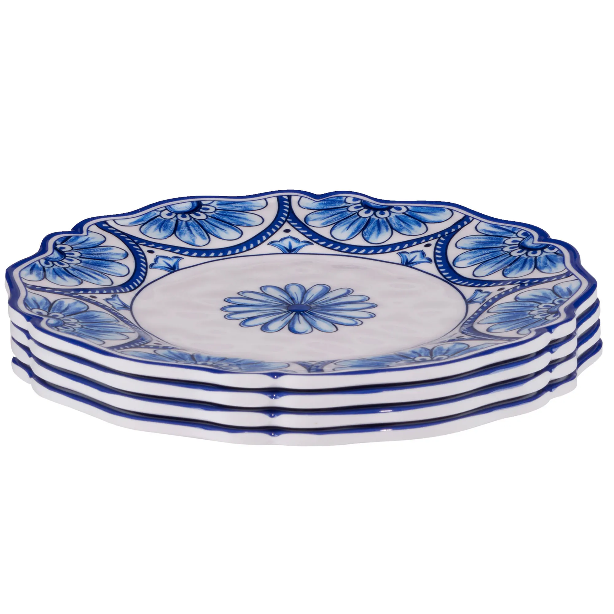 Floral medallion and half-round flower designs in stunning shades of blue dazzle the Veranda Dessert Plate Set. These melamine dessert plates, by artist (C)Nancy Green, have scalloped edges, ornate designs on white, and a gloss finish. Durable plates are scratch-resistant, BPA-free, and stackable. Food safe. Dishwasher safe. Do not use in the microwave. Indoor or outdoor year-round use. Each plate measures 9" dia.