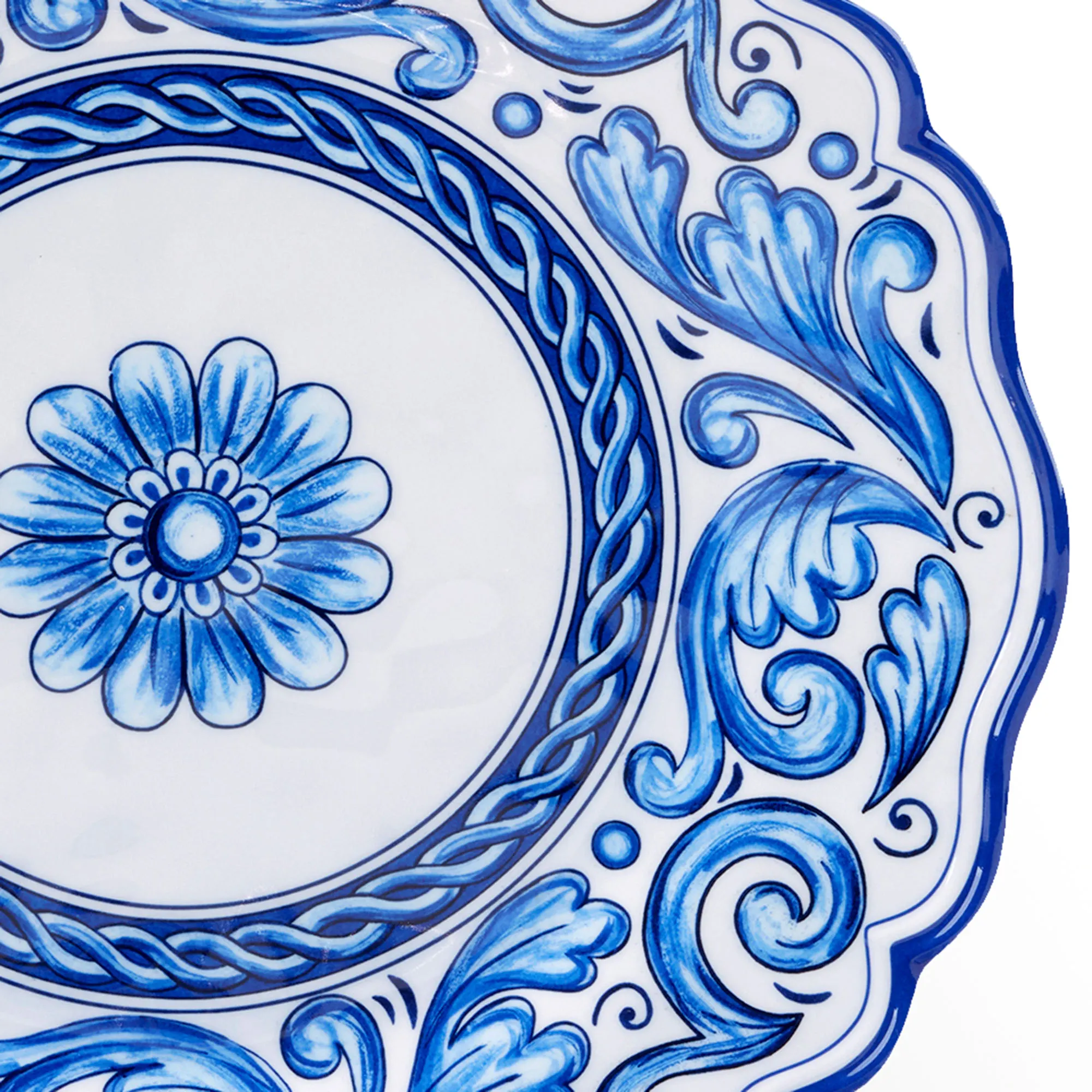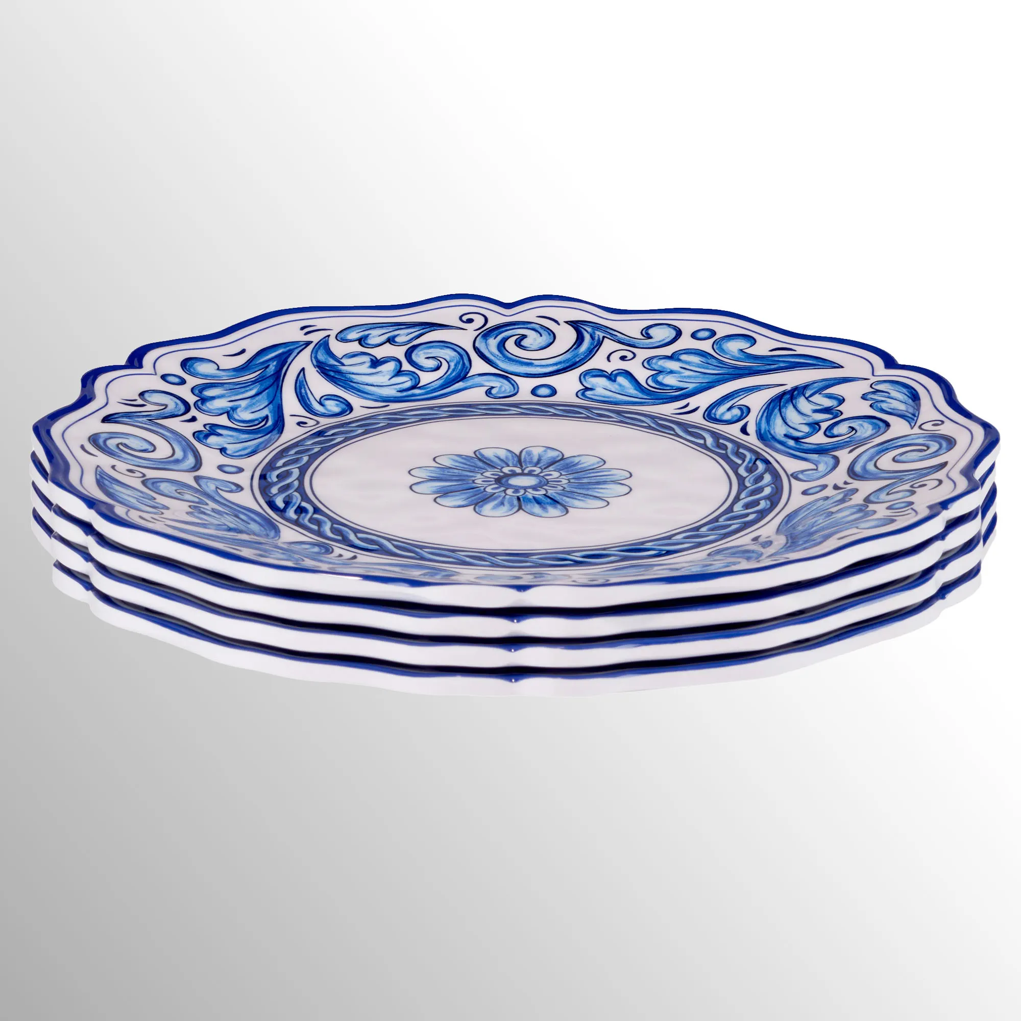 Floral medallion and acanthus leaf designs in stunning shades of blue dazzle the Veranda Dinner Plate Set. These melamine dinner plates, by artist (C)Nancy Green, have scalloped edges, ornate motifs on white, and a gloss finish. Durable plates are scratch-resistant, BPA-free, and stackable. Food safe. Dishwasher safe. Do not use in the microwave. Indoor or outdoor year-round use. Each plate measures 11" dia.