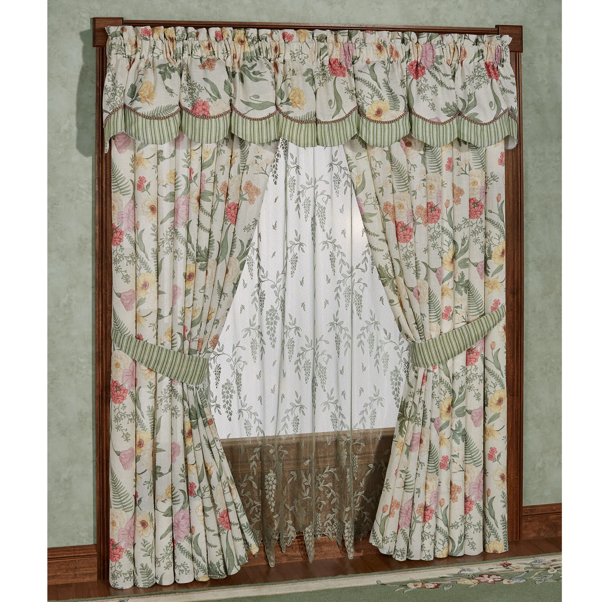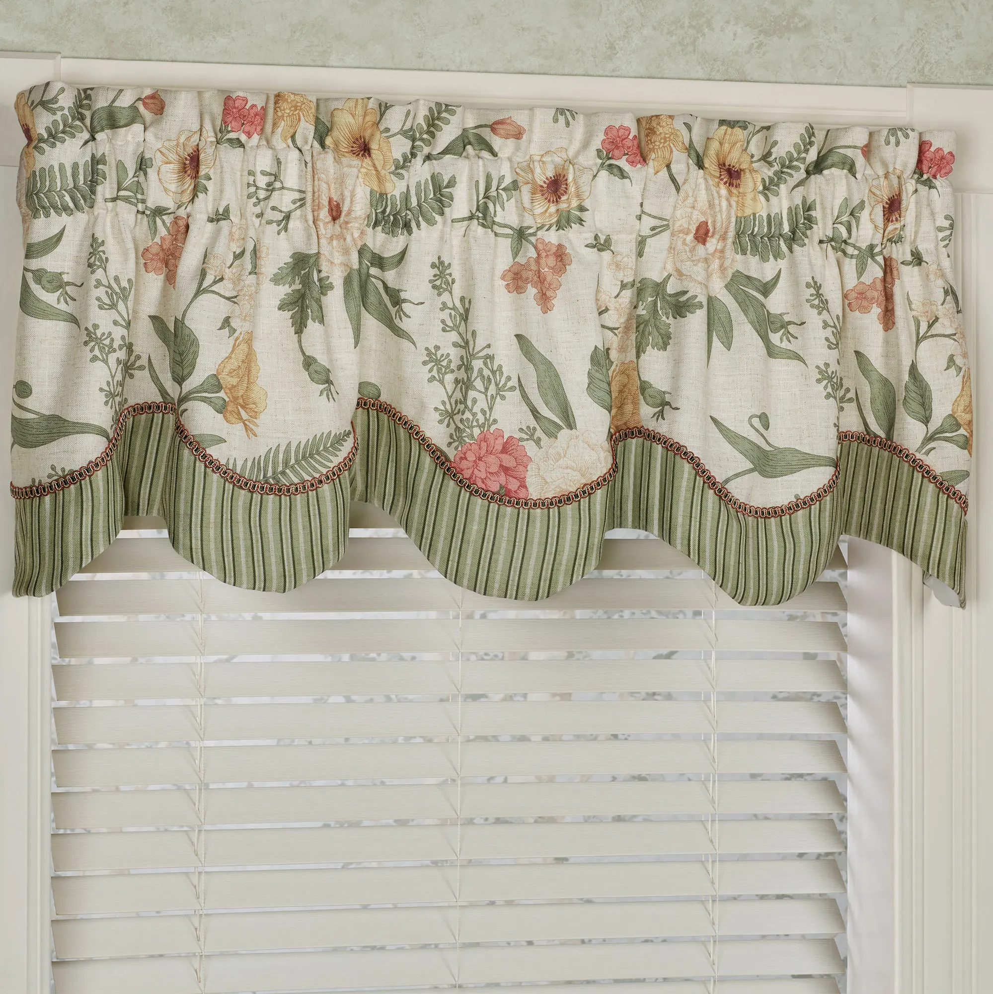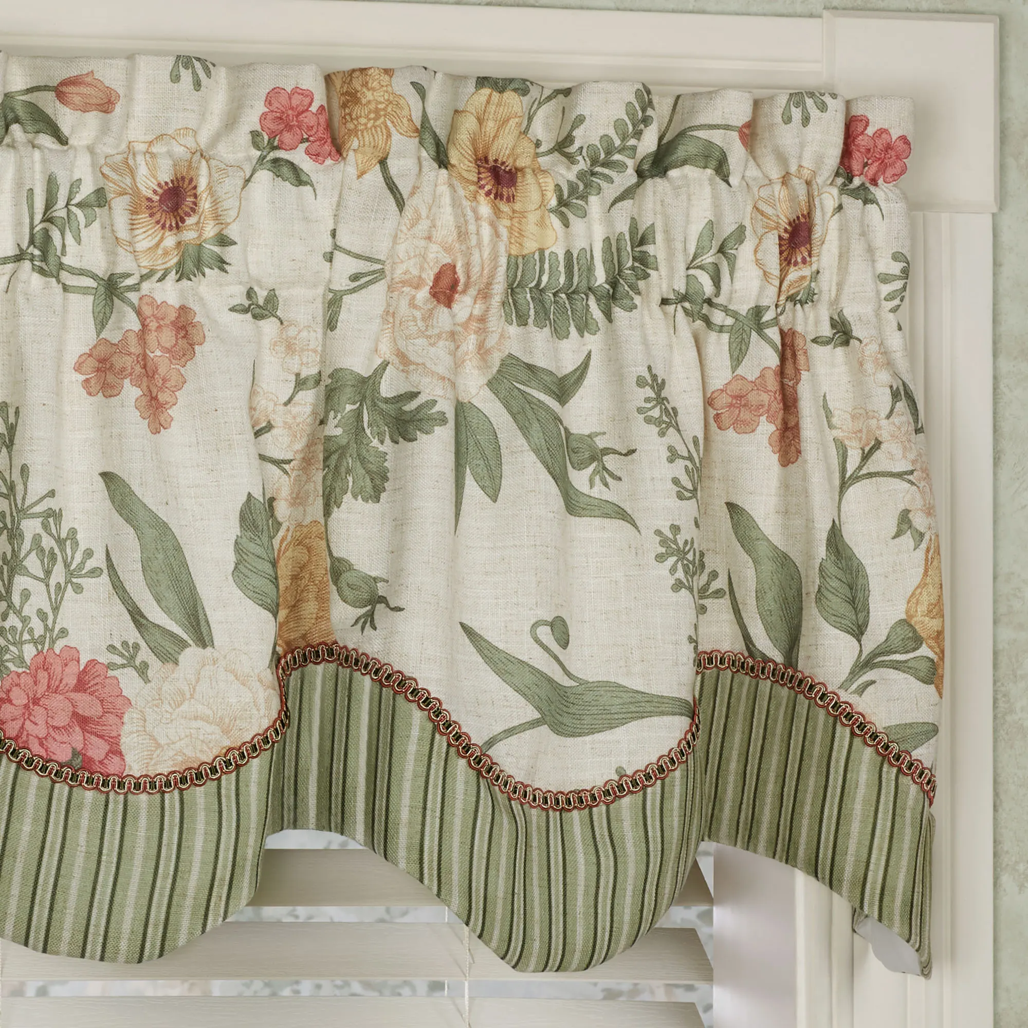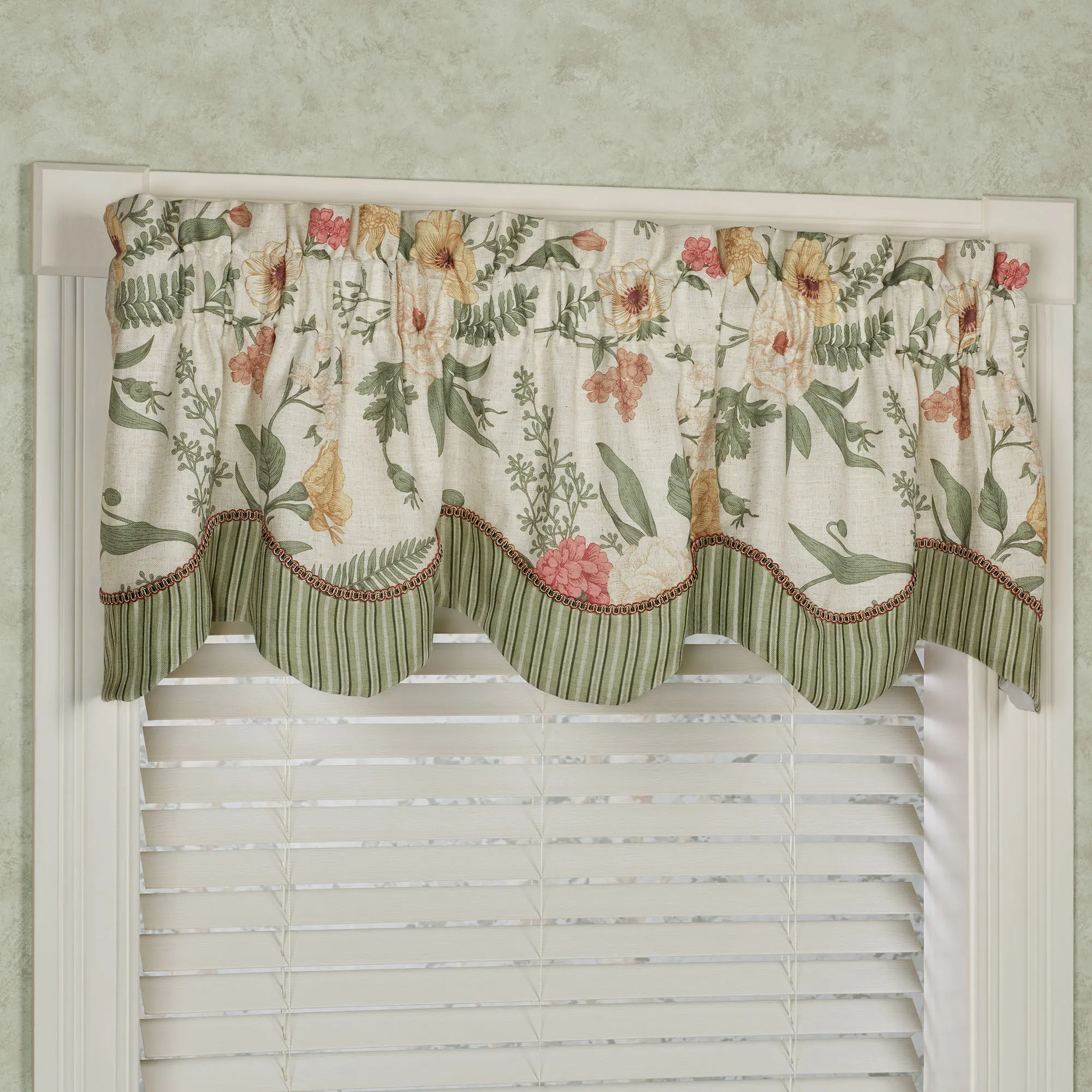 A blooming medley of flowers captures the wild beauty of the Veranda Floral Window Treatment. Printed lush leaves, delicate blooms, and stripes add sweet details to this polyester faux linen ensemble. Colors include shades of gold, green, dusty mauve, coral, olive, tarragon, linen, and natural. Lined window treatment has 3" rod pockets. Specify Scalloped Valance or Curtain Pair (no longer available). The Scalloped Valance has pieced stripes on the bottom and gimp trim. The tailored Curtains include reversible tiebacks. Machine washable. Imported. The curtain pair width is the total width of two panels together.