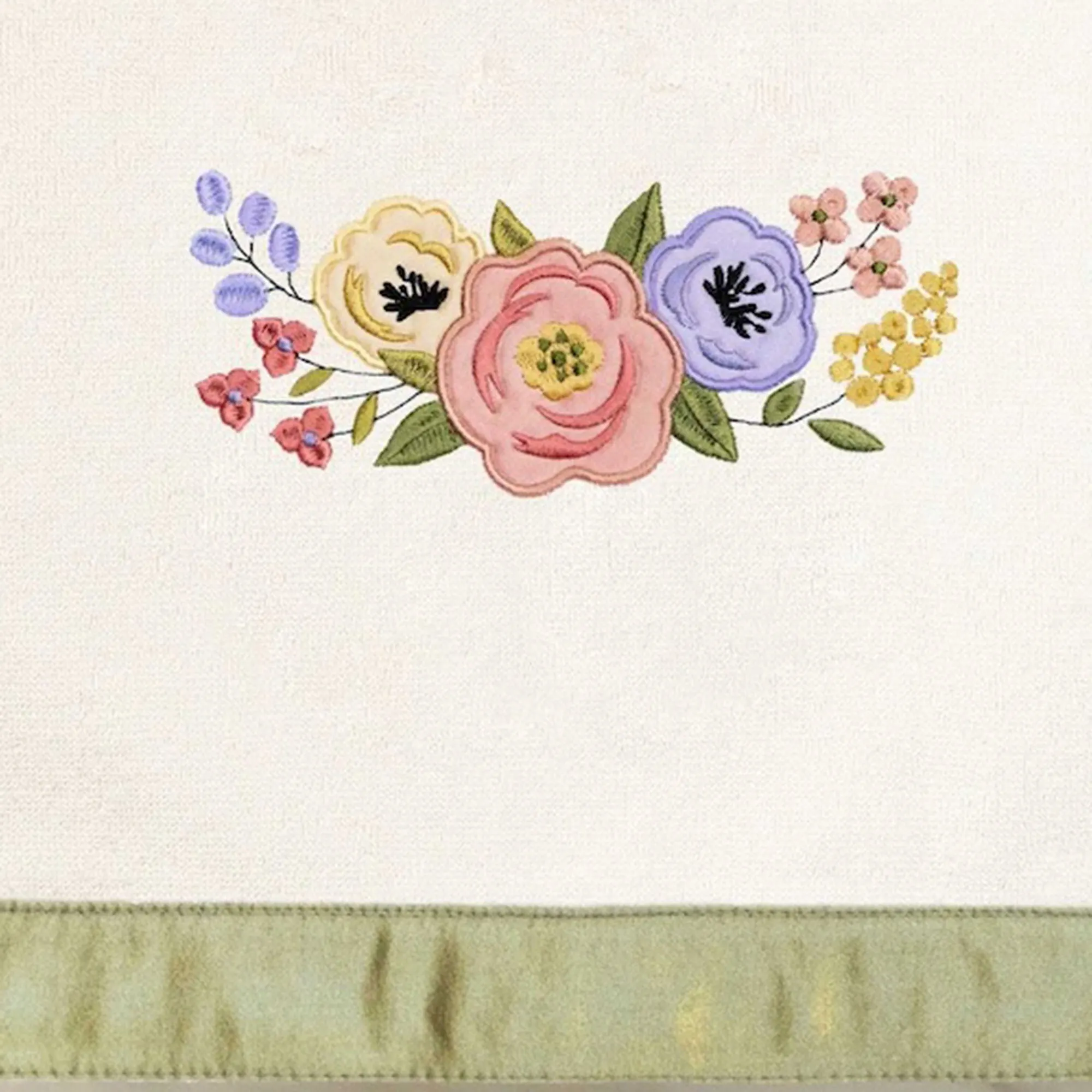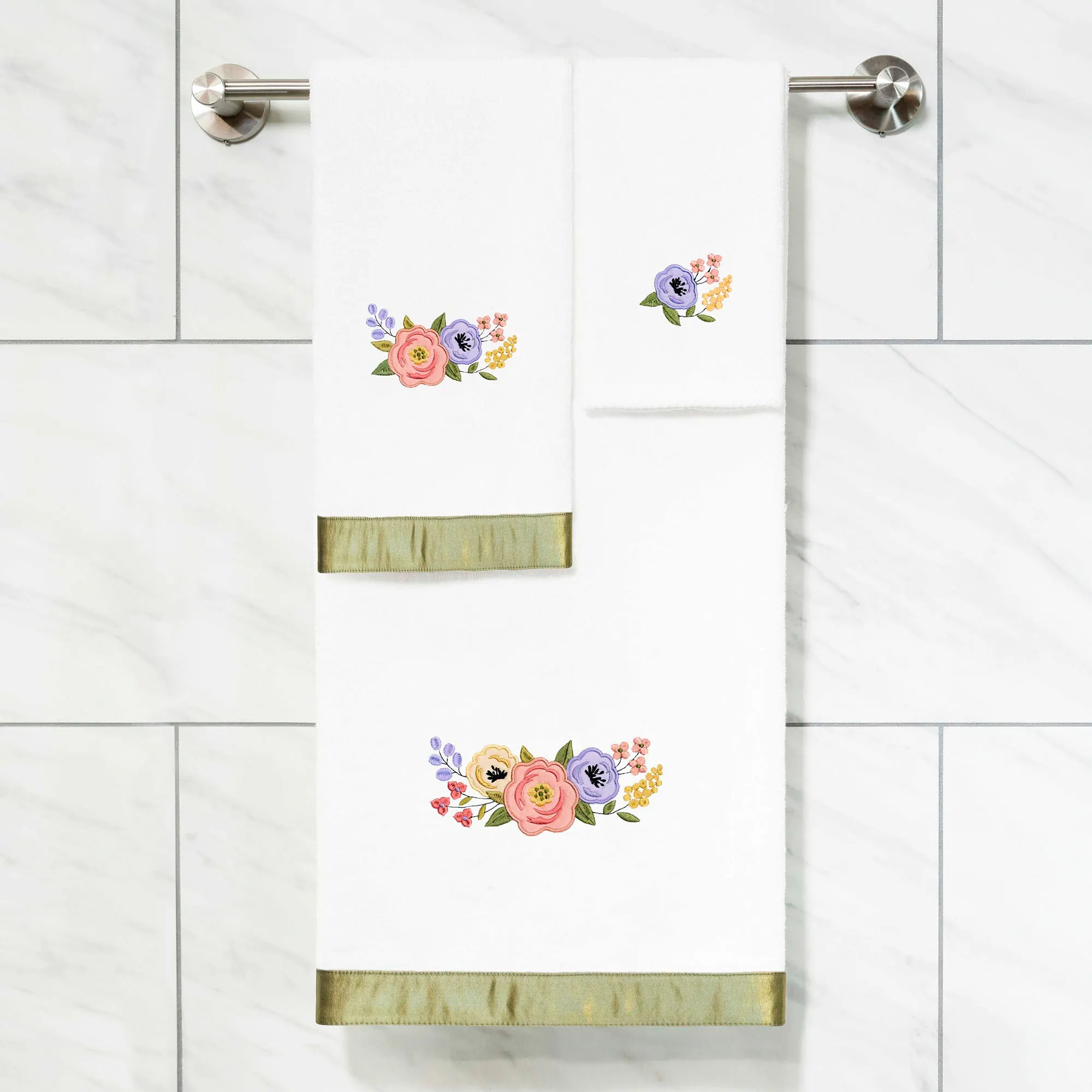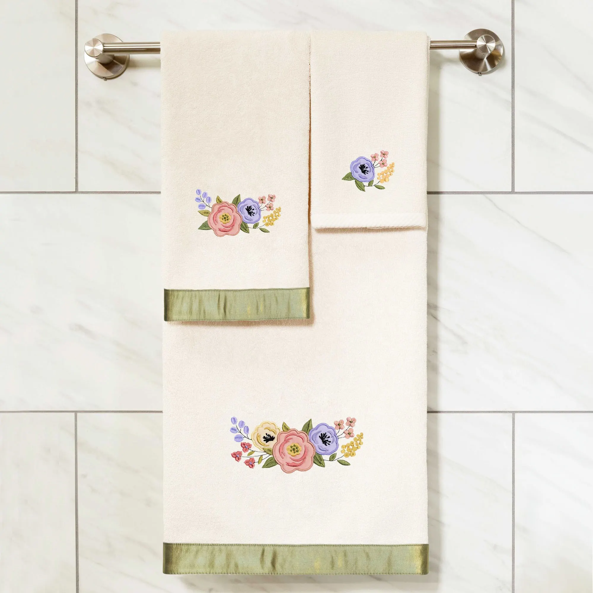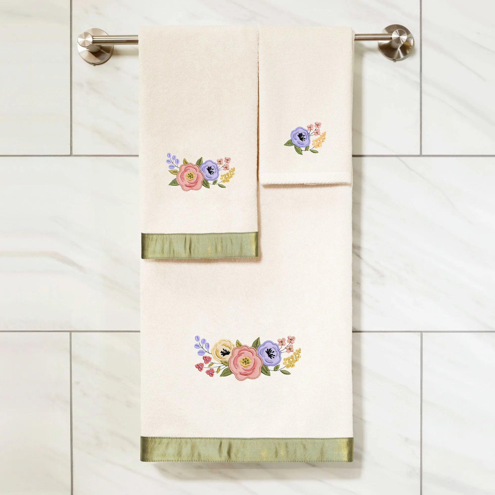 Pink, purple, and yellow flowers blossom from the Verano Bath Towel Set. With embroidered and applique designs, the sweet floral blooms and leaves decorate each towel with a bright, fresh spirit. The cloud-soft towels are crafted from 500 GSM premium Turkish cotton in a classic solid color and offer lasting absorbency, superior durability, and a quick drying experience. The lovely three-piece towel set includes one bath towel, 27"x54"; one hand towel, 16"x30"; and one fingertip towel, 11"x18". A lustrous green band adorns the edge of the bath towel and hand towel. Machine washable. Imported/USA.