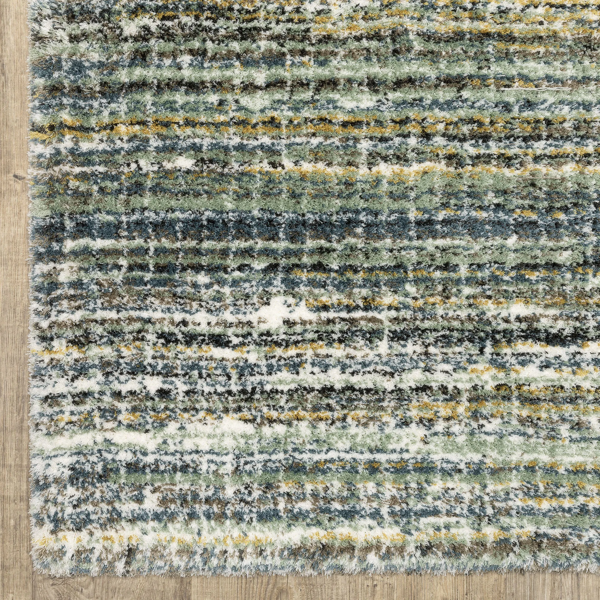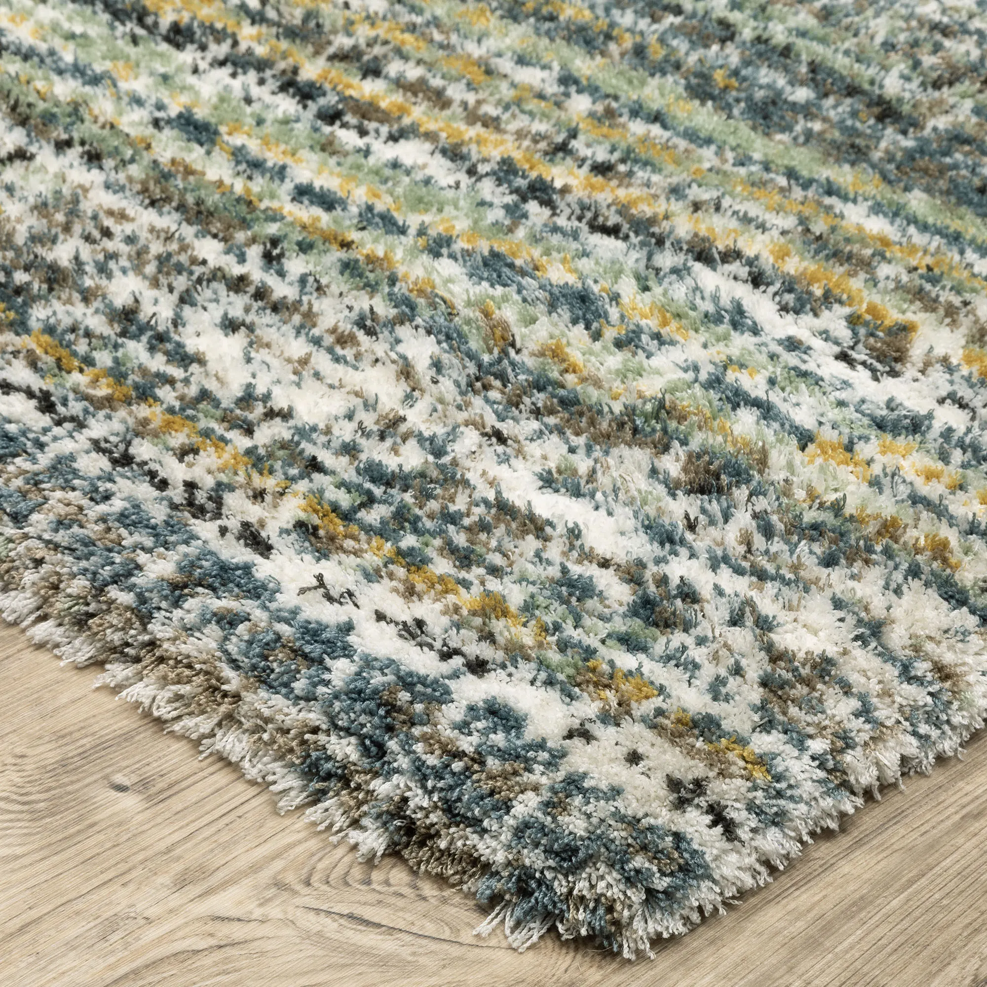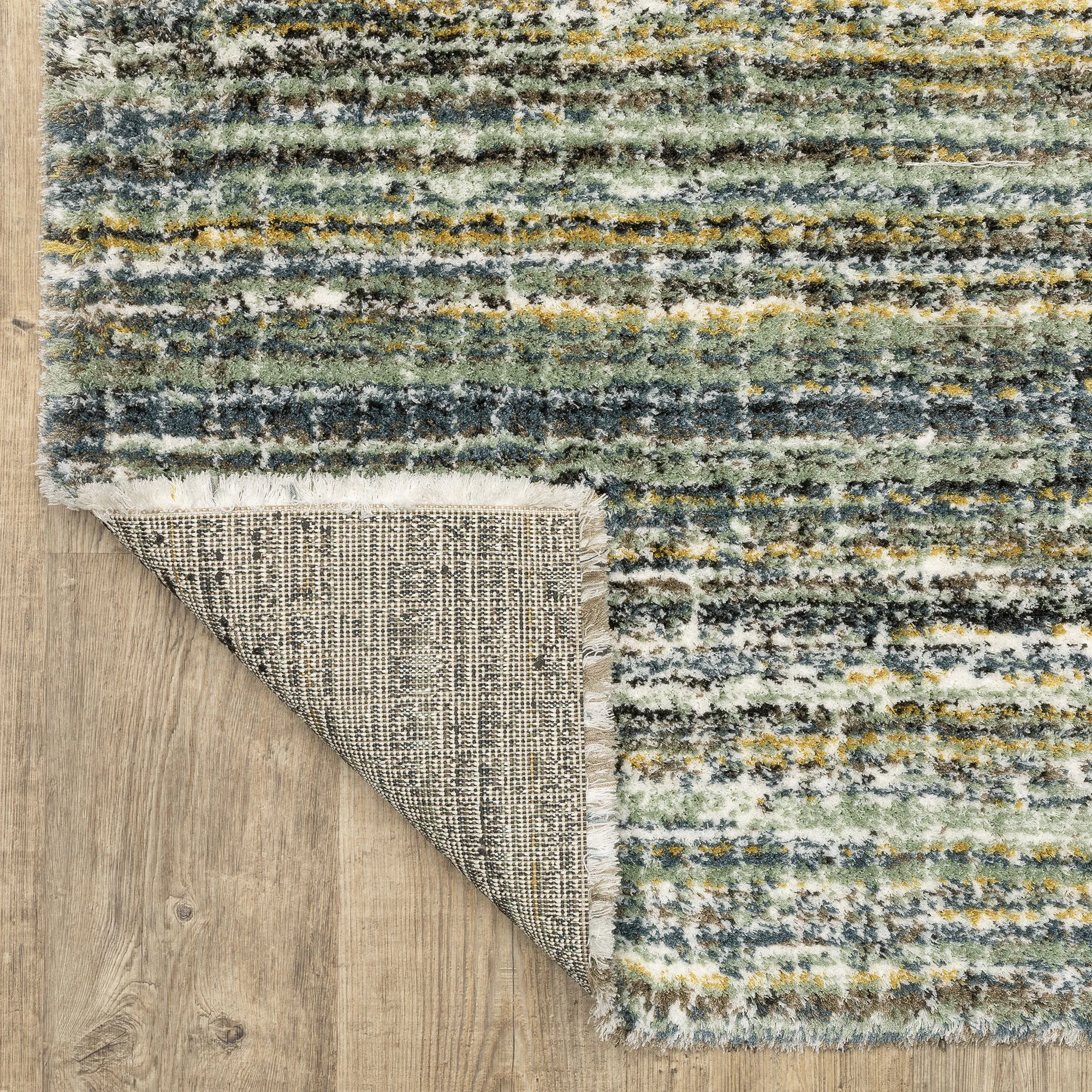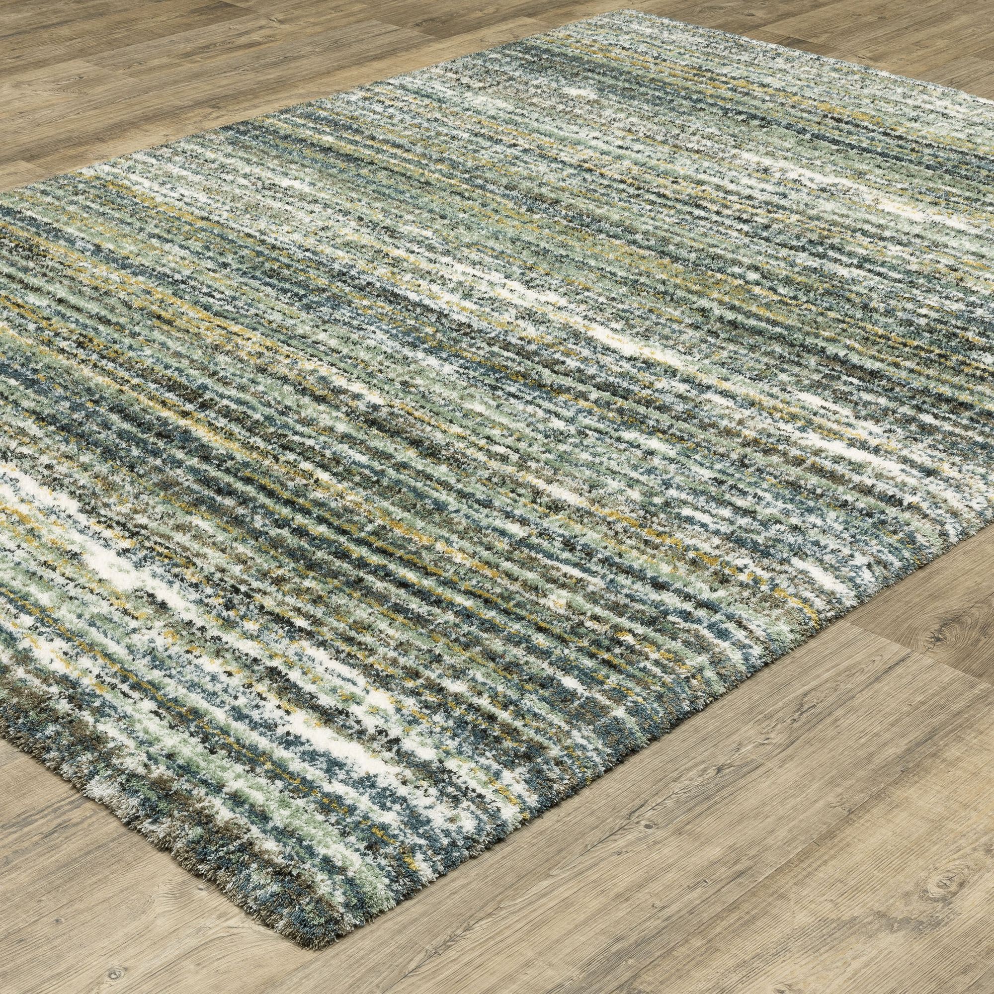 Decorate with the super-soft stripe pattern of the Verna Multi-Earth Rug. Power-loomed polyester microfiber area rug, .98" thick, has a dense pile and features a minimalist design. The multi-earth coloration includes shades of blue-green, blue, sage green, brown, ivory, golden yellow, and gray. Backing is woven polyester. We recommend professional cleaning by a rug cleaner. Imported.