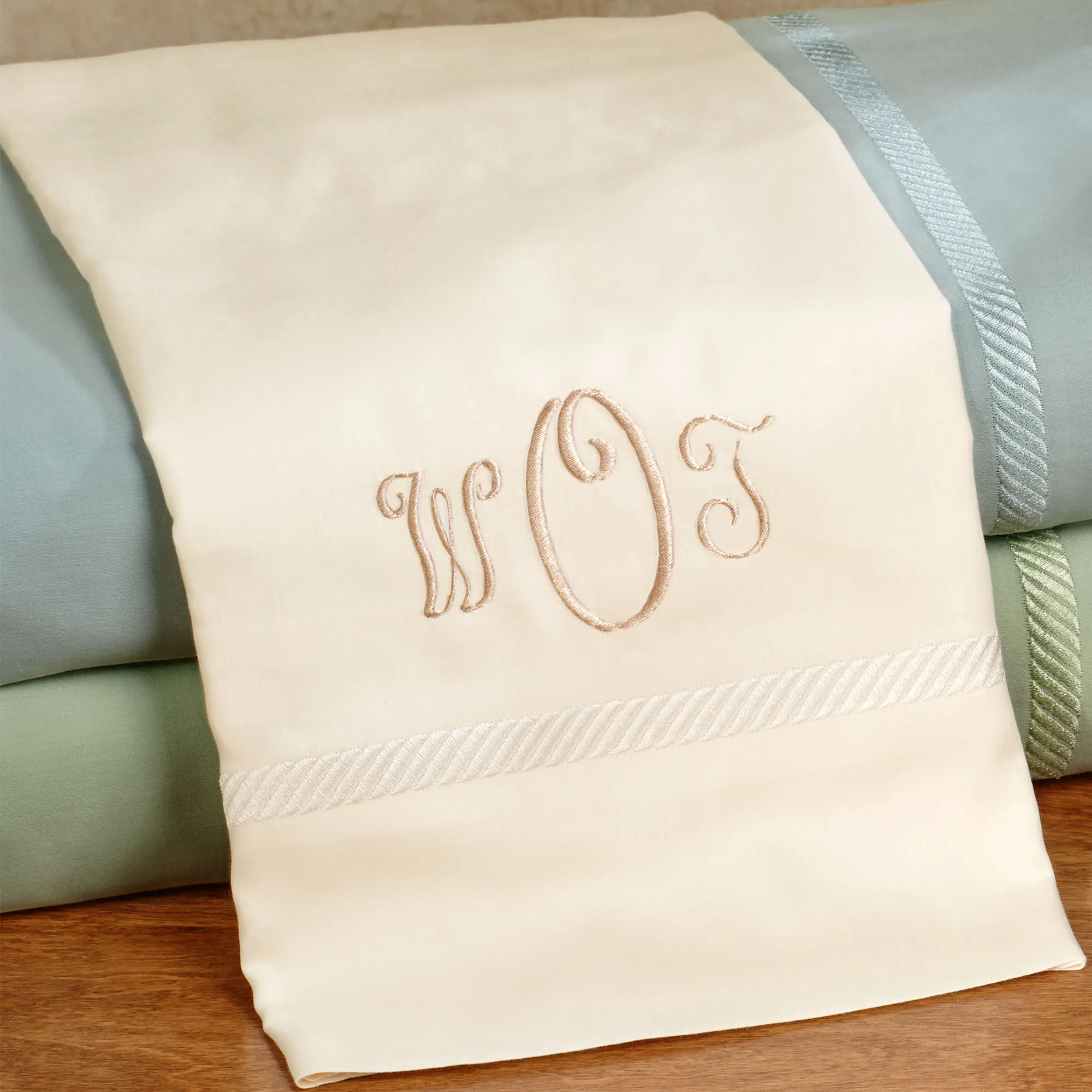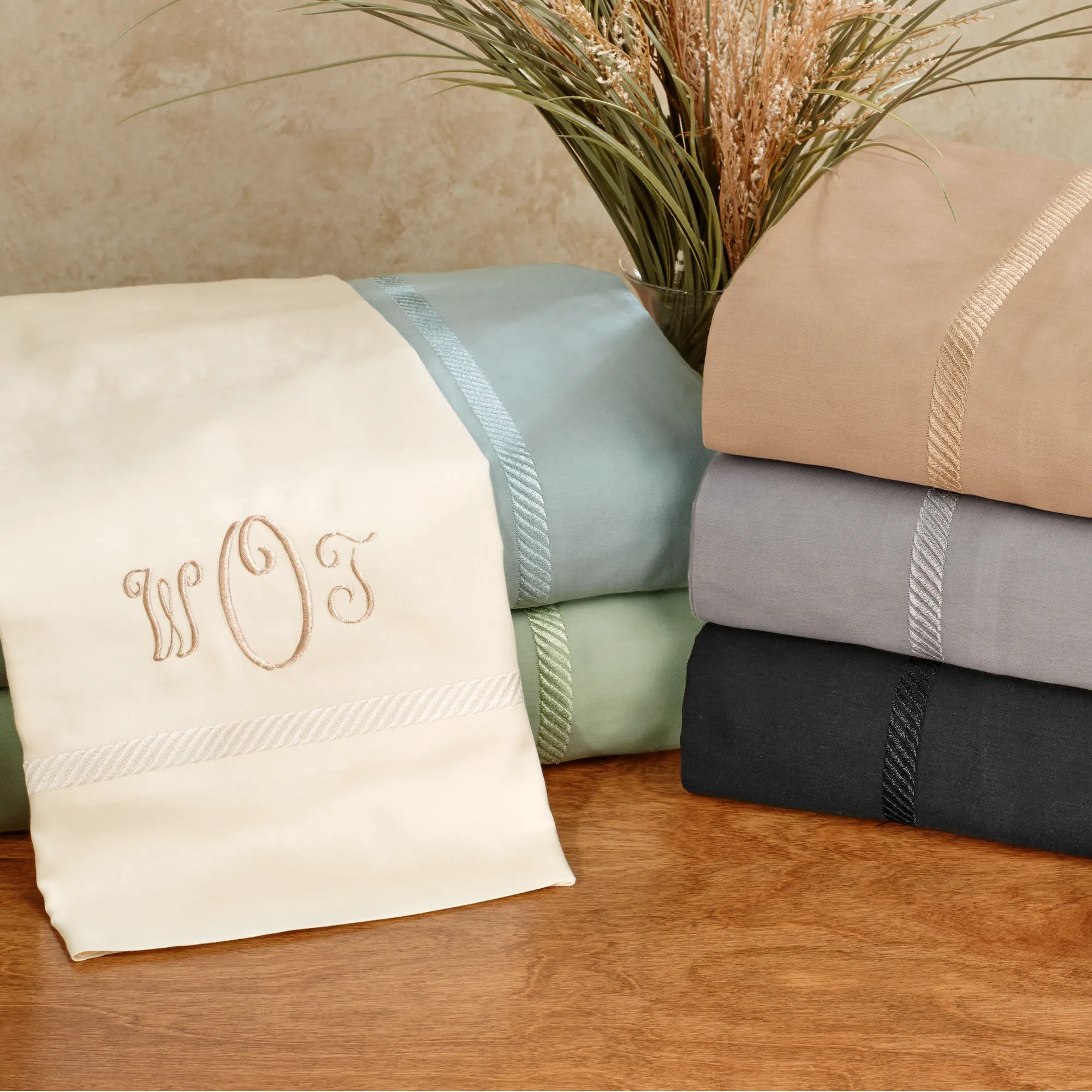 The Verona Braid Sheets are made from sateen woven cotton. Imported.