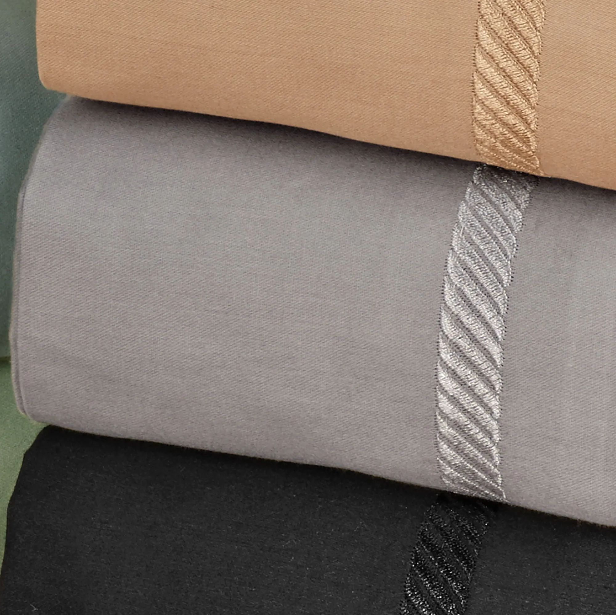 Relax in the luxury provided by the Verona Braid Sheet Set. Made of pure cotton, the sheets have a sateen weave of 300 threads per square inch. The 4" hem of the flat sheet and pillowcase(s) features a unique color-match embroidered braid design that gives off a slight sheen. The fitted sheet contains all-around elastic to stay fitted to mattresses up to 17" deep. Sheet set includes flat sheet, fitted sheet, and pillowcase(s) (king size in King and Cal King sets). Machine washable. Imported.