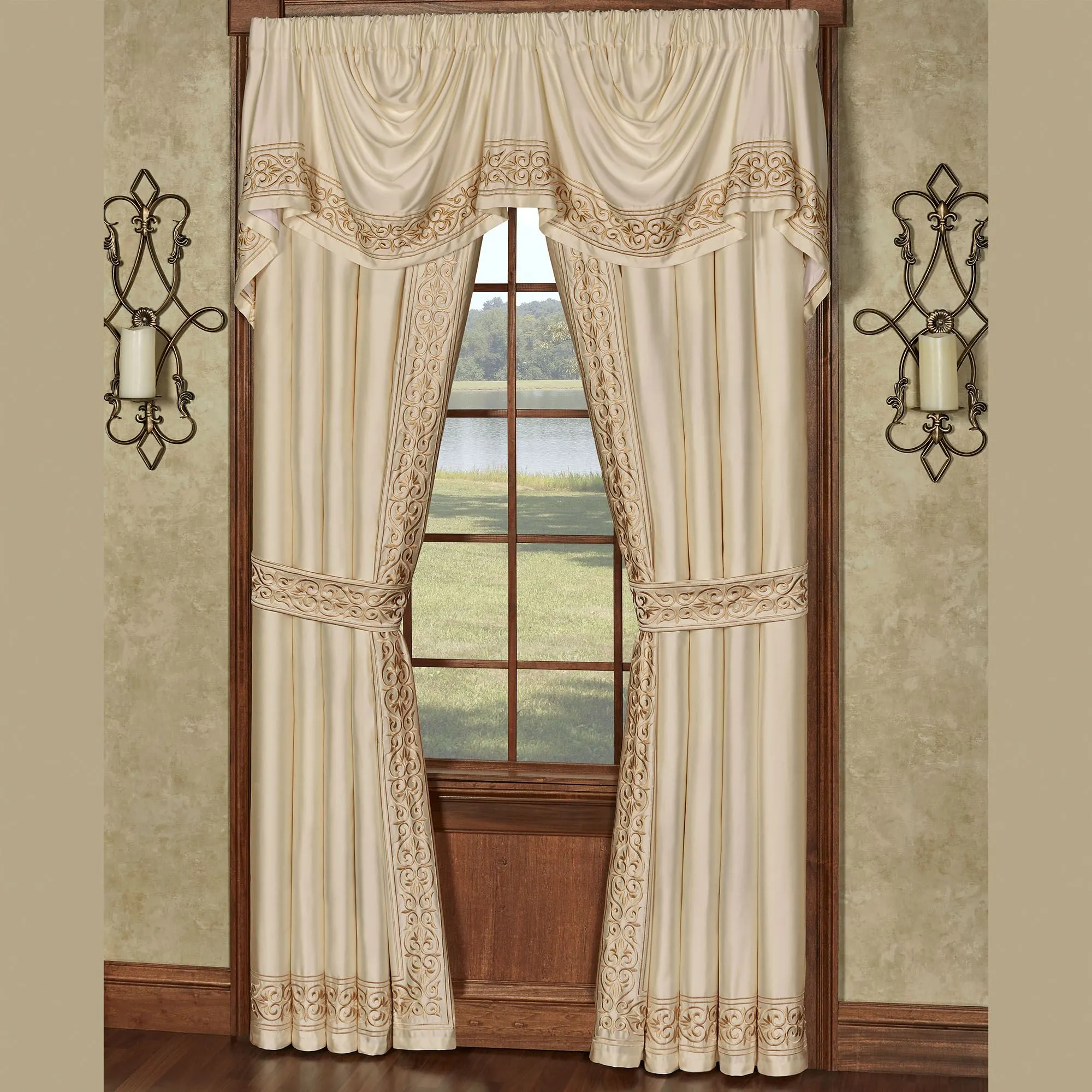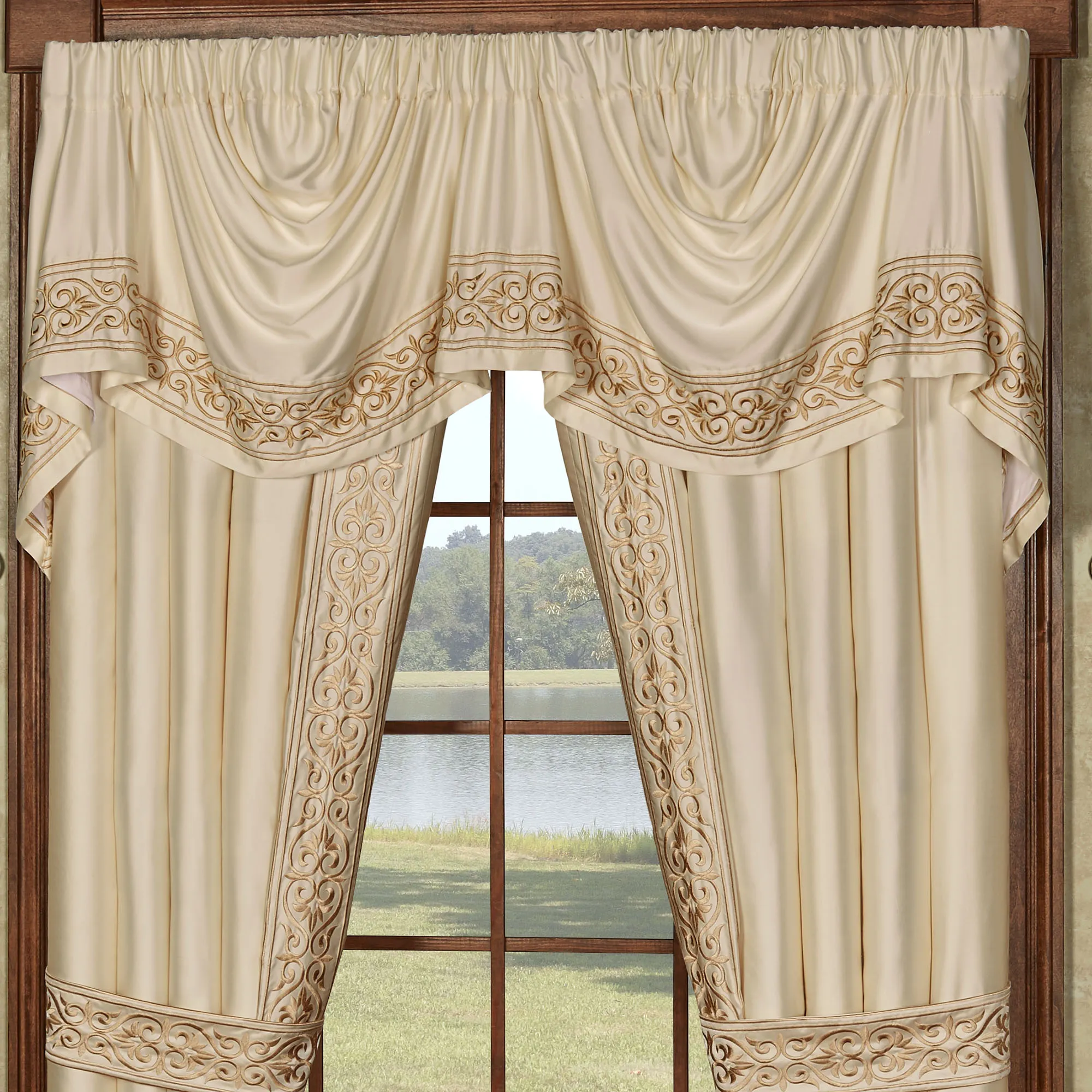 Make your room feel like an exquisite palace. In beautiful polyester sateen, the pearl Versailles Window Treatment features grandly embroidered golden scrollwork framing for elegant definition. Lined window treatment has tailored framed bottom edges and 3" rod pockets. Specify Empire Valance or Curtain Pair. The Curtain Pair also has embroidered framing on the inside edges and includes tiebacks. For best results, dry clean. Imported. The curtain pair width is the total width of two panels together.