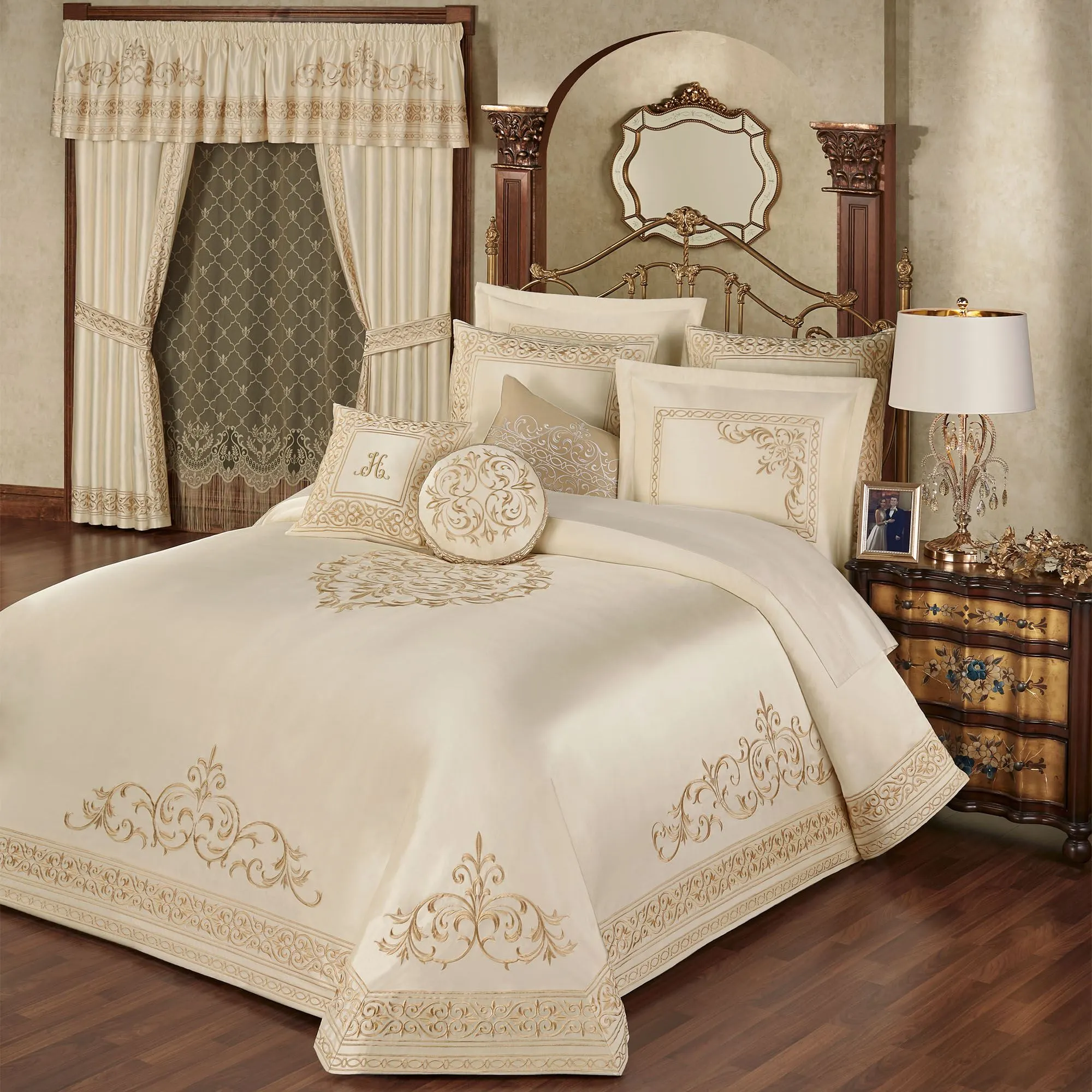 Transform your boudoir into that of an exquisite palace. In beautiful polyester sateen, the pearl Versailles ensemble features grandly embroidered golden scrollwork medallions, swags, and framing for elegant definition.