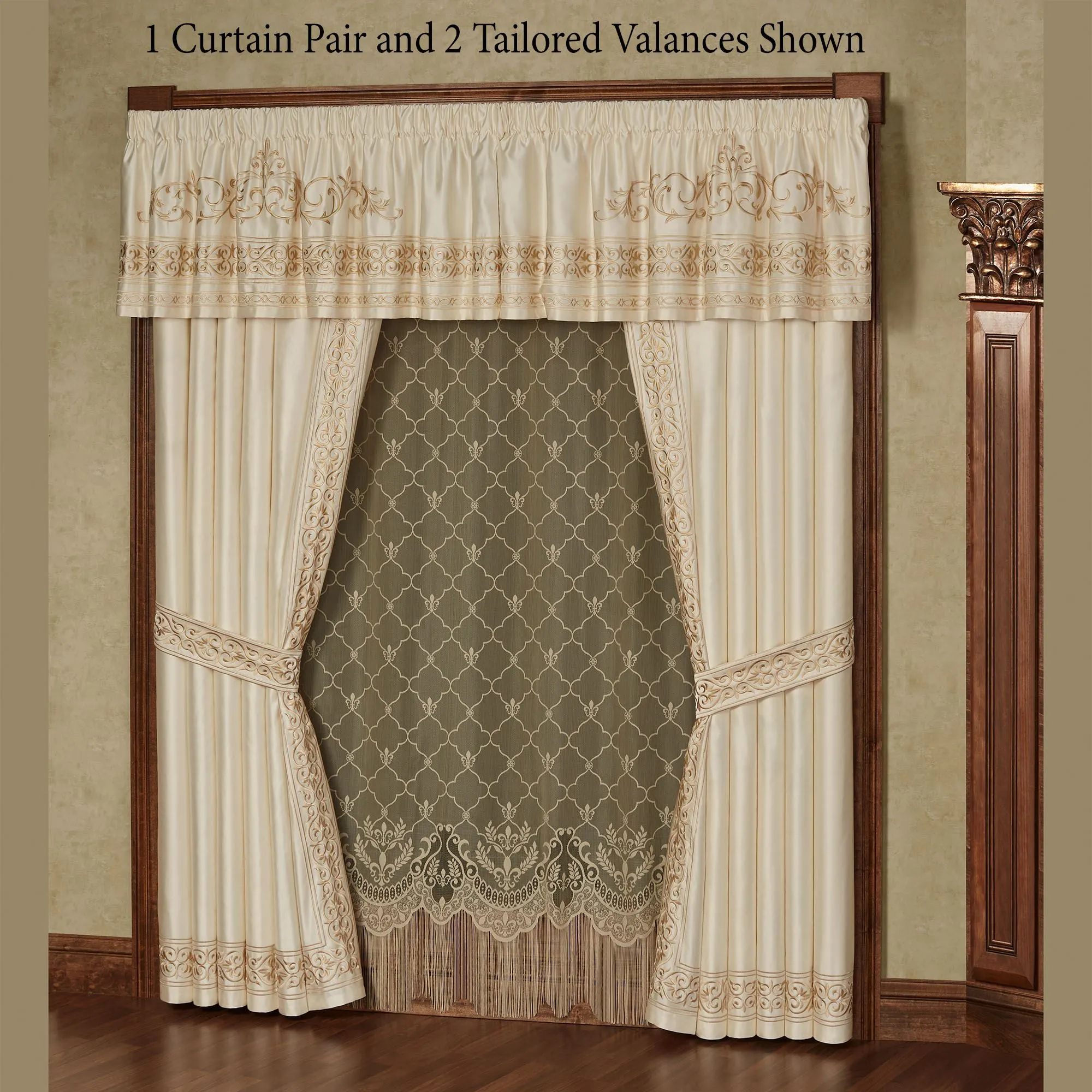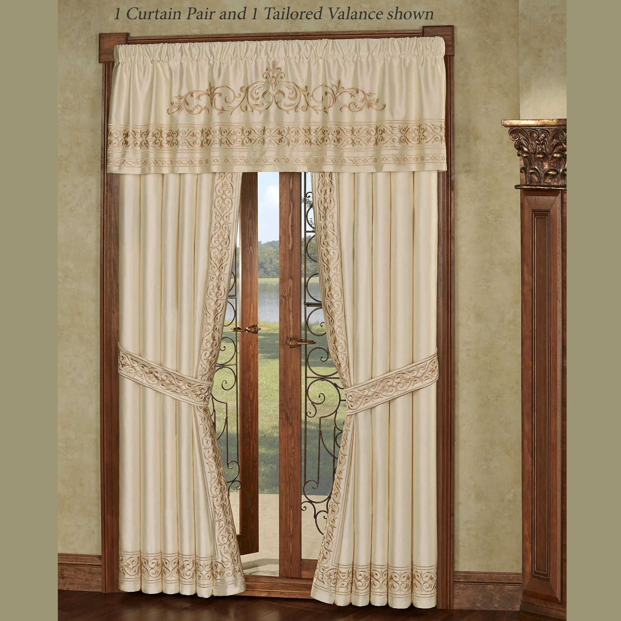 Lined Window Treatments have tailored framed bottom edges and 3" rod pockets. Curtain Pair also has framing on the inside edges and includes tiebacks. Curtains are available in two lengths. Each Ascot Valance has a swag accent. Tailored Valance has a swag accent. Empire Valance is also available.