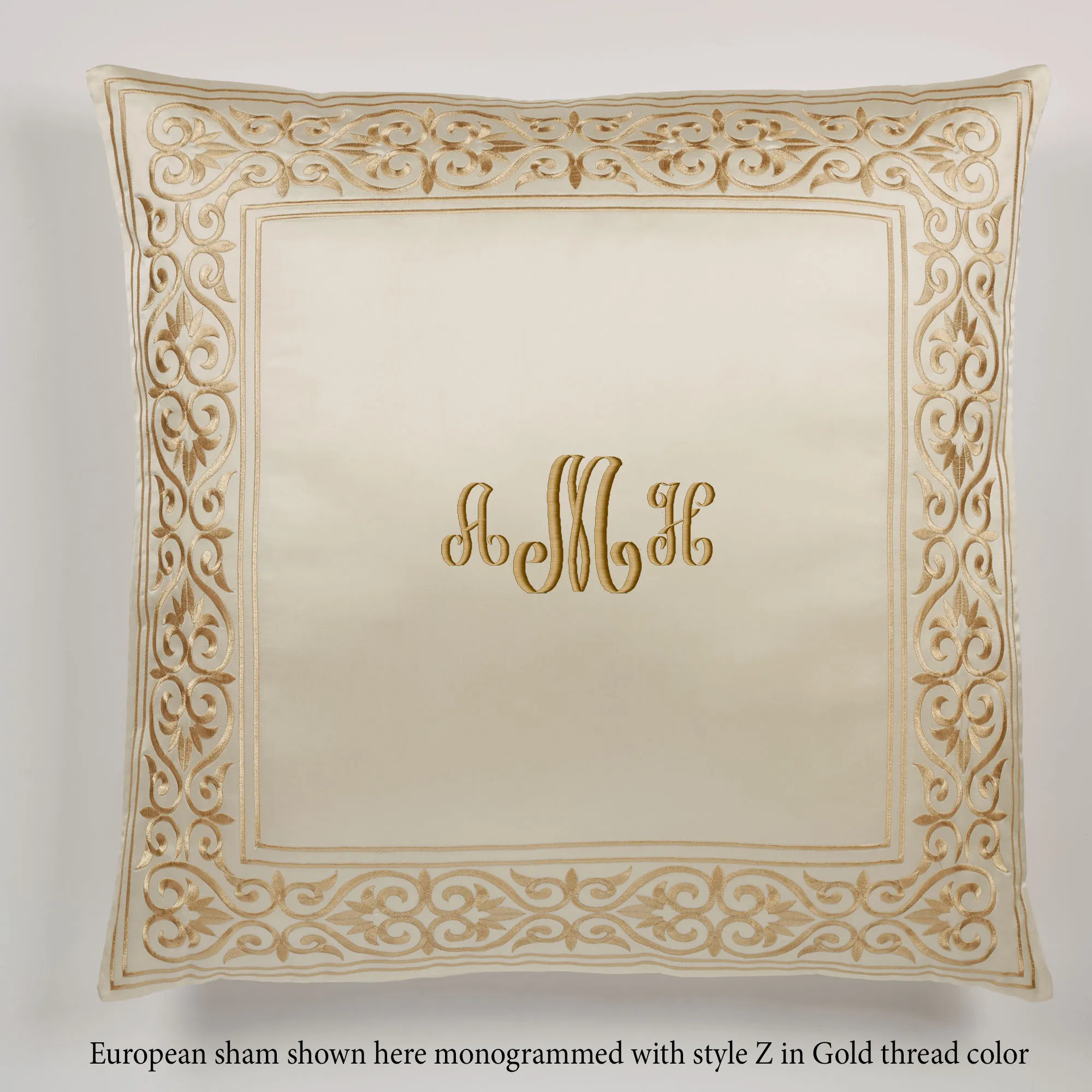Tailored European Sham has a frame; French back closure. European sham may be monogrammed for an extra charge. Monogramming is shown in the Gold thread color.