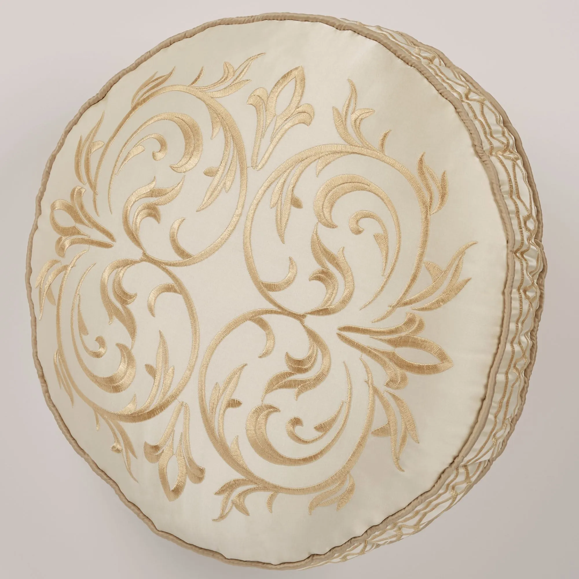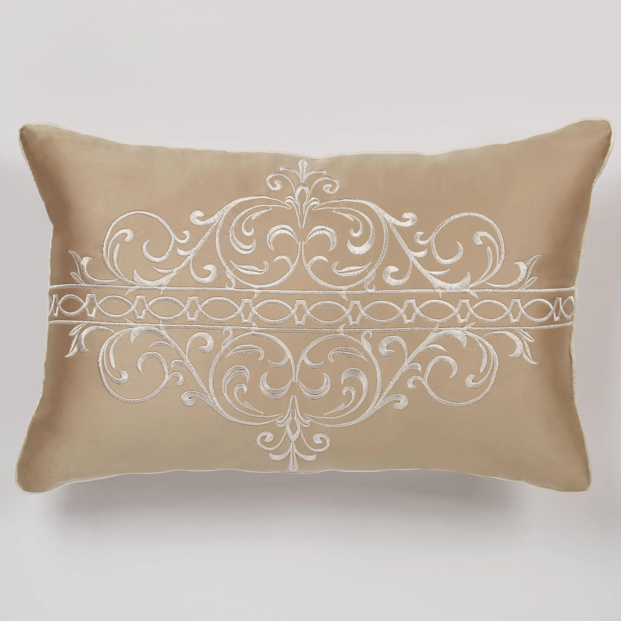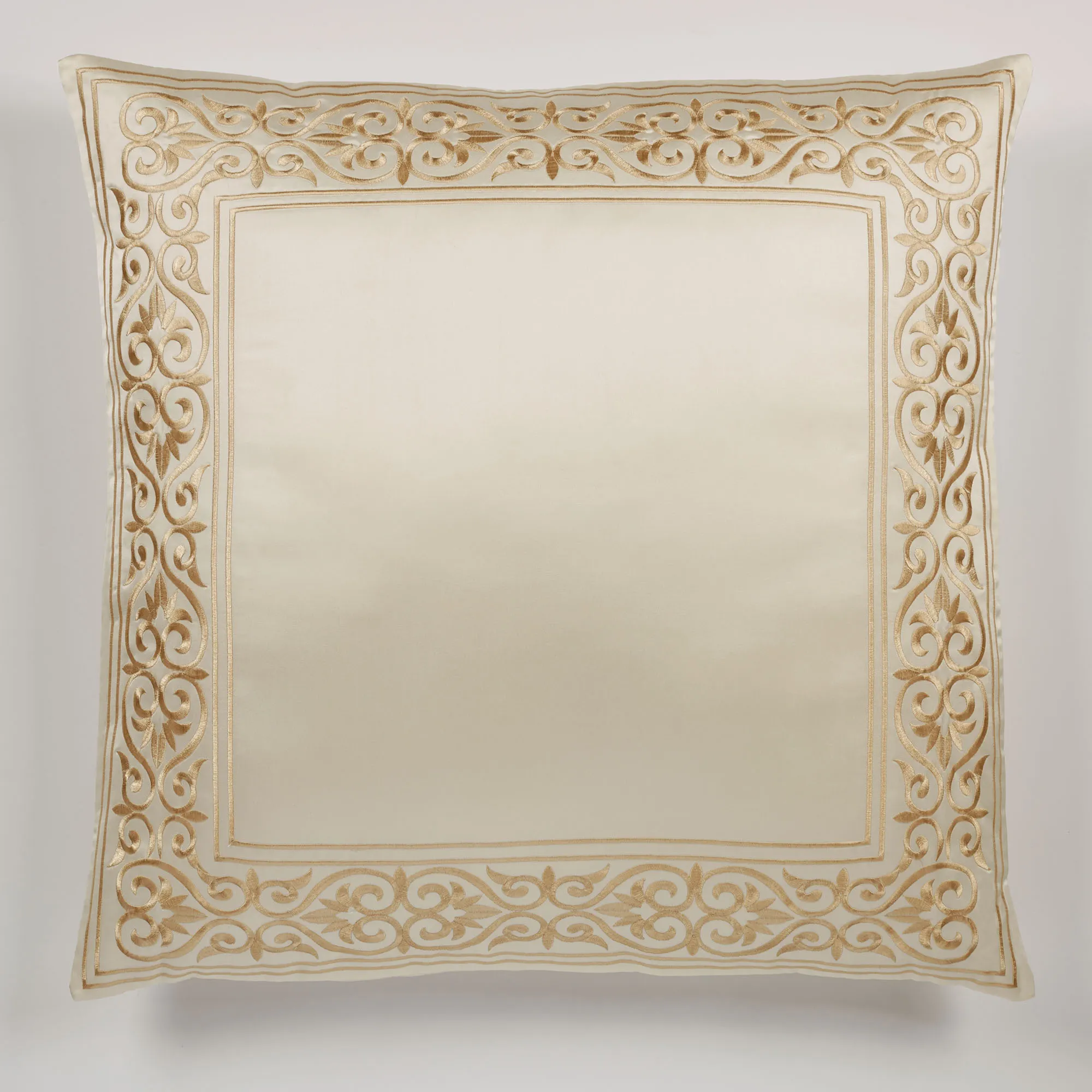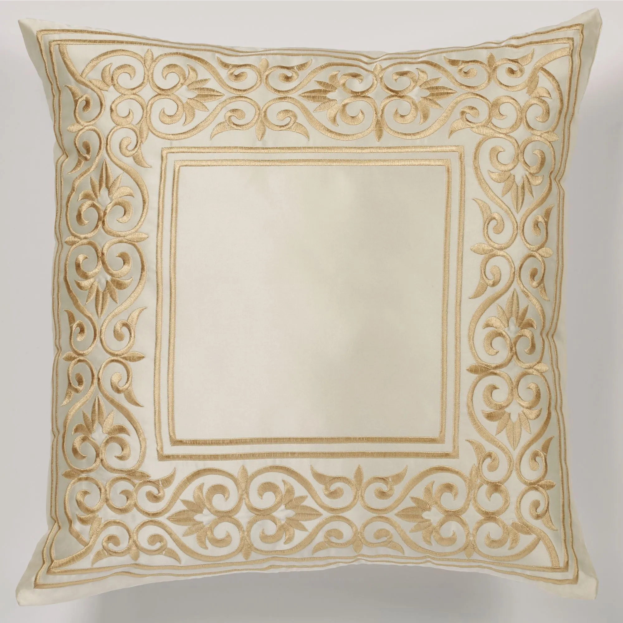 Pillows: Spot clean. Tailored Square has framing; zipper closure. Square pillow may be monogrammed for an extra charge. Monogramming is shown in the Gold thread color. Piped Rectangle is antique gold with a pearl-colored embroidered band. Piped Round has a medallion and a framed 2" side gusset.