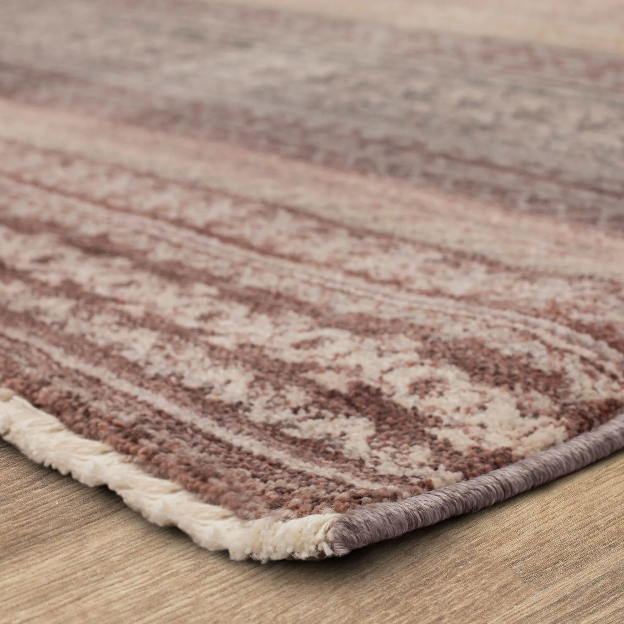 Decorate with the ornate motifs displayed on the Victor Rug. This power-loomed polyester area rug, .32" thick, is ultra-soft and has .5"L length-end fringe. Colors include muted hues of cream, ivory, gold, brown, mauve, and green. Backing is latex. We recommend professional cleaning by a rug cleaner. Imported.