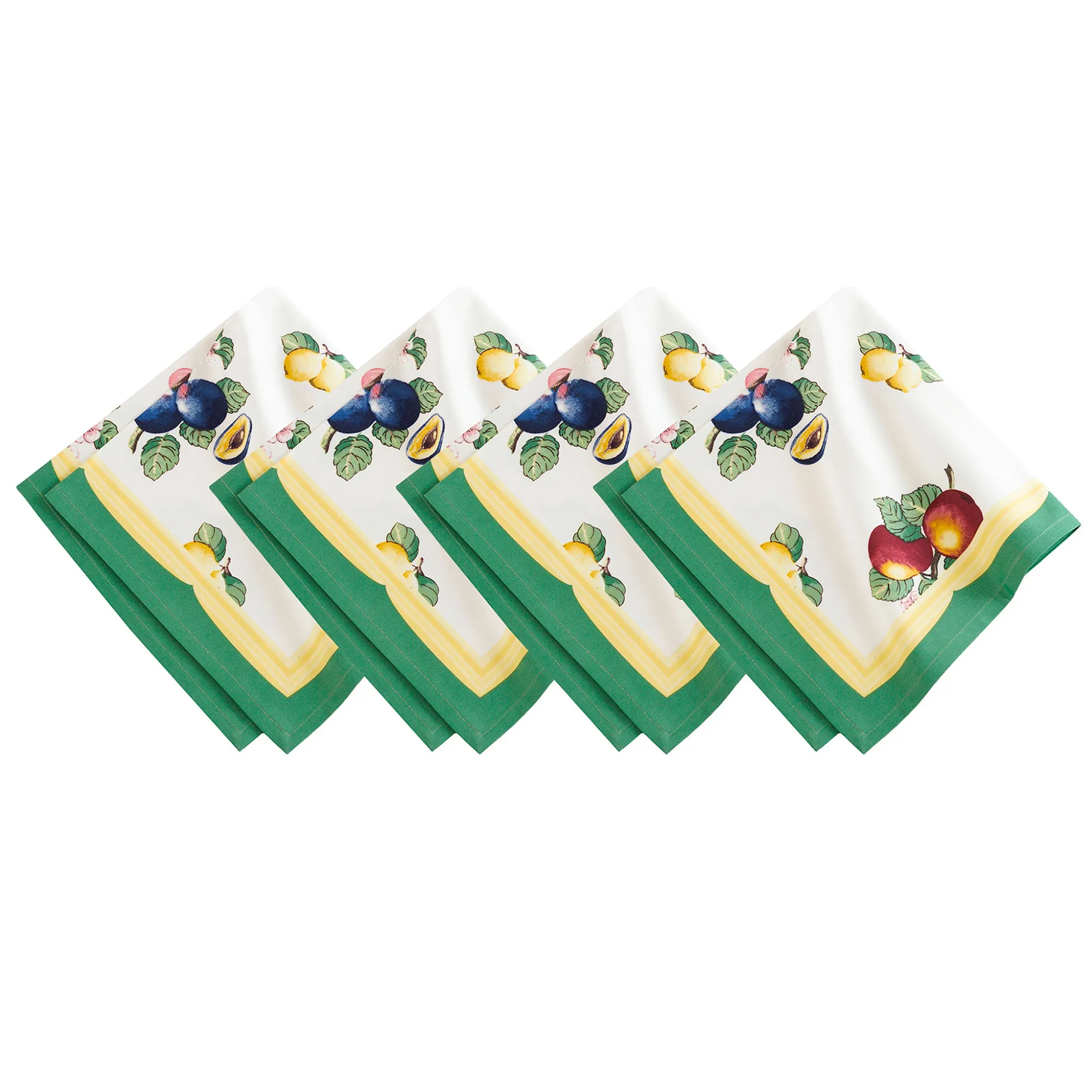 Artful arrangements of various fruits and pretty blooms are displayed on the Villeroy & Boch French Garden Fleurance Table Linens. The polyester table linens have fruit, leaves, and floral motifs on a crisp white background; the Tablecloths also have script. Most items have a yellow and sage green border; the Placemat Set has a yellow center and a sage green border. Linens are stain- and water-resistant and have tailored edges. Placemats are reversible to a vibrant yellow background with a sage border, light green lattice design, and crisp white center. Choose Rectangle Tablecloth, Round Tablecloth, Placemat Set or 4, or Napkin Set of 4. Machine washable. Imported.