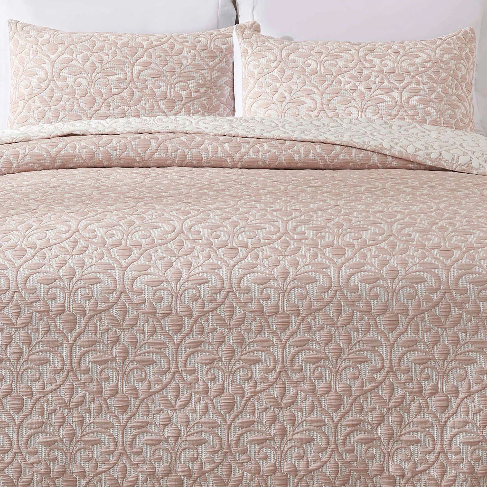 The Coverlet Set includes a coverlet and two shams. The medium-weight coverlet has solid blush scrolling leaves on a textured background and bound ends; reverses to white scrolling leaves on a textured background. Shams mimic the coverlet and have bound ends and French back closures. For coverlet set, choose Queen or King.