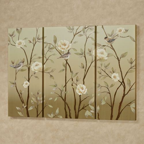 Beautiful birds among flowers and foliage are a Vining Delight. This giclee on canvas wall art triptych set has colored gel accents and shades of sage, green, tan, and light cream on an ombre-style background. Flower centers have gold glitter. Canvases are gallery-wrapped over wood frames. Sides are 15"Wx2"Dx36"H; center is 21"Wx2"Dx36"H.